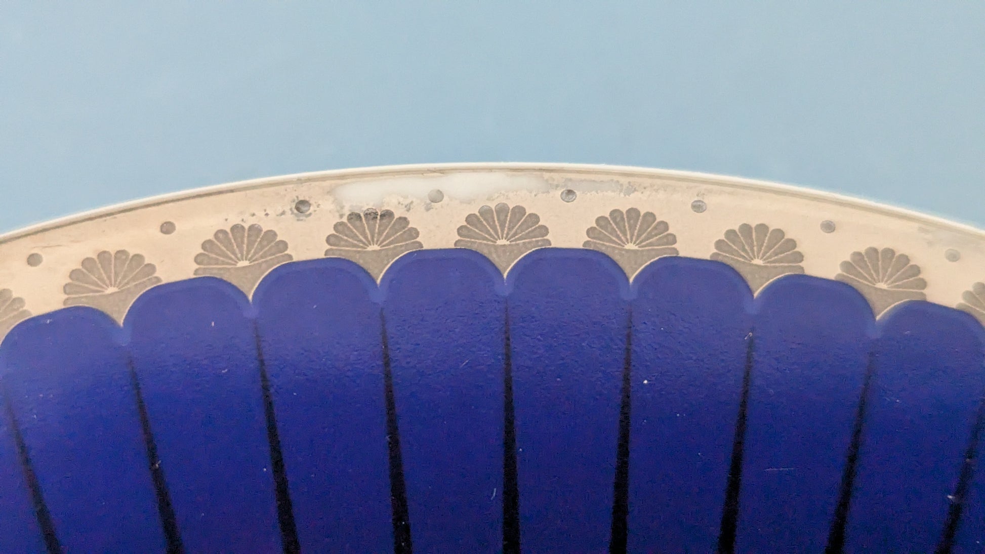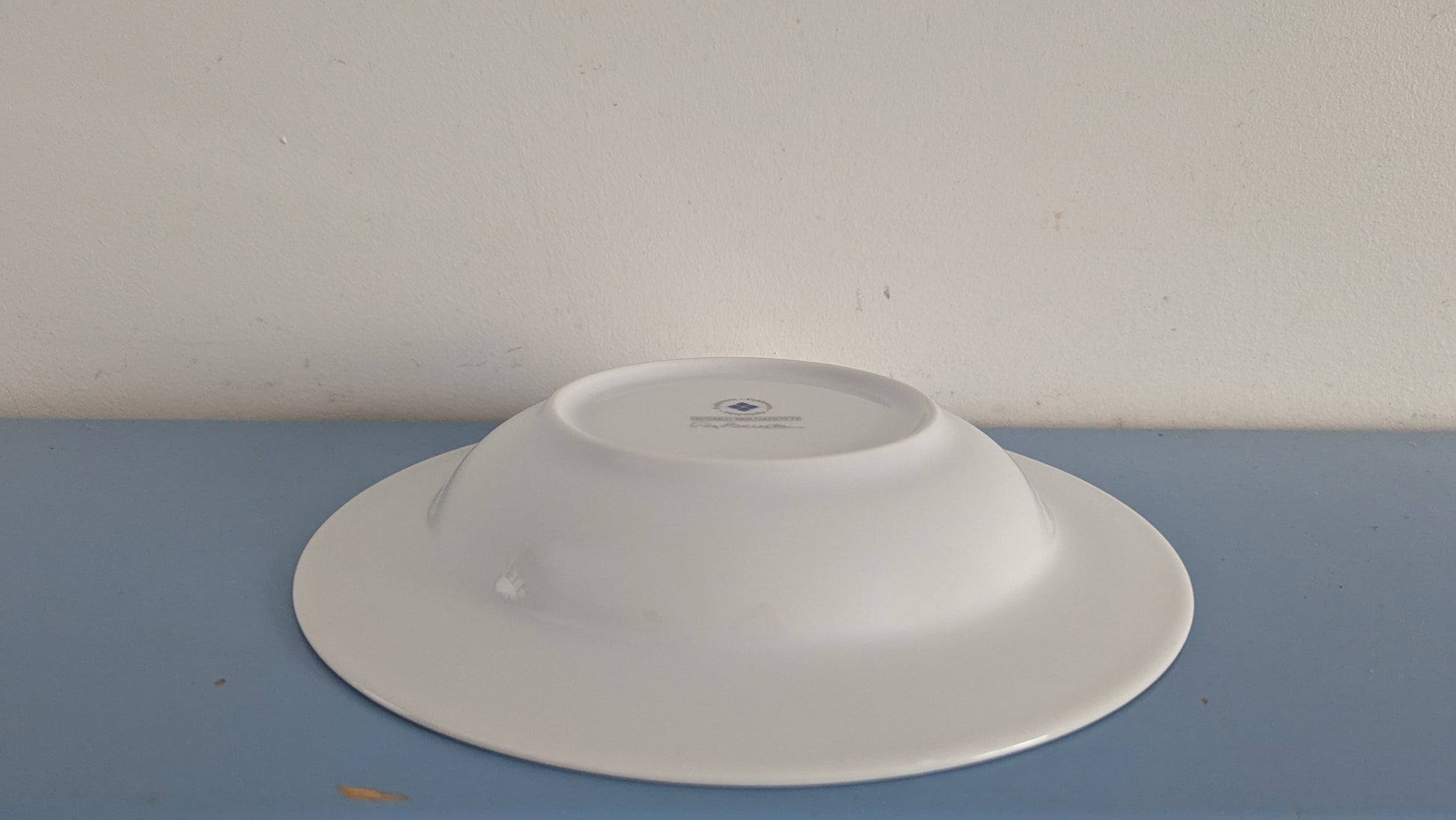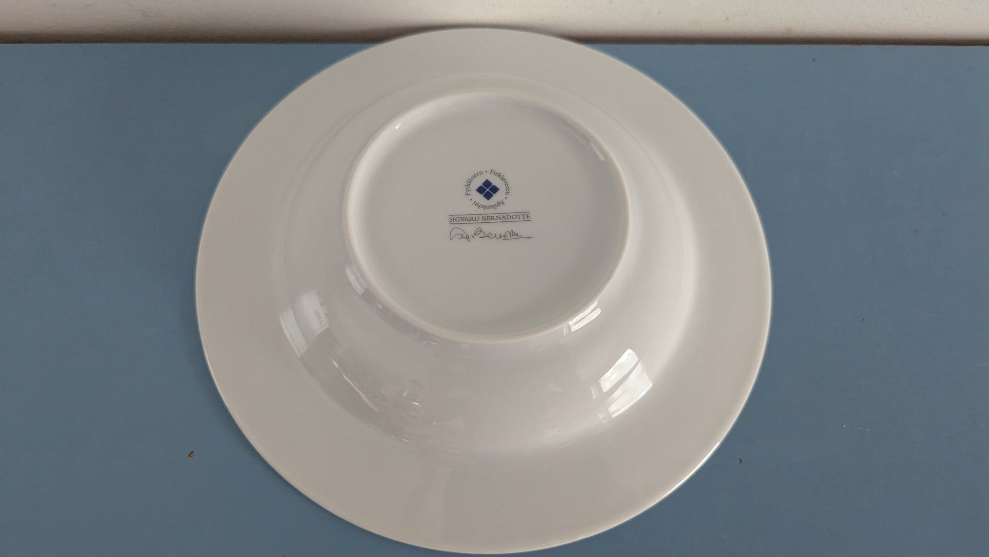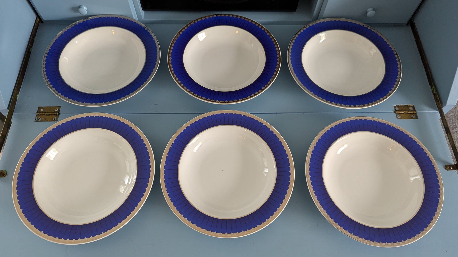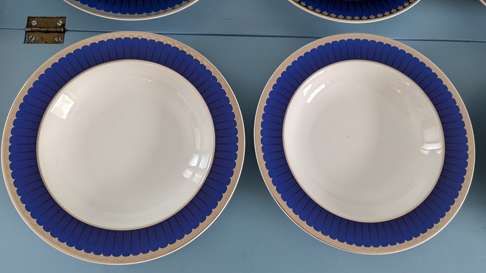 Yhden lautasen reunakoristeessa viimeisen kuvan mukaista kulumaa. Muuten ei iskemiä, halkeamia tai naarmuja. Vaikuttavat käyttämättömiltä.