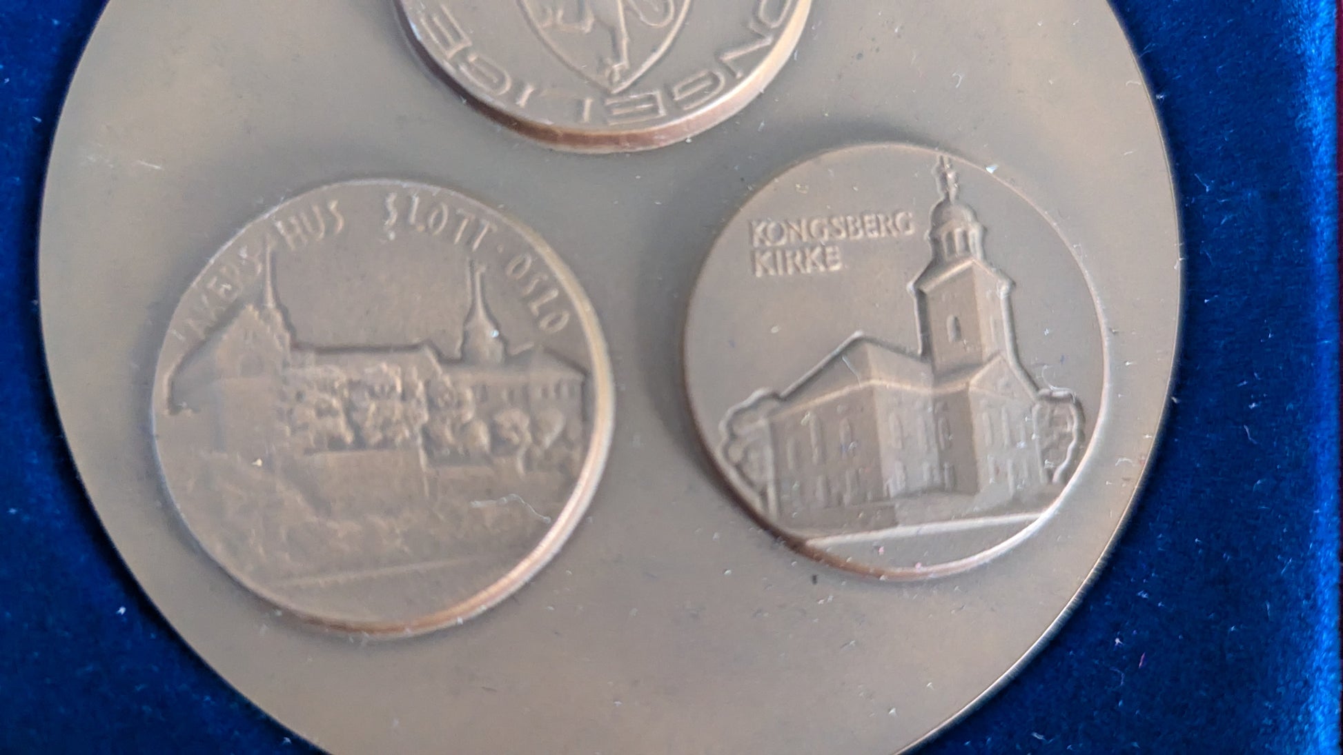 Etupuolella kolme kuvaa jotka ovat Kuninkaallisen rahapajan vaakuna, Akershusin linna, Oslo ja Kongsbergin kirkko
