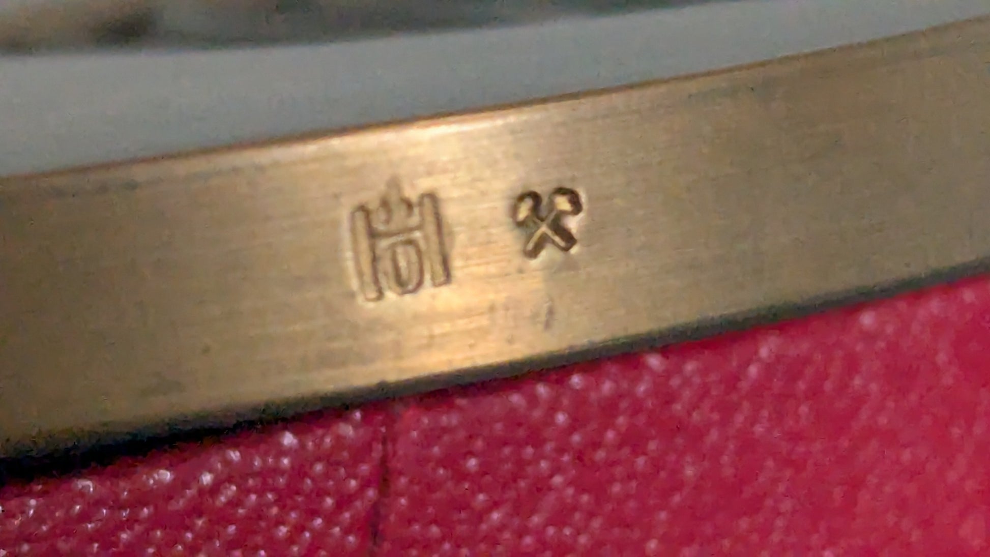Lappeella ristissä olevien vasaroiden kuva joka on Kongsbergin rahapajan perinteinen tunnus. Lisäksi toinen merkintä josta ei löydy infoa. Onko suunnittelijan puumerkki?