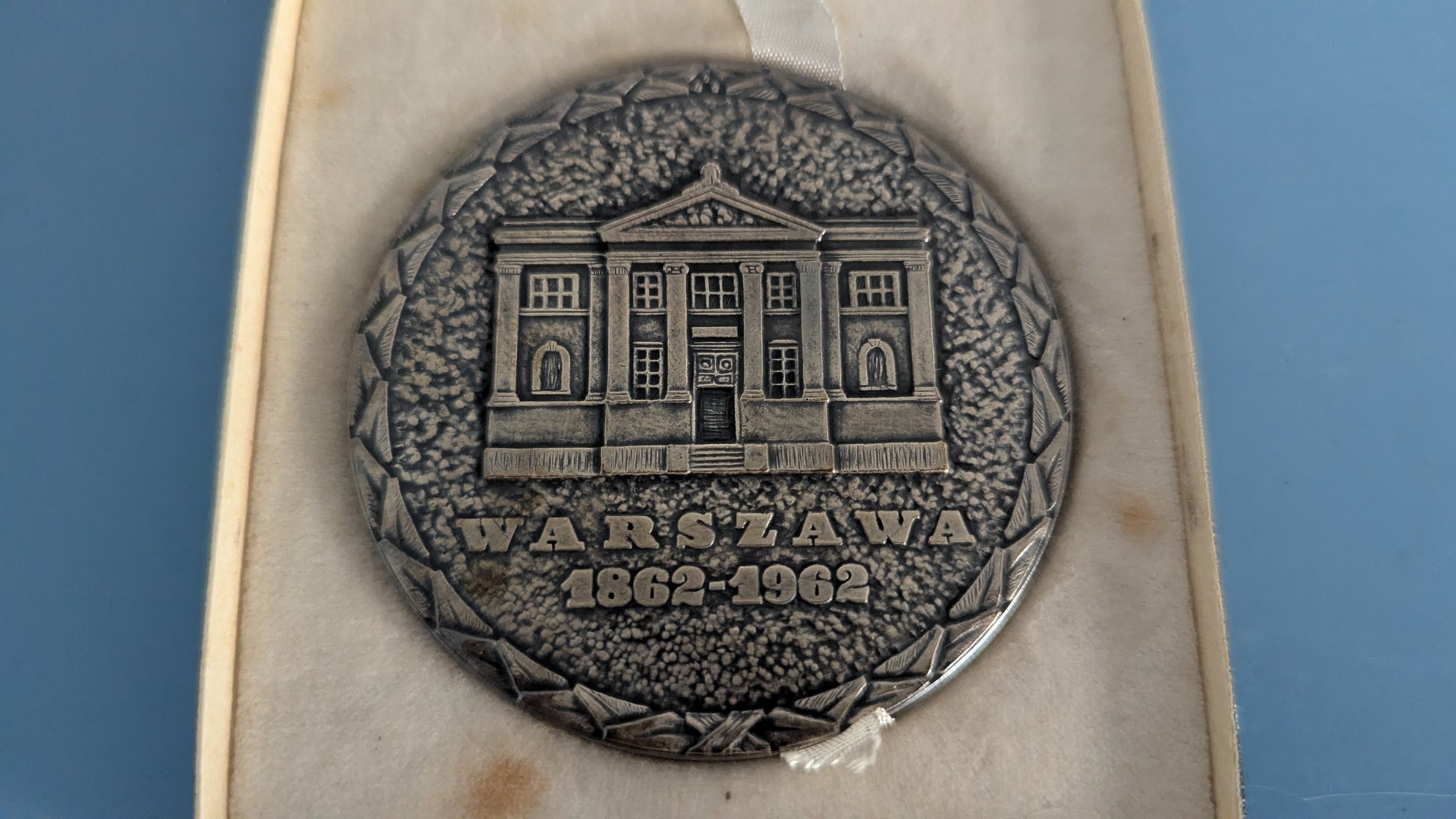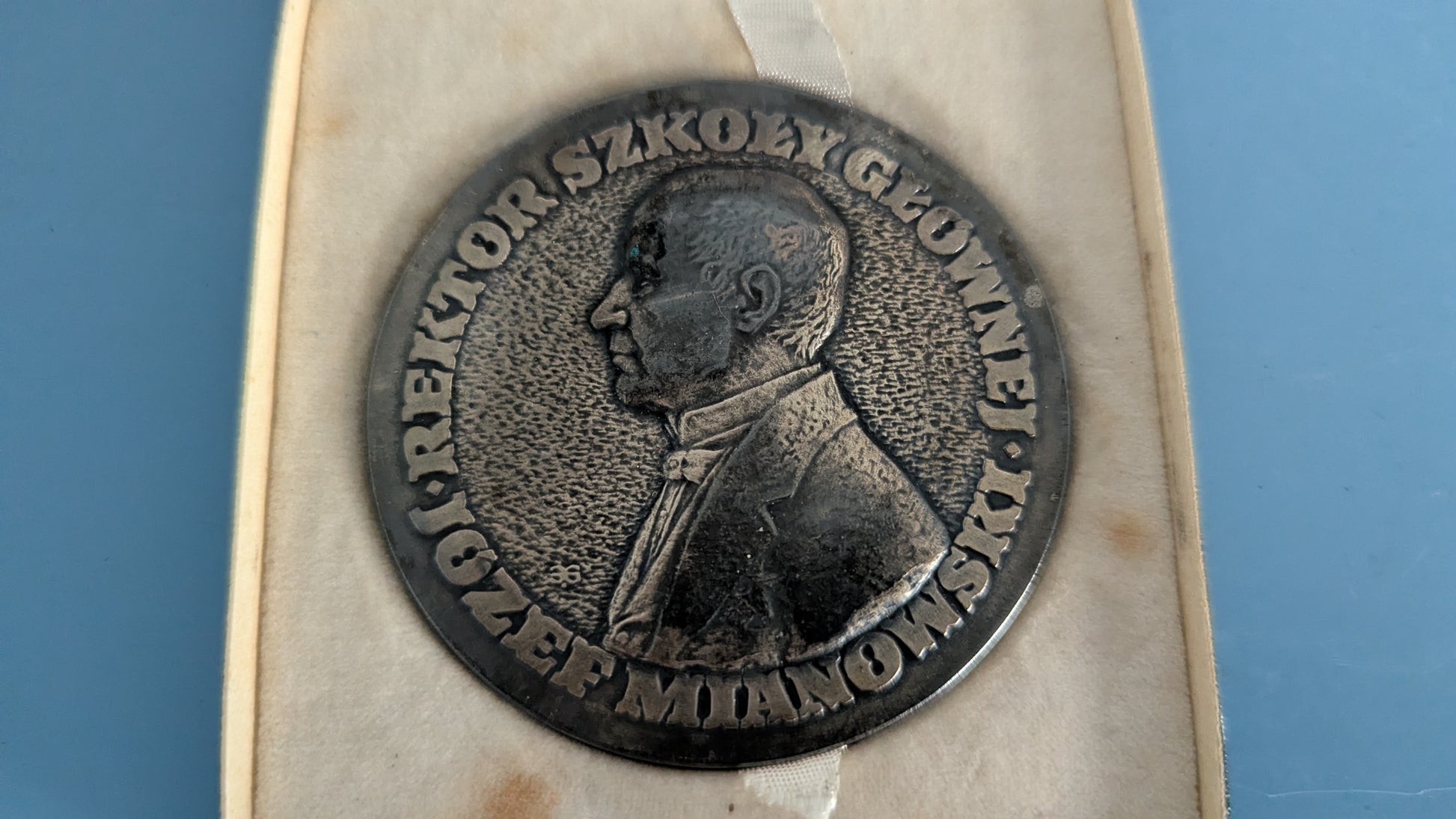 Etupuolella teksti Rektor Szkoły Głównej Józef Mianowski eli Varsovan pääkorkeakoulun rehtori Józef Mianowski. Lisäksi Józef Mianowskin kuva sekä Edward Gorolin signeeraus. Toisella puolella kuva pääkorkeakoulusta sekä teksti Warszawa 1862-1962.