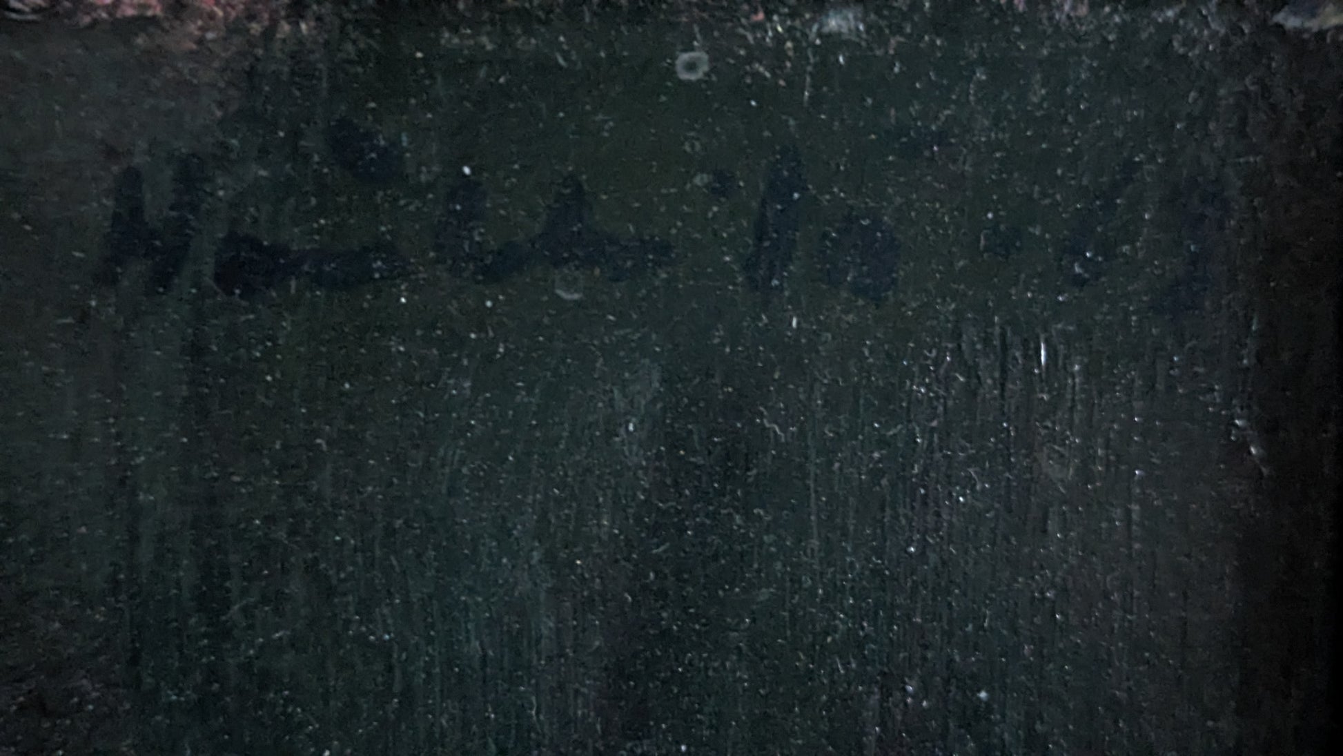 Erkki Heikkilän signeeraama Tummat Vaeltajat niminen öljyvärityö levylle. Signeeraus löytyy sekä oikeasta yläkulmasta että takaa.