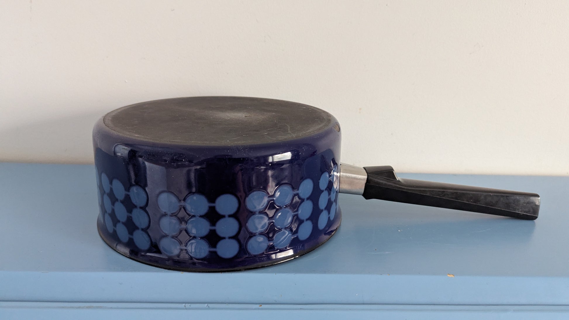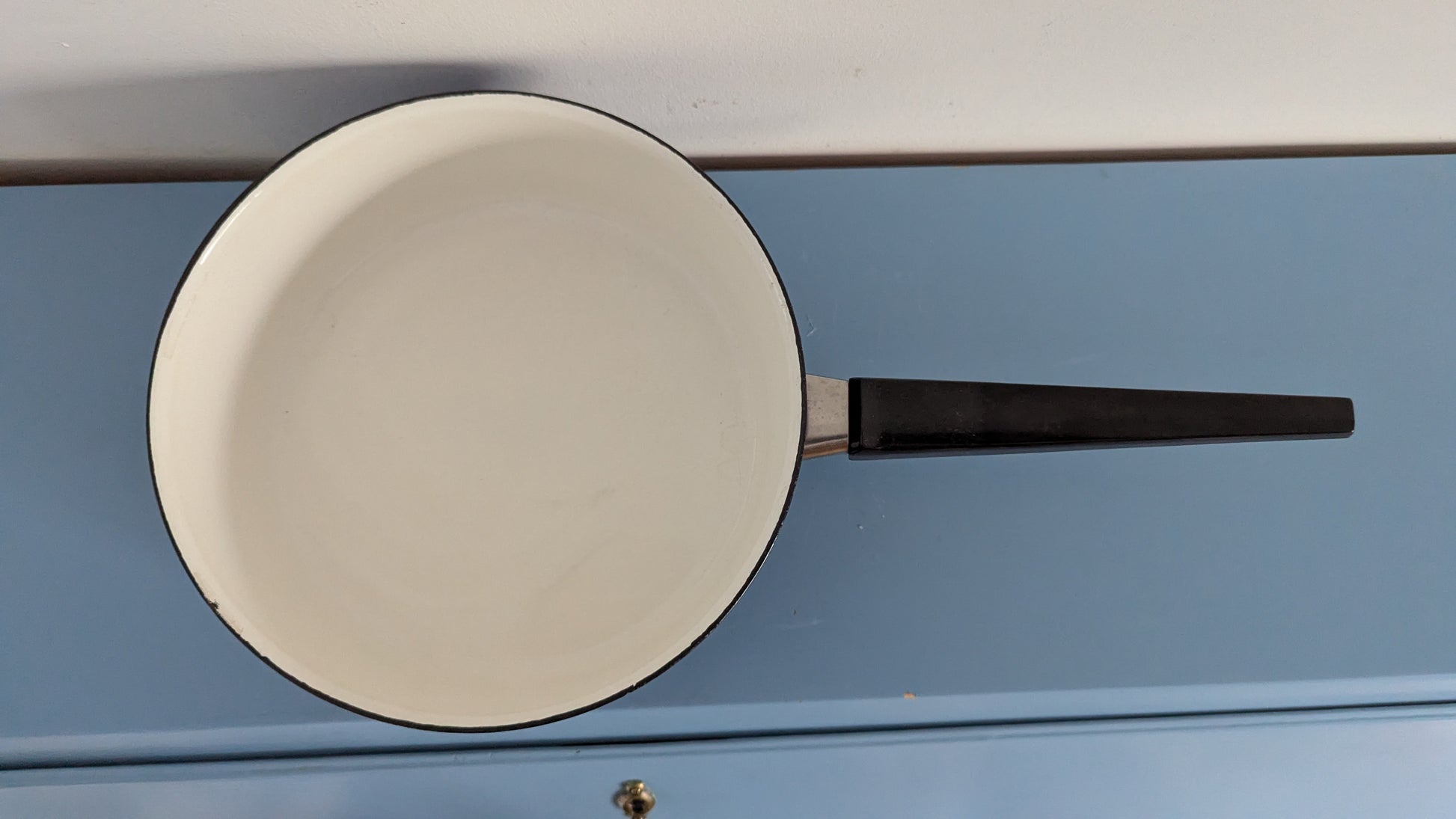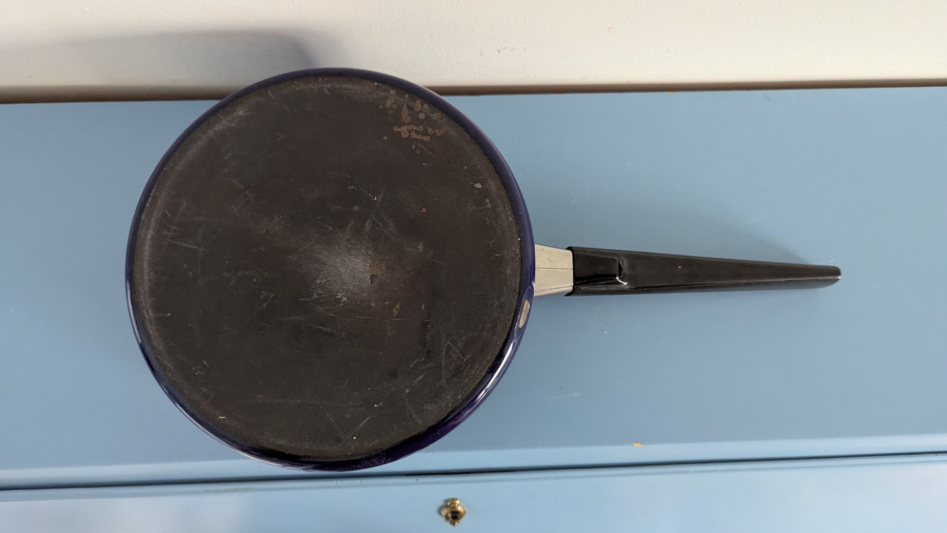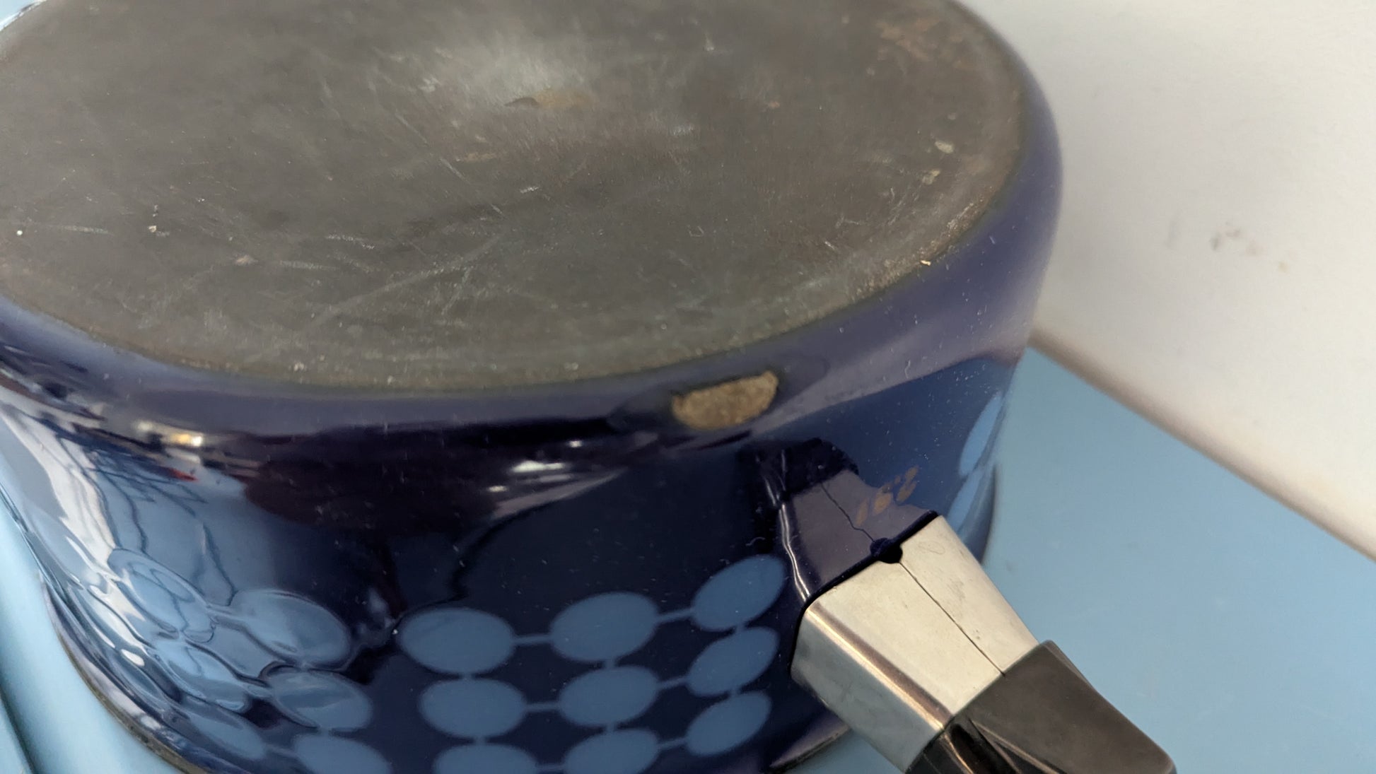 Pohjalla vähäistä käytönjälkeä. Sisäpuolella ei emalivaurioita. Ulkopuolella alhaalla pohjan tuntumassa yksi emalivaurio, mikä näkyy viimeisessä kuvassa. Ei onneksi vaikuta käyttöön.