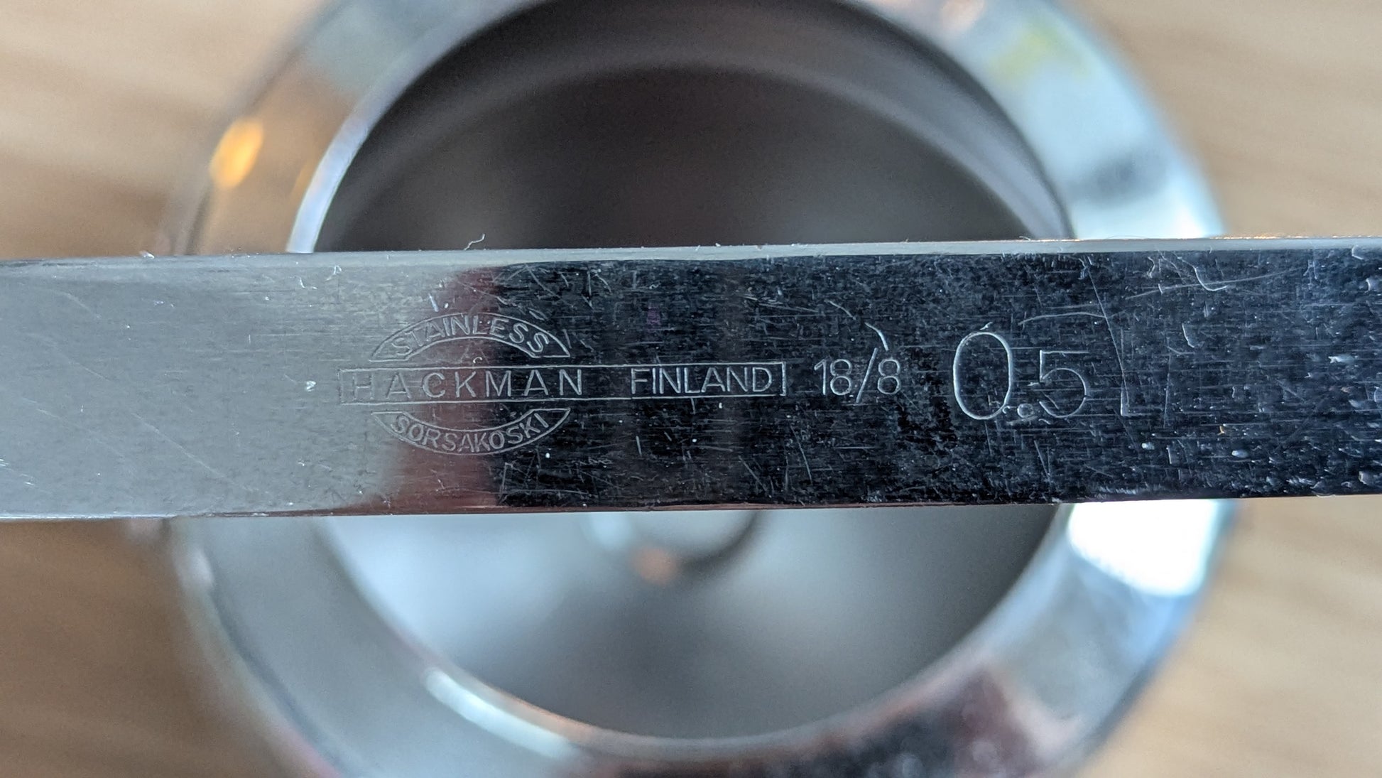 Kahvassa Hackman Sorsakoski logo, pannun tilavuus eli 0.5L ja merkintä 18/8