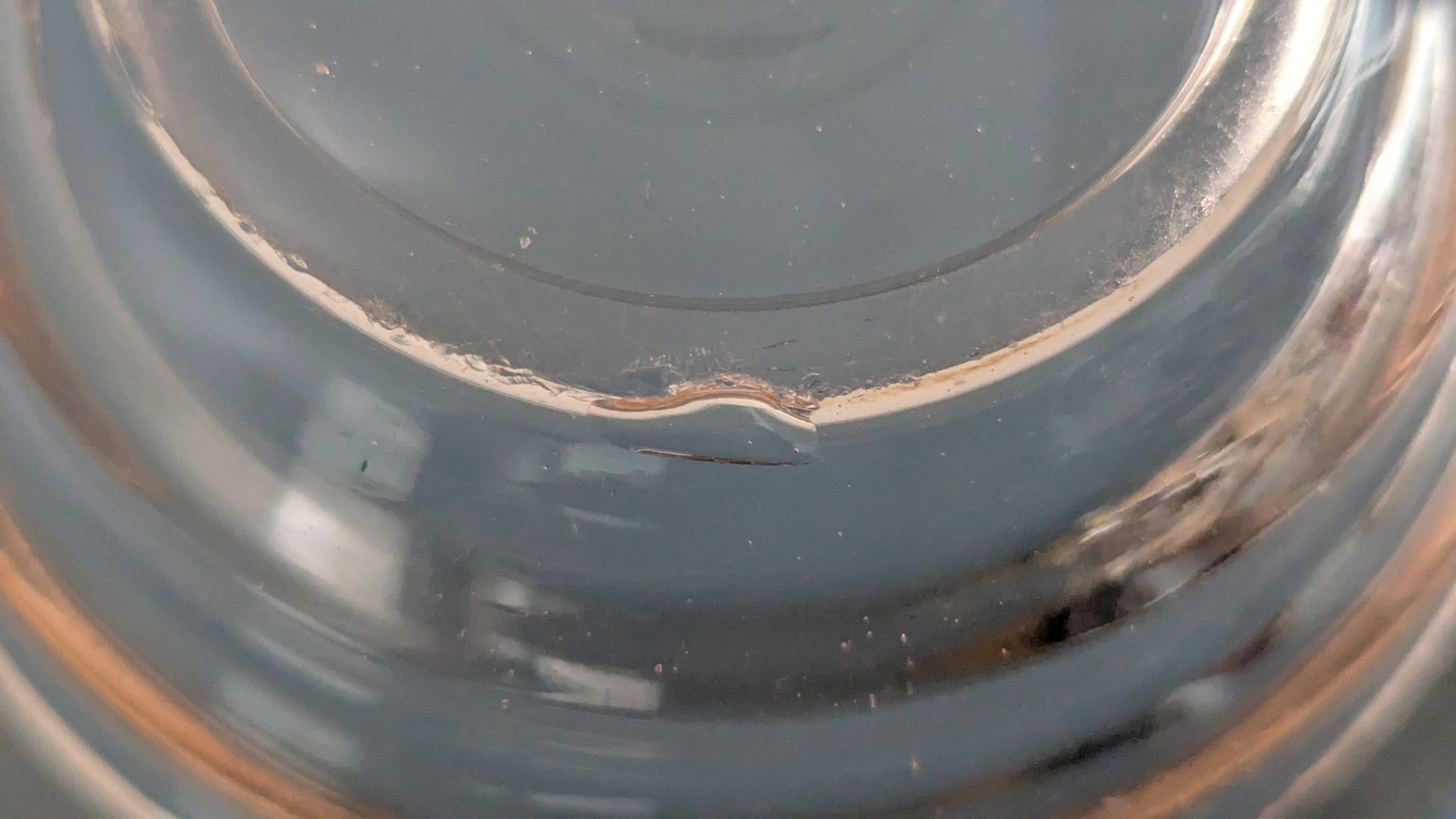 Ei halkeamia. Pohjaympyrässä viimeisen kuvan mukainen iskemä ja pari pientä. Jonkin verran käyttökulumaa.