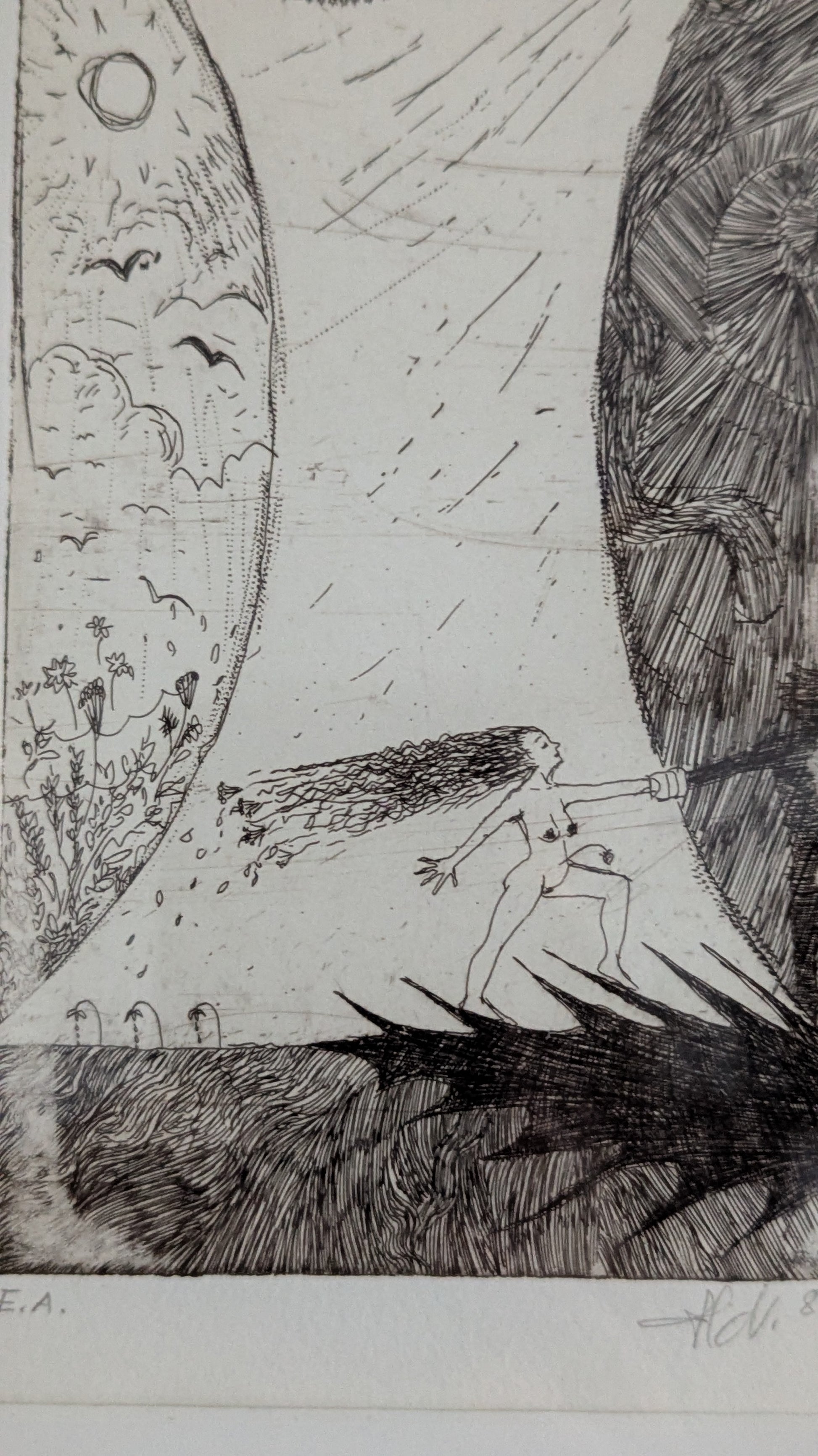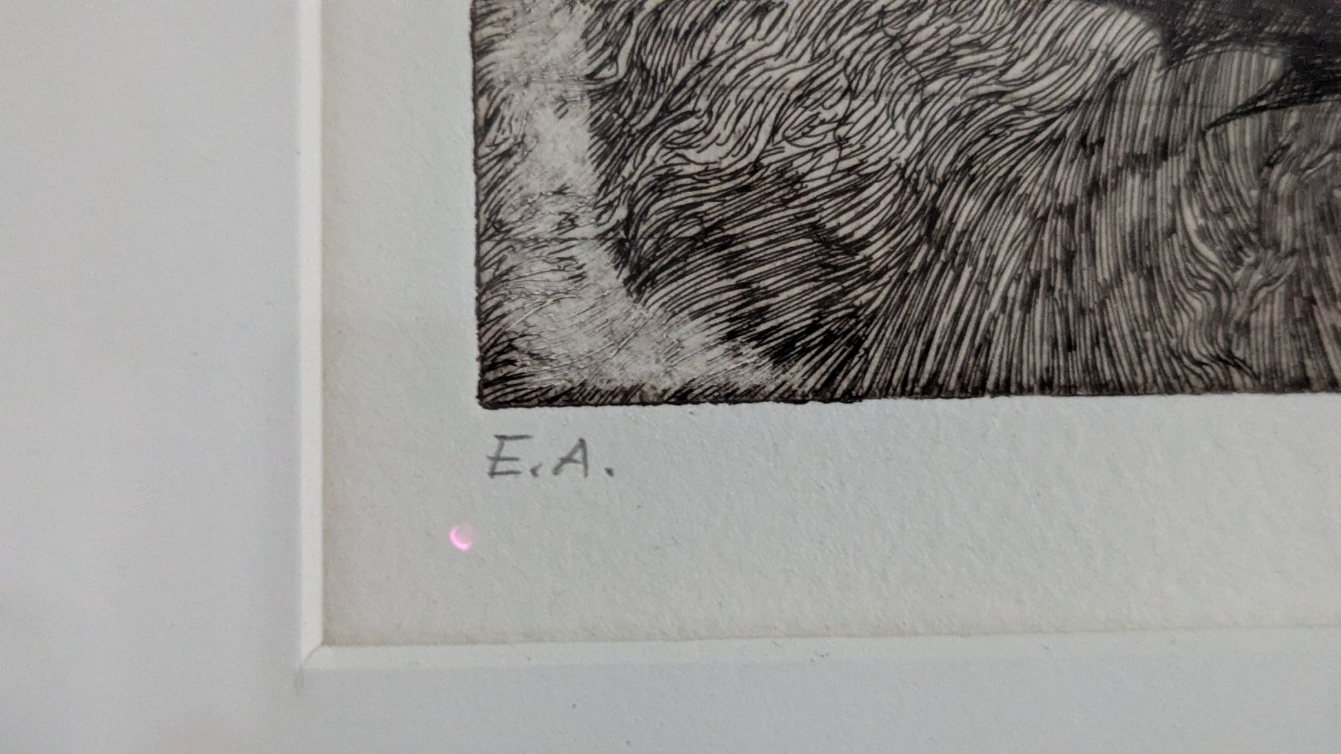 Teoksen alla merkintä EA, joka tarkoittaa ns. taiteilijasarjan vedosta. Taiteilija voi ottaa omaan käyttöönsä pienen sarjan vedoksia. Taiteilijasarja saa olla enintään 10% varsinaisesta vedossarjasta. Lisäksi taiteilijan signeeraus ja vuosiluku -89.