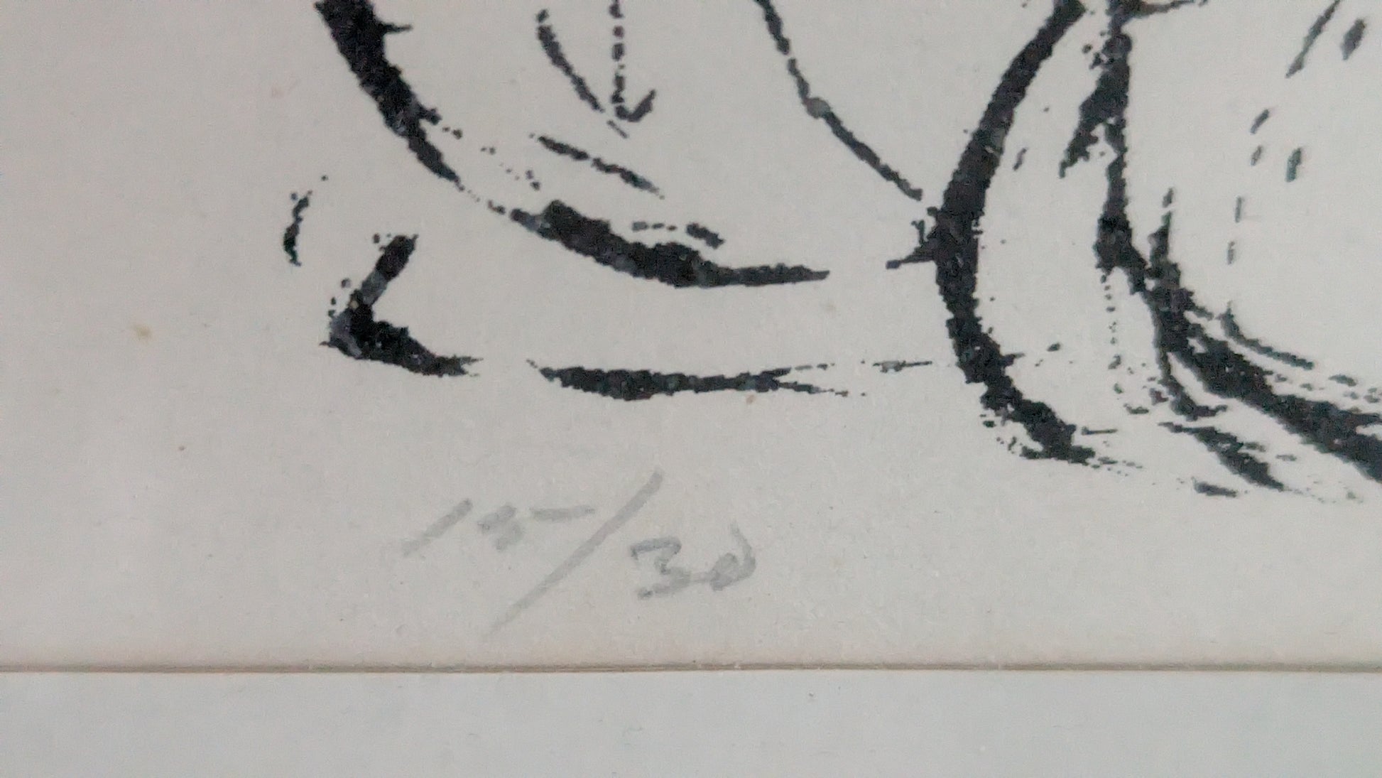 Teoksen alla numerointi 15/30, teoksen nimi, taiteilijan signeeraus ja vuosiluku -62.