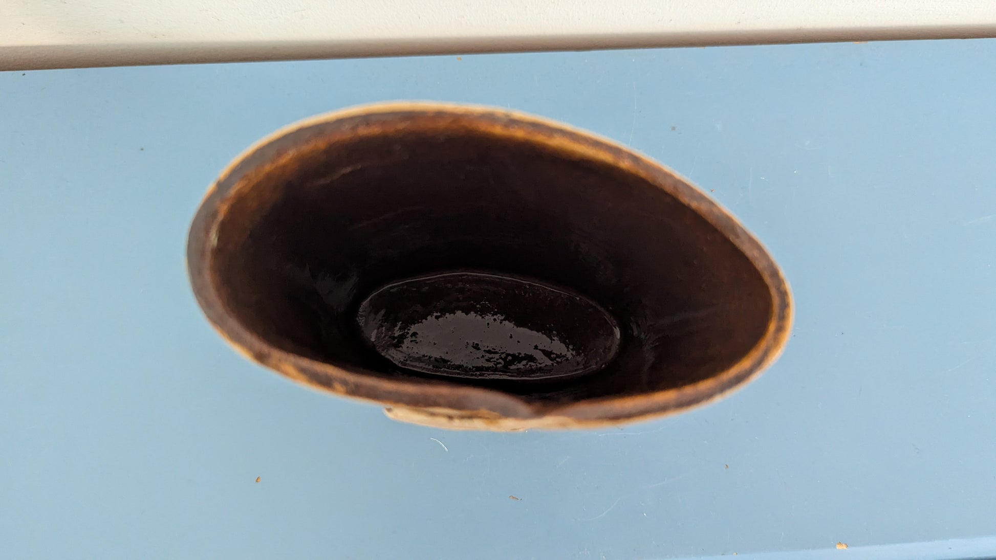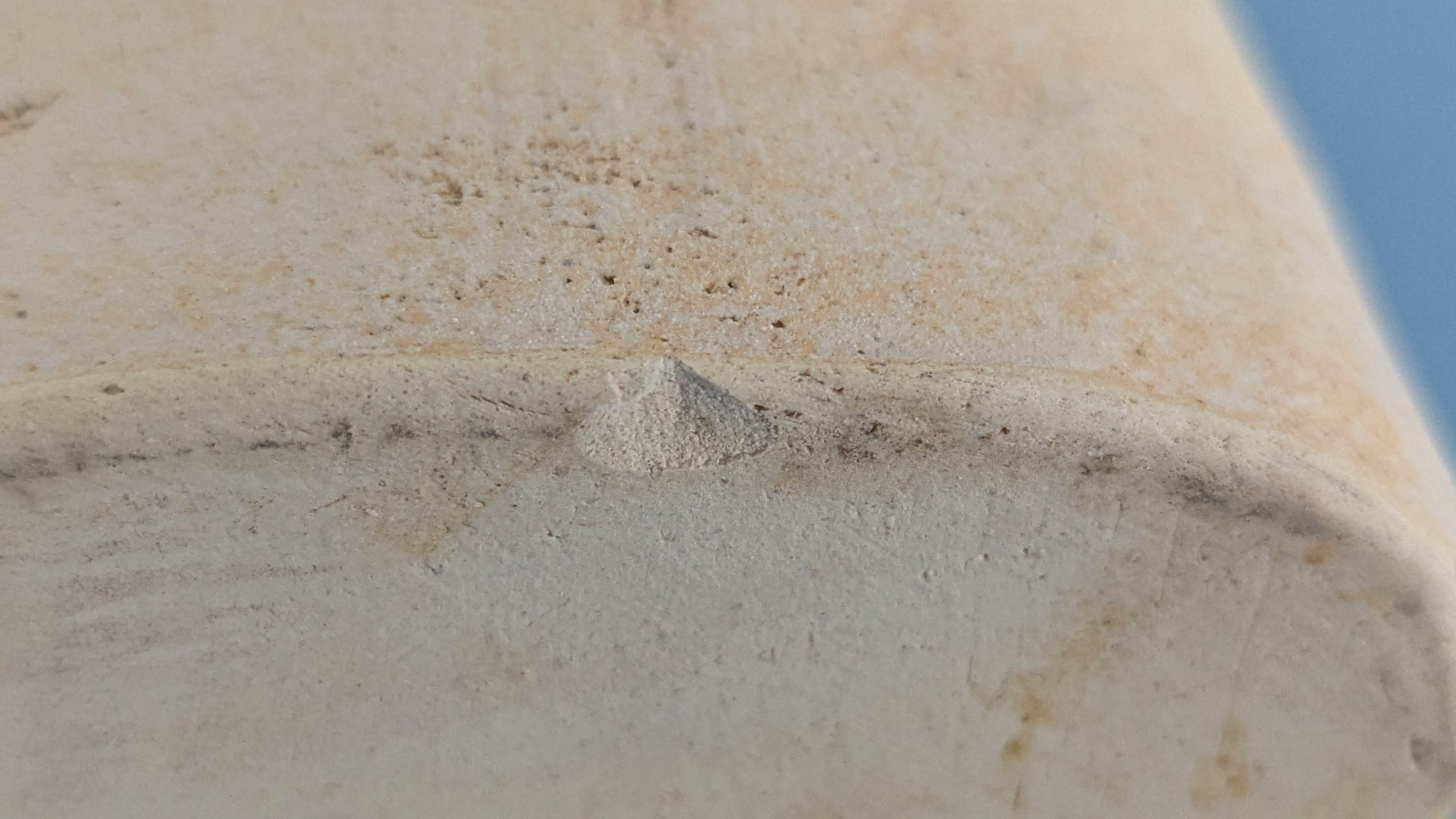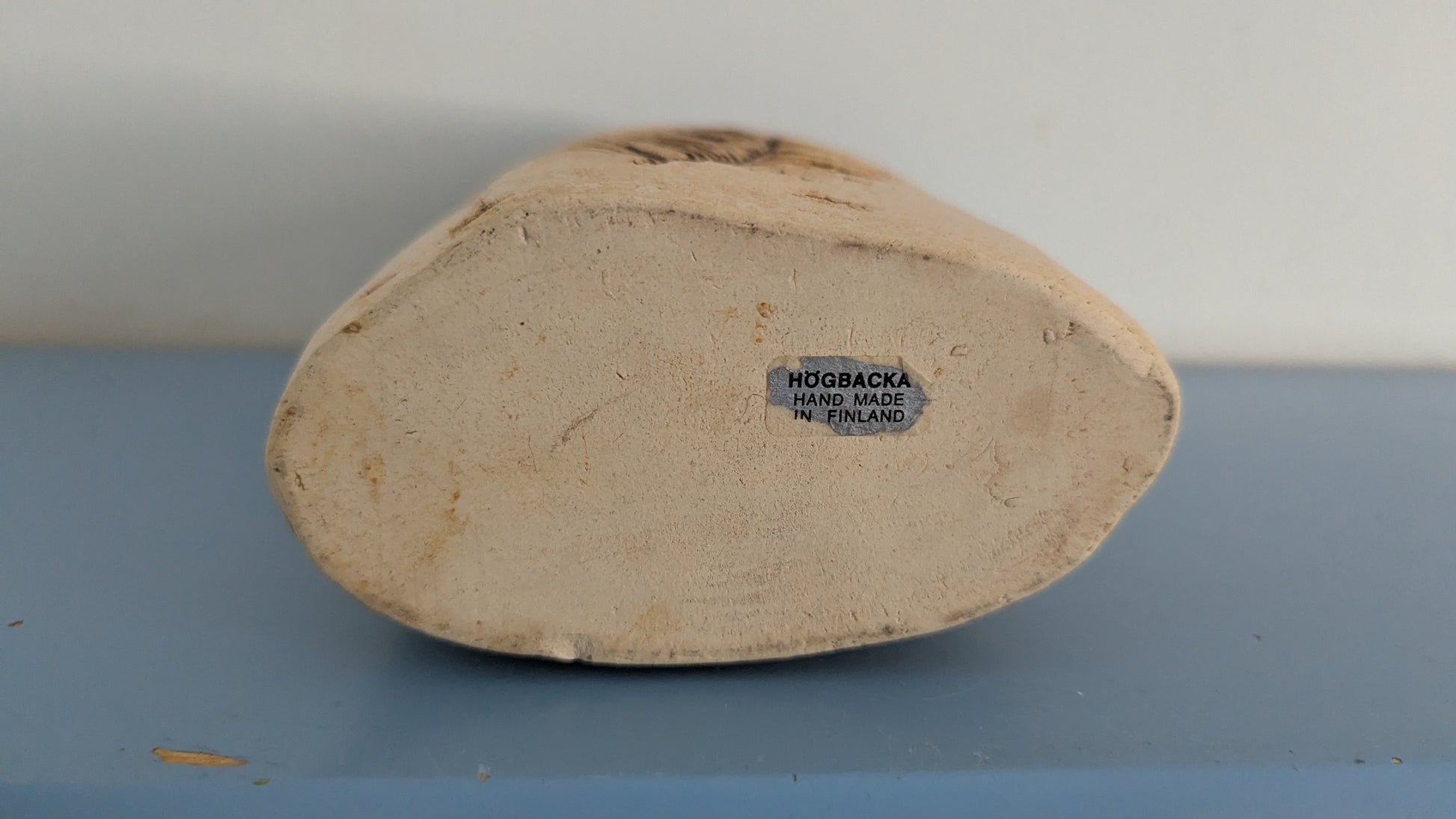 Pohjassa vielä Högbacka tarran jämät. Ei halkeamia. Alaosassa viimeisen kuvan mukainen 7mm iskemä.