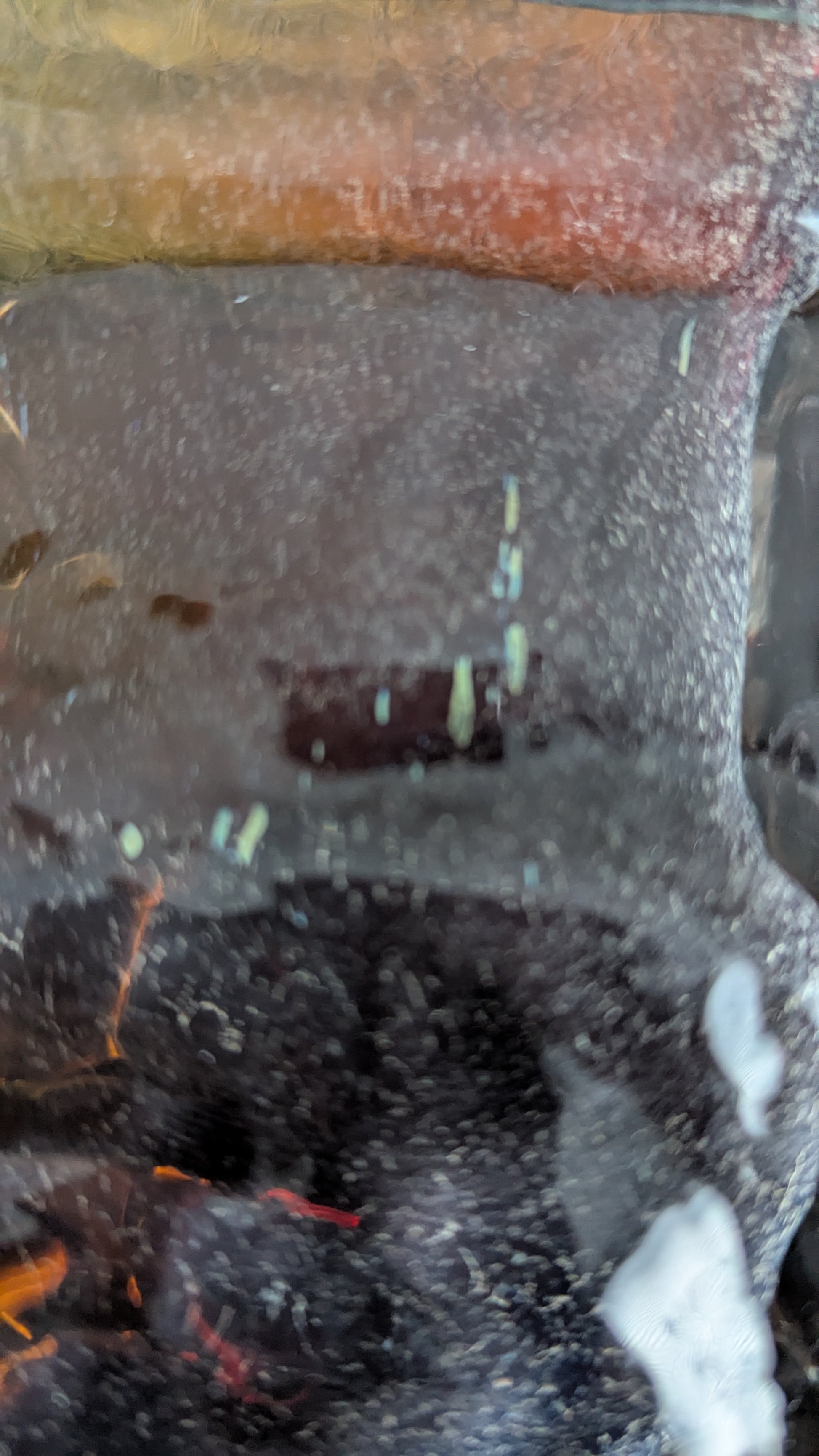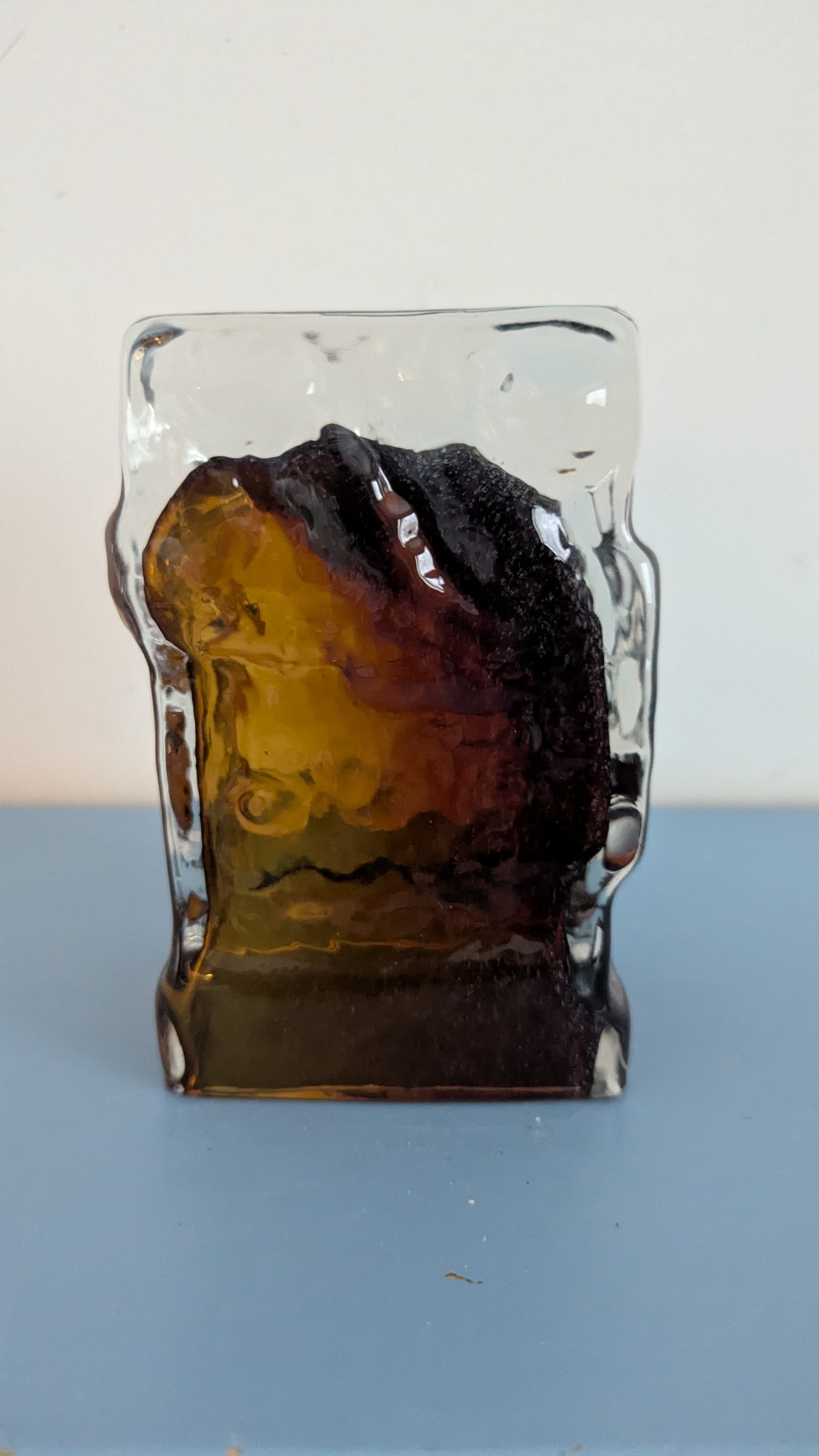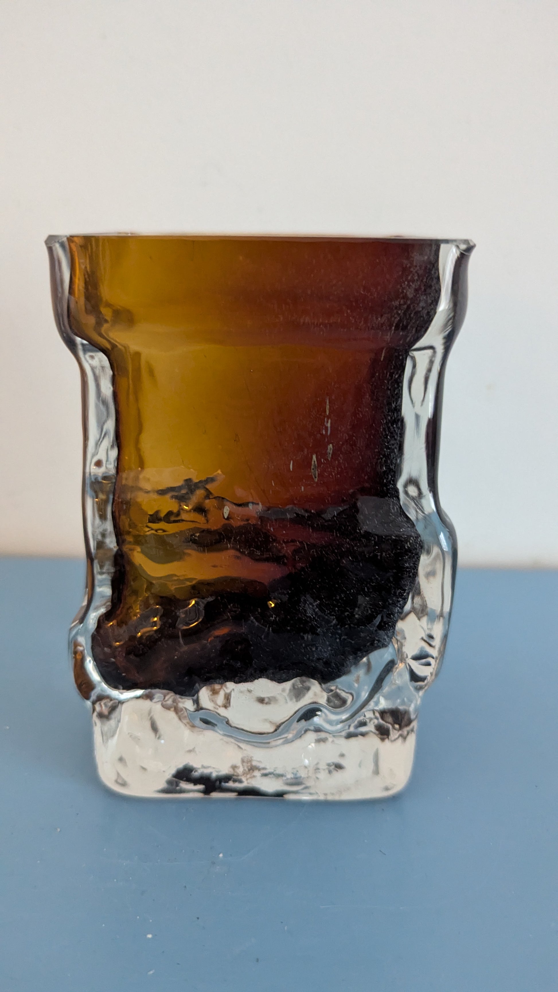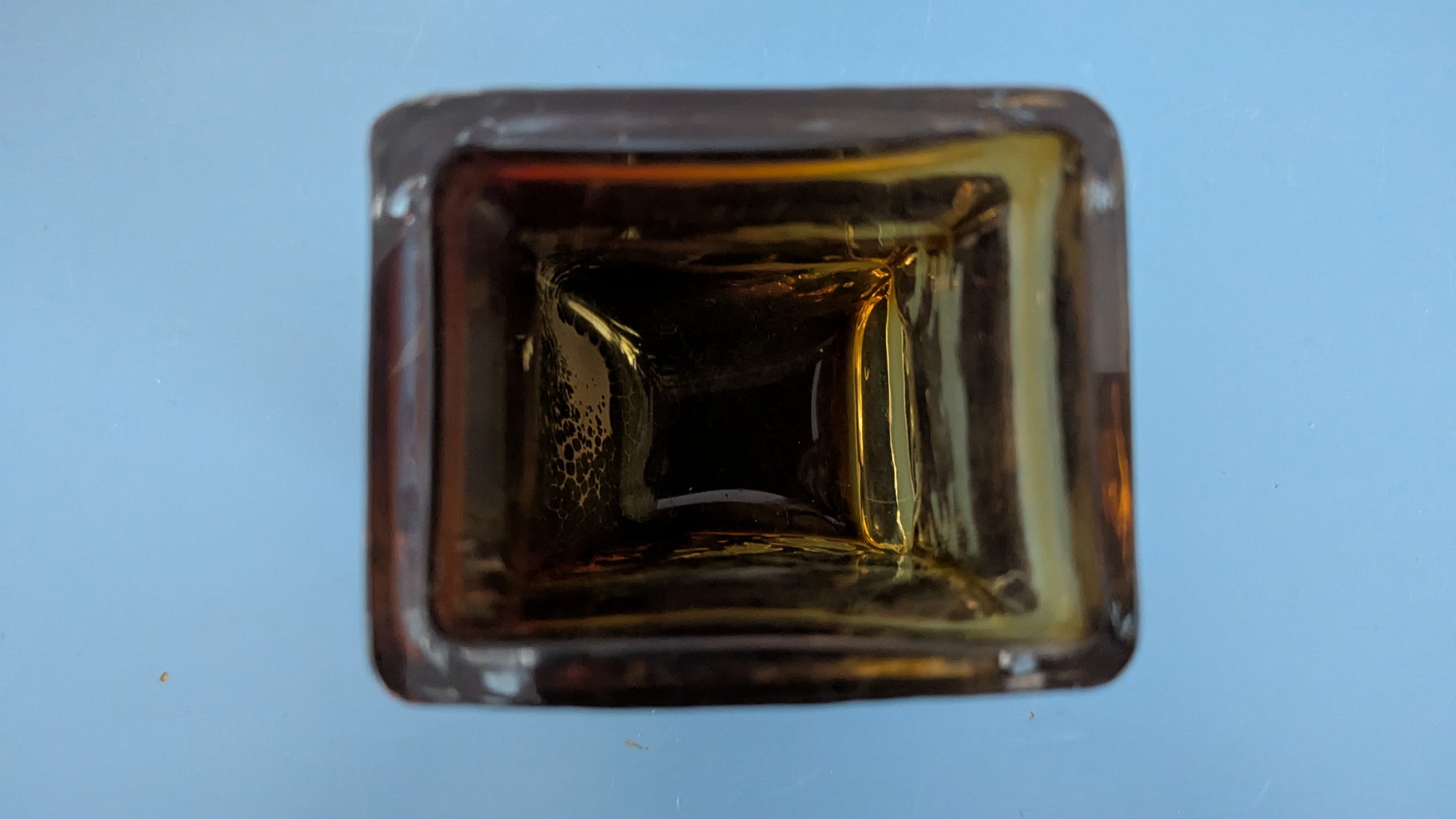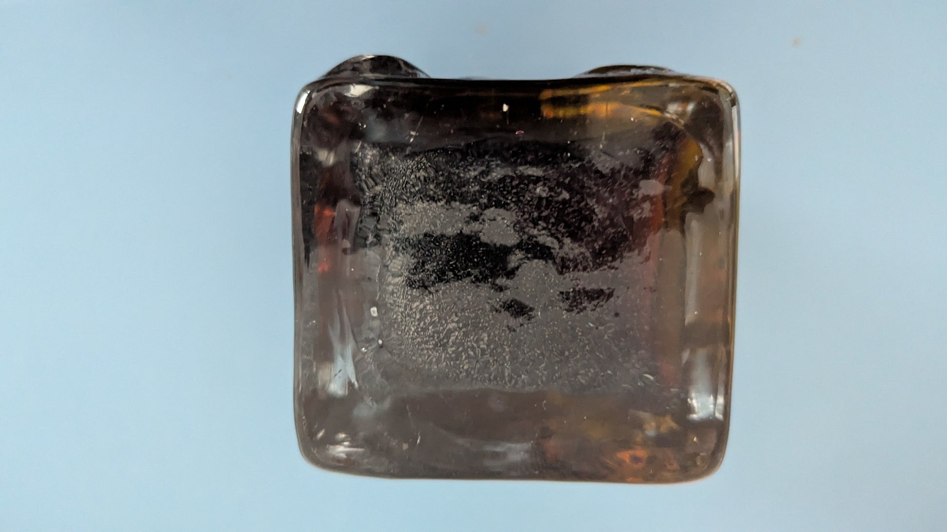 Ei iskemiä tai halkeamia. Pohjassa minimaalista jälkeä siirtelystä. Toiselle puolelle, lasimassan sisään, jäänyt viimeisen kuvan mukaisia ilmakuplia. Näyttää harmailta ruskeassa lasimassassa.
