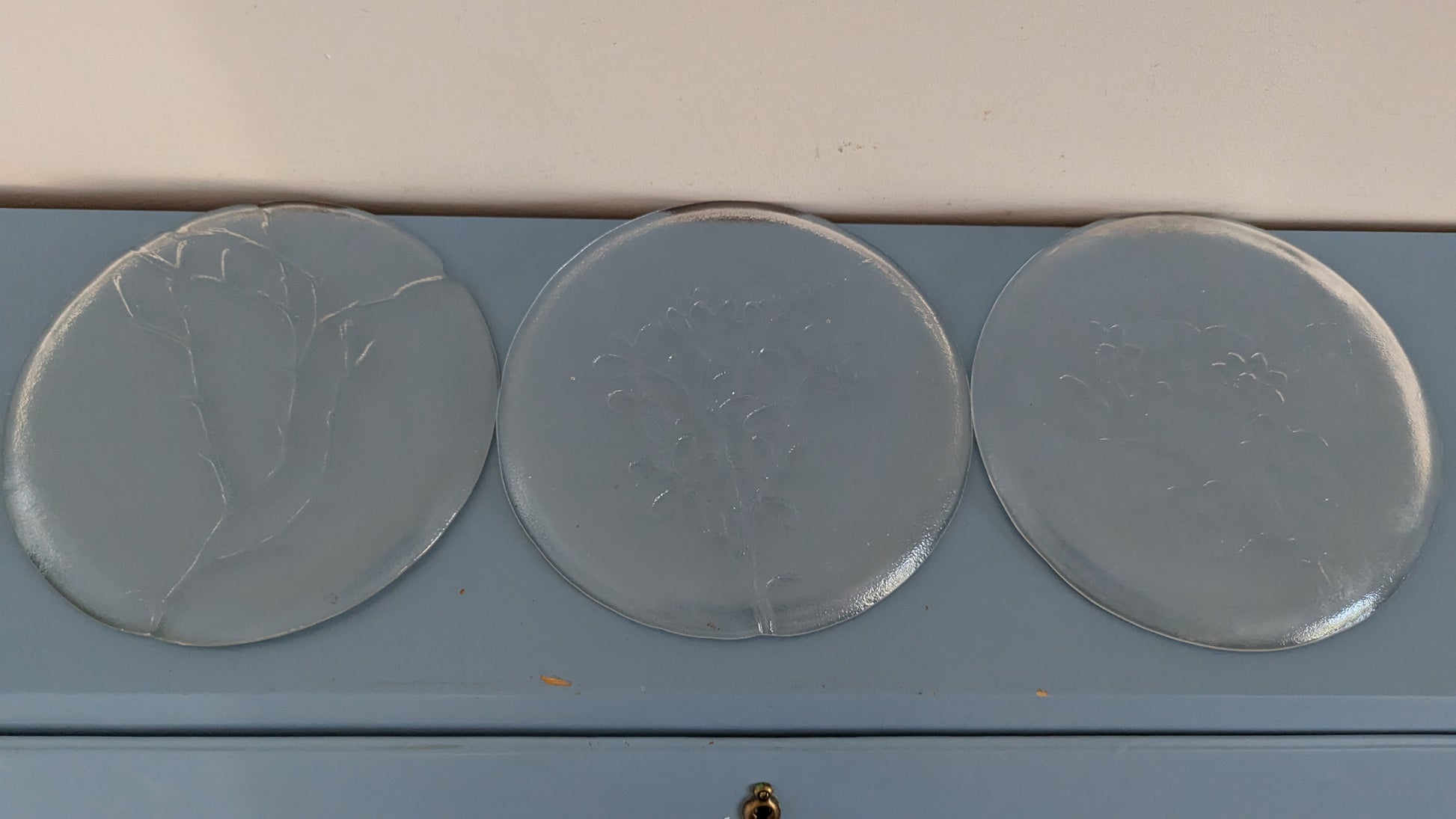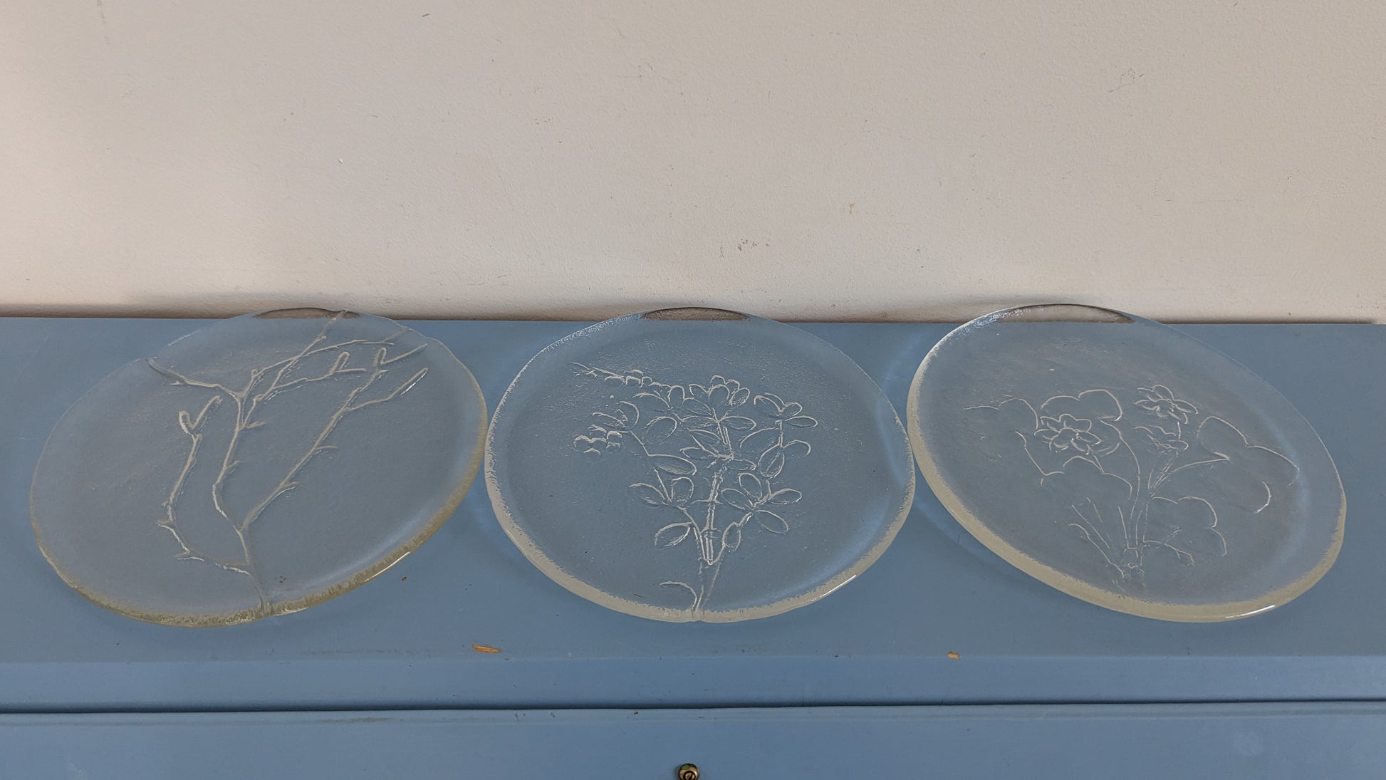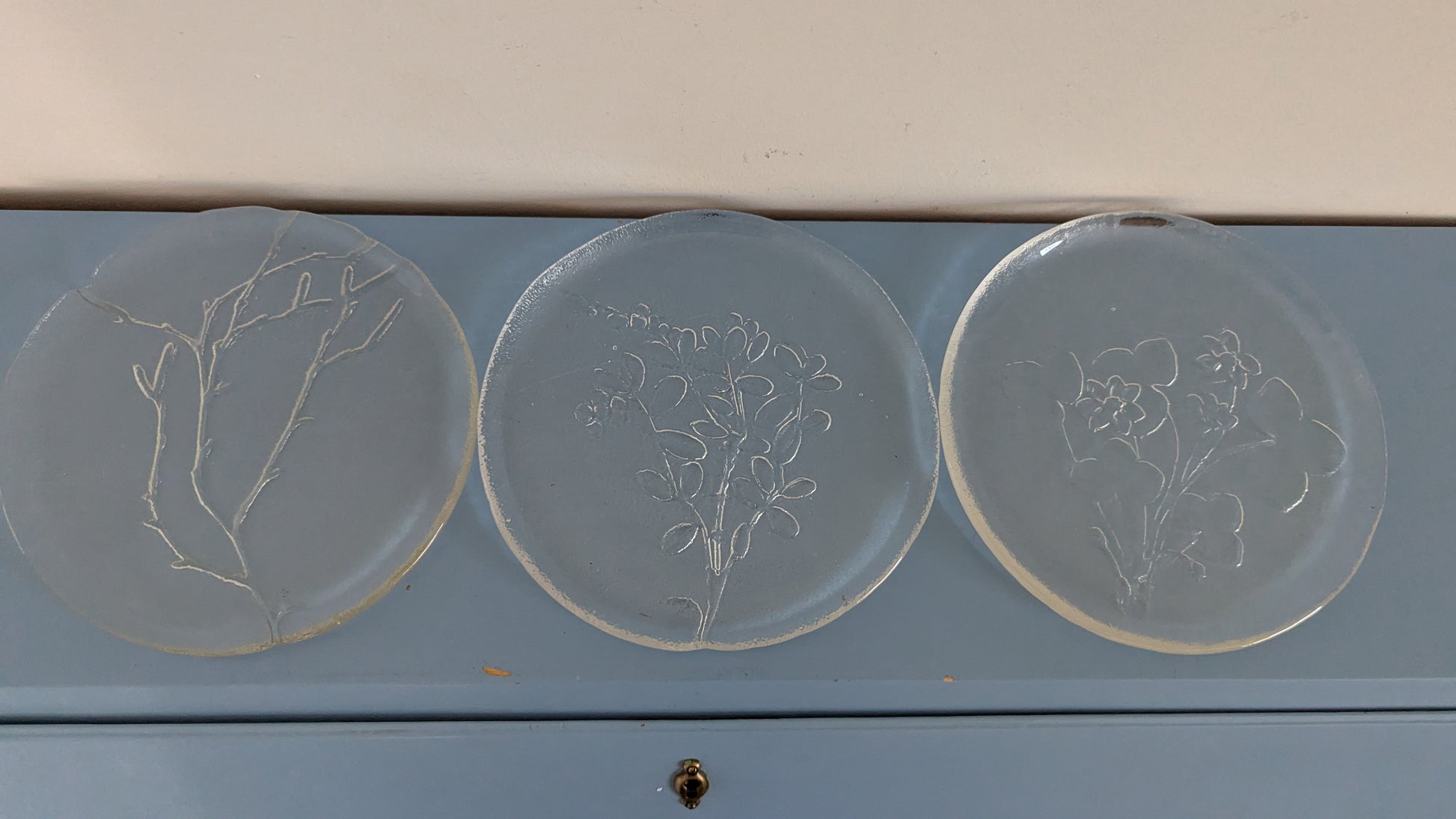 Lautasista yksi on mustikan varpu, yksi koivun oksa ja yksi sinivuokko.