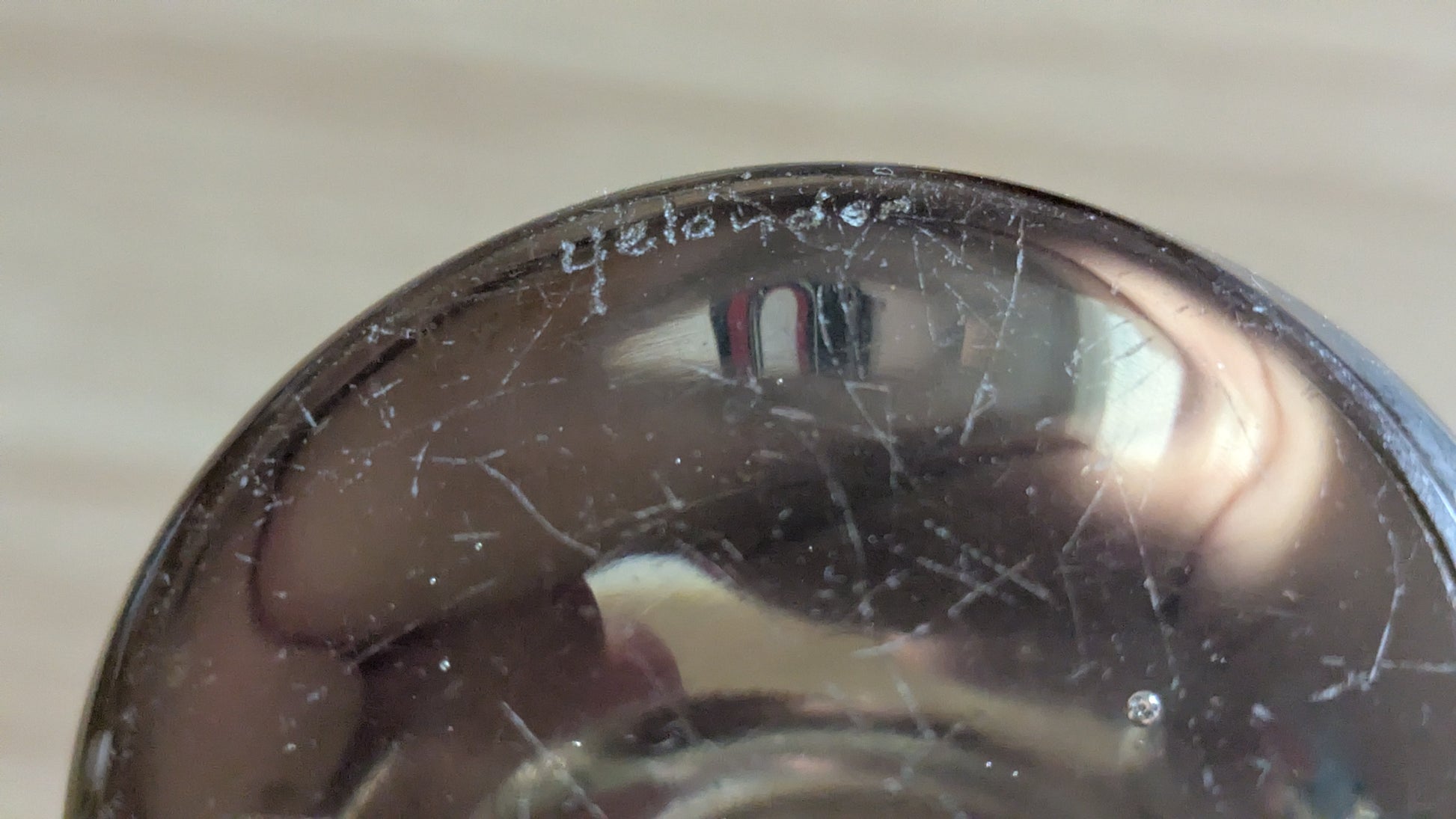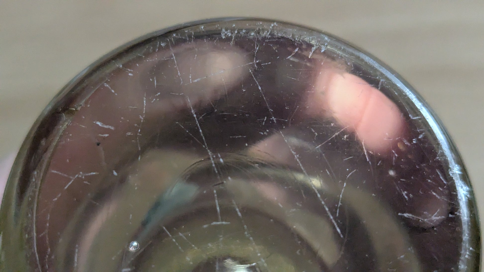 Ei iskemiä tai halkeamia. Pohjassa naarmua siirtelystä. Alaosassa viimeisen kuvan mukainen noin 4cm mittainen naarmu.