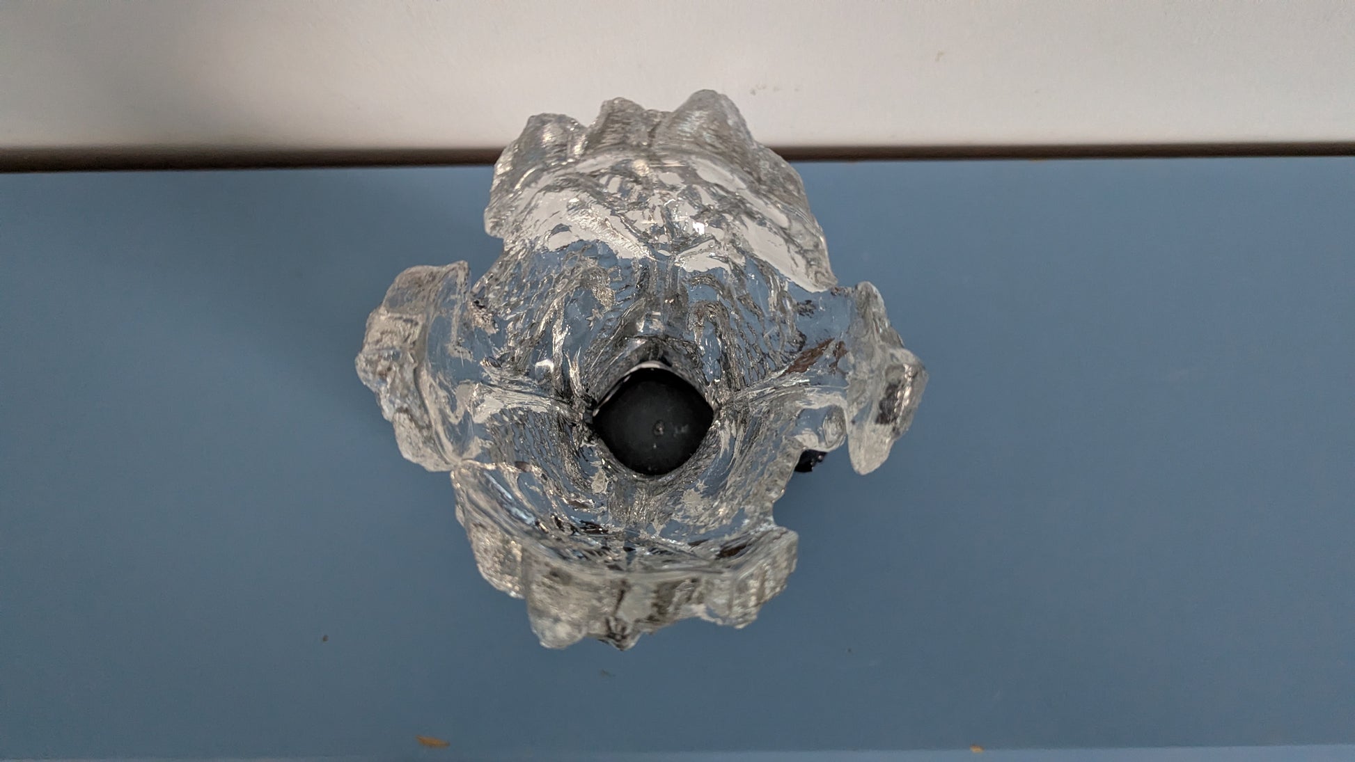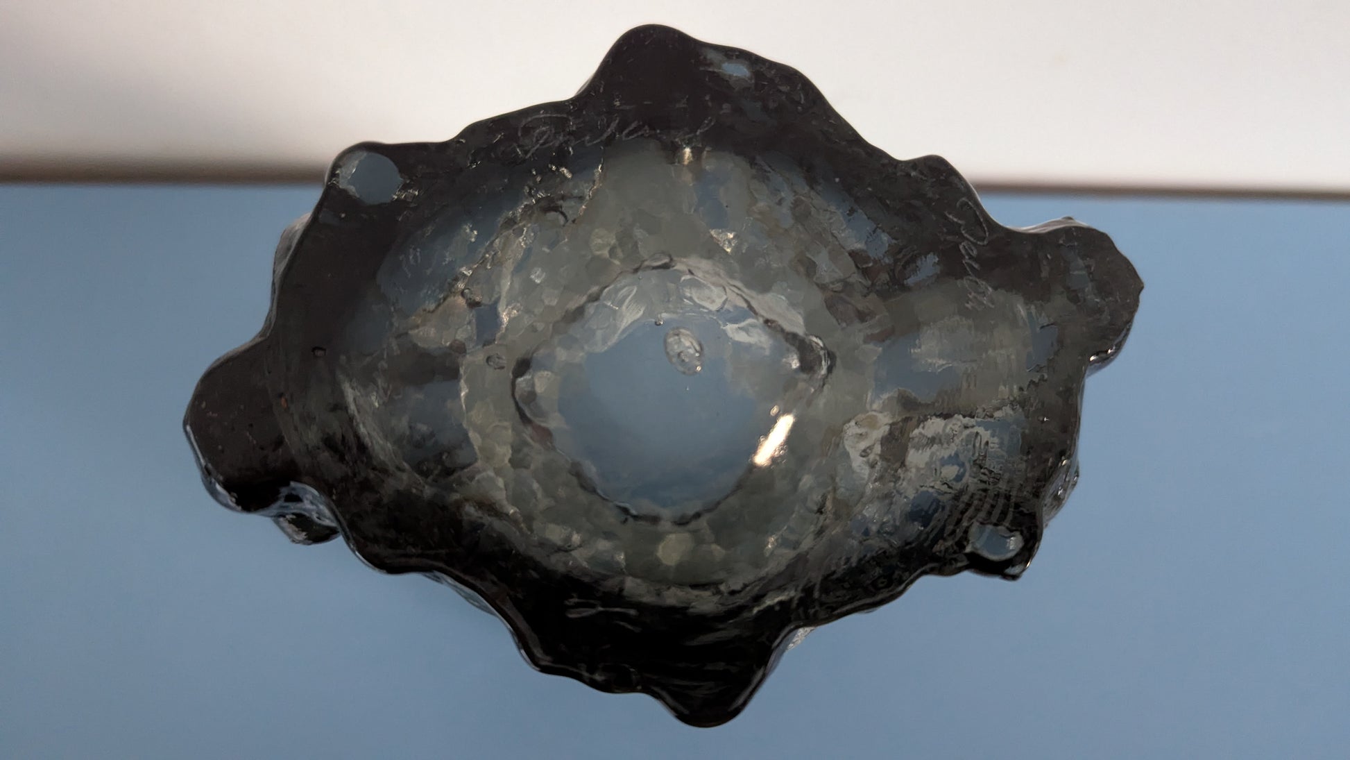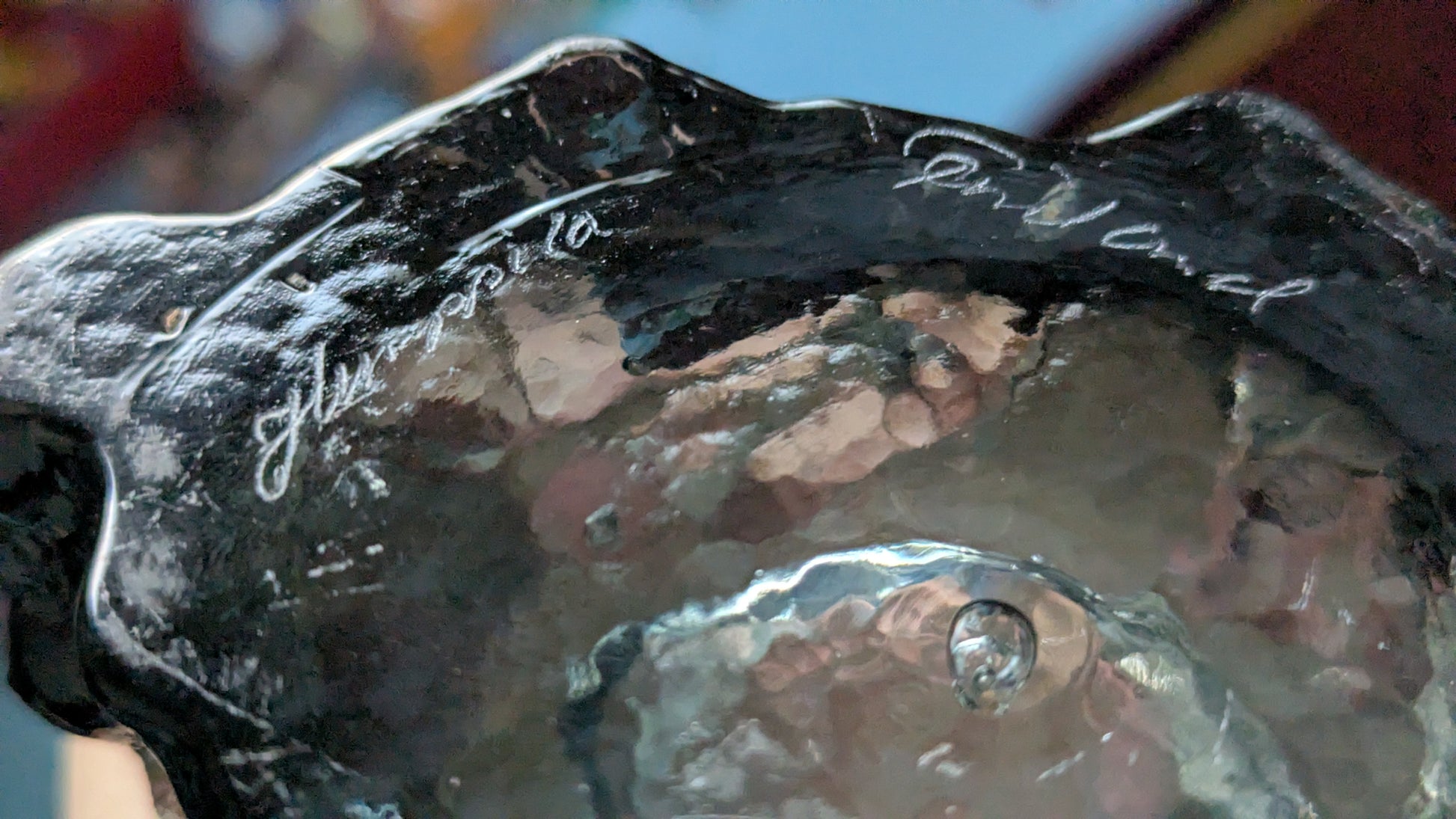 Ei halkeamia tai halkeamia. Pohjassa pientä naarmua siirtelystä. Keskelle pohjaa, lasimassan sisään, jäänyt yksi ilmakupla. Näkyy viimeisessä kuvassa.