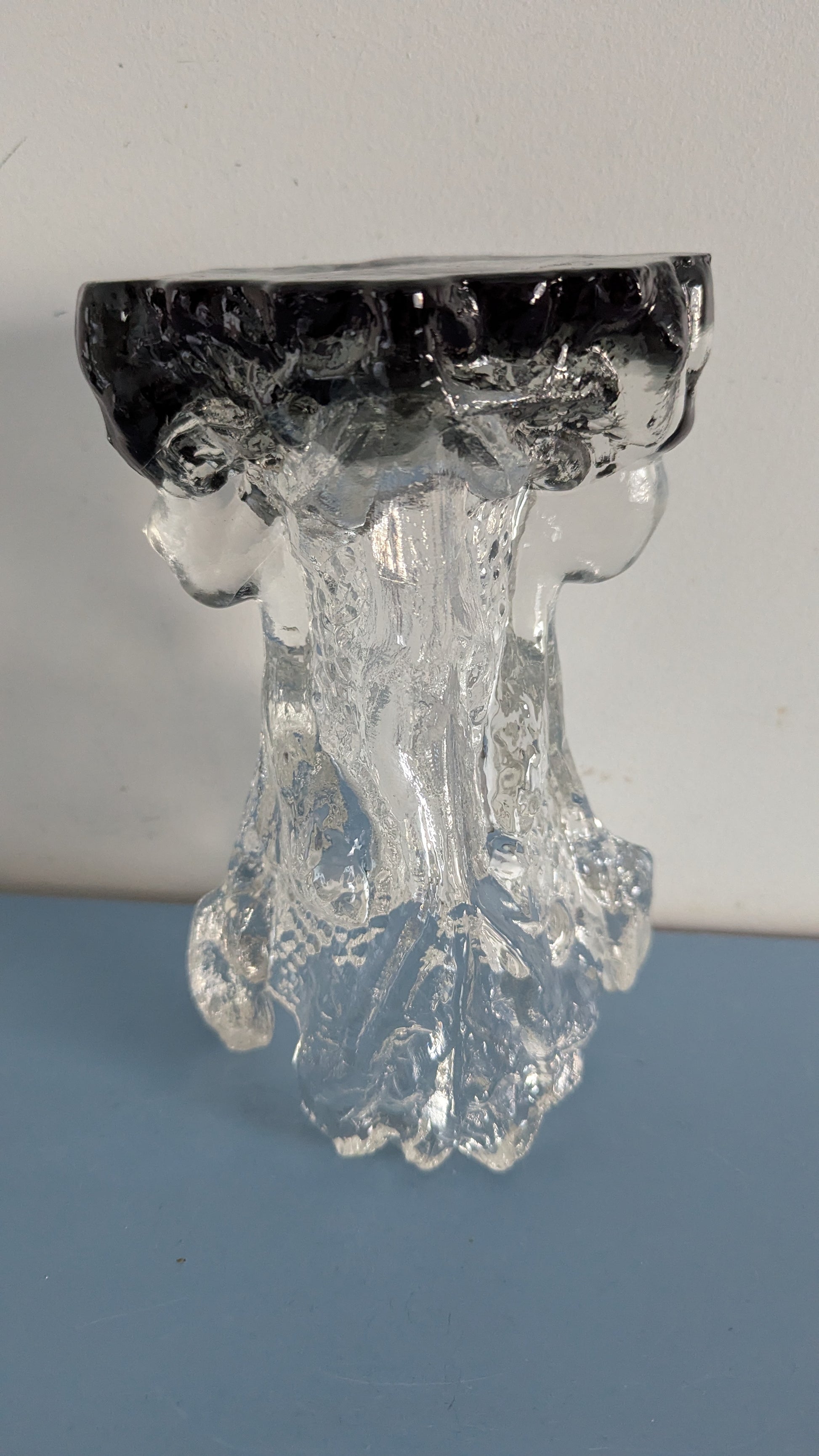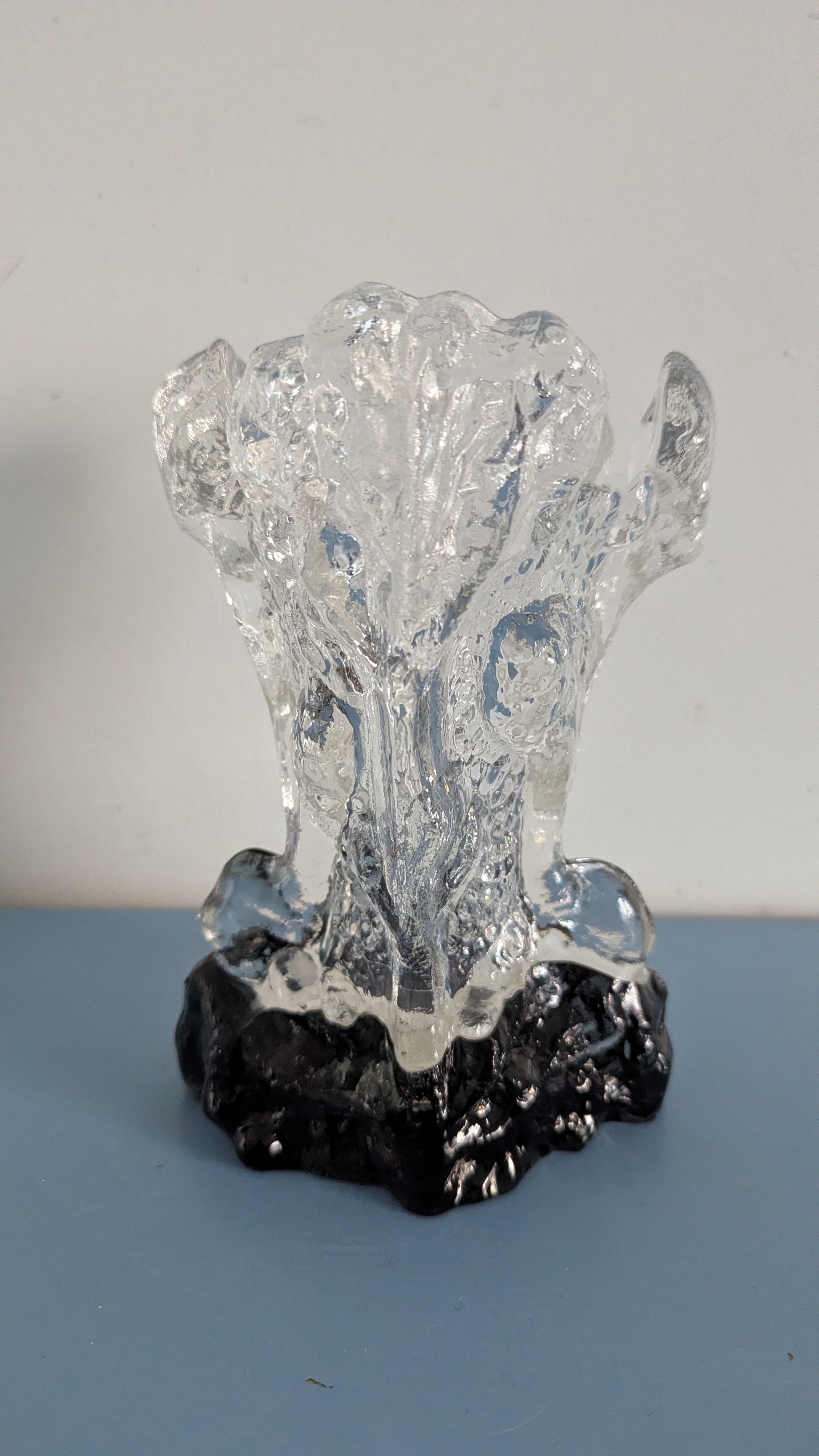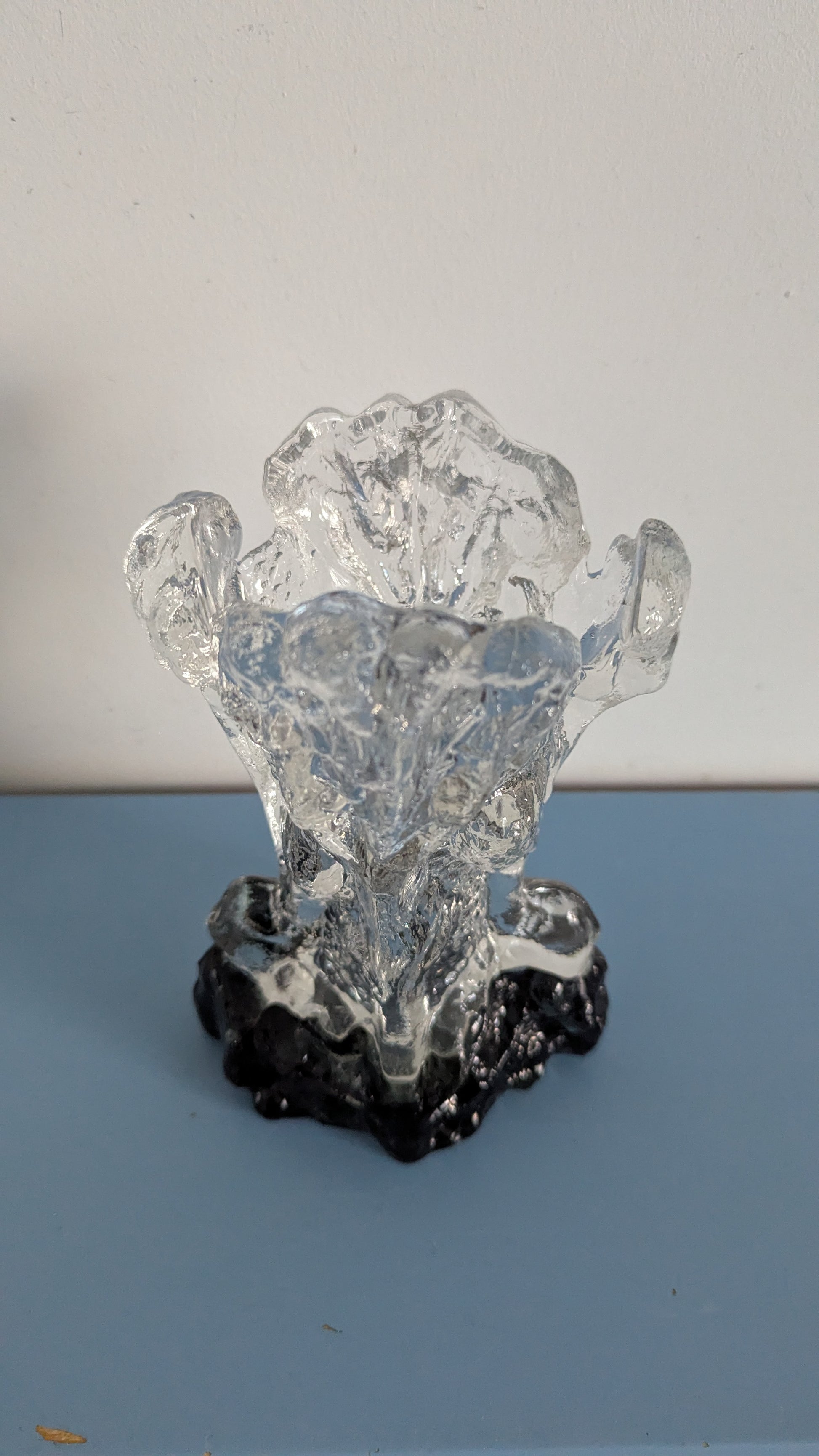 Ei halkeamia tai halkeamia. Pohjassa pientä naarmua siirtelystä. Keskelle pohjaa, lasimassan sisään, jäänyt yksi ilmakupla. Näkyy viimeisessä kuvassa.