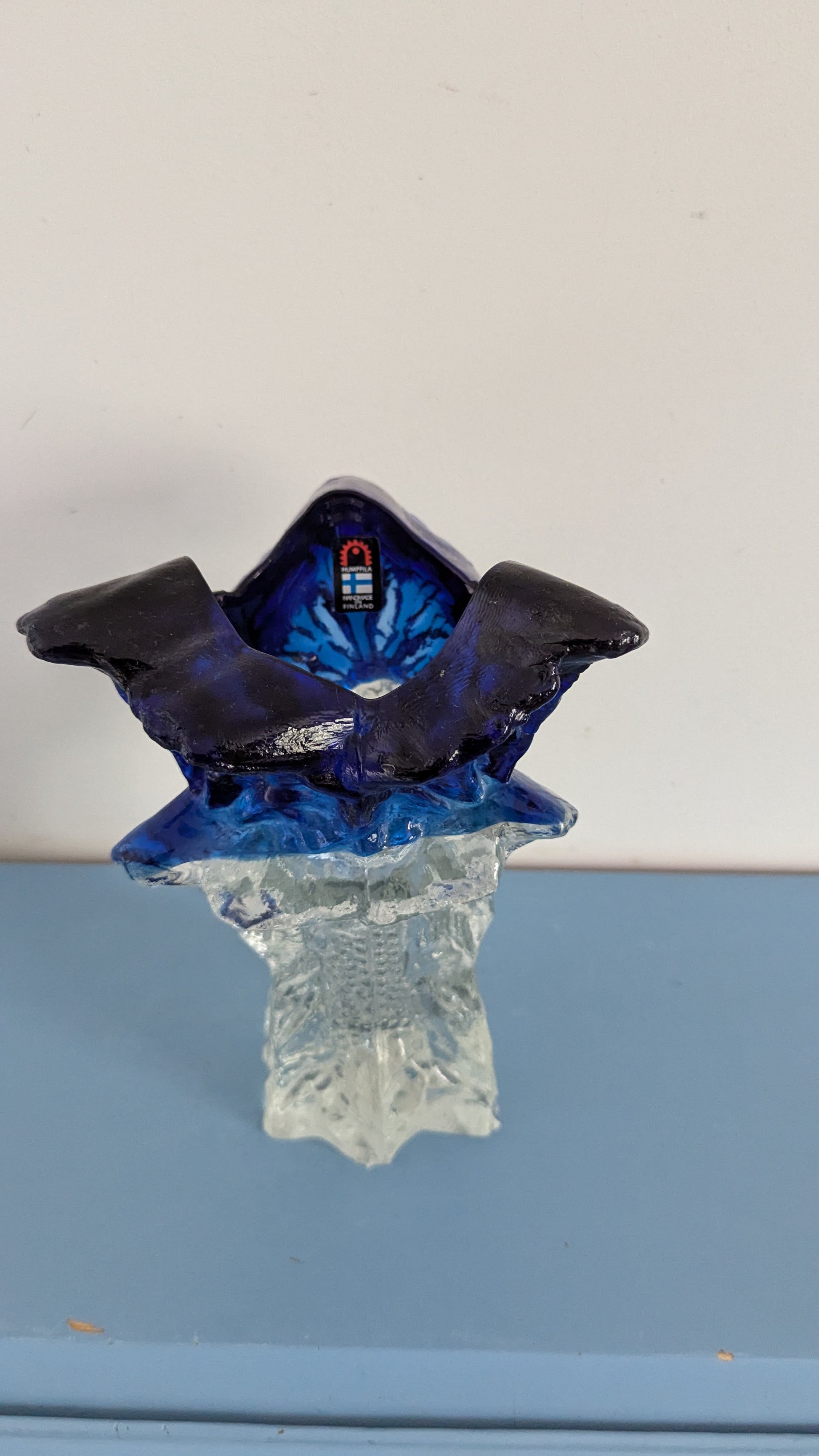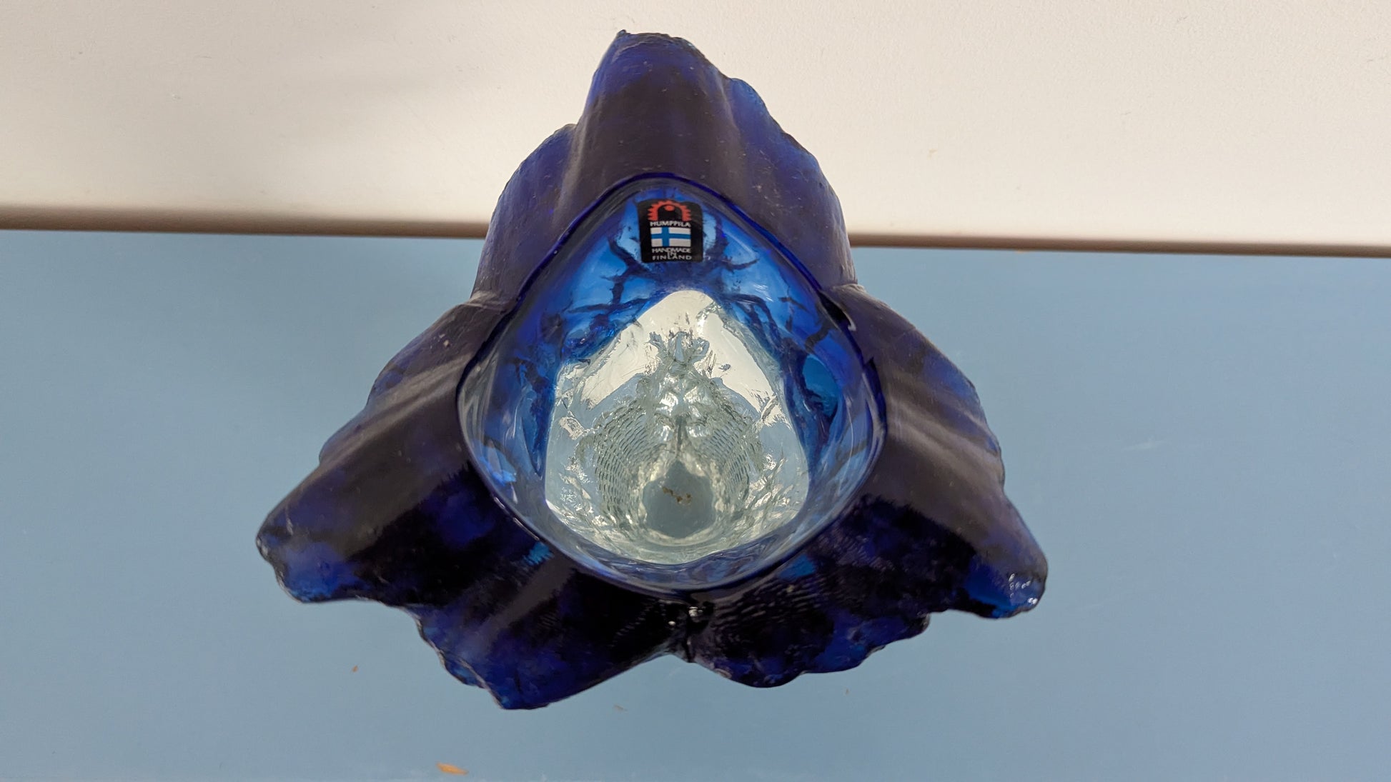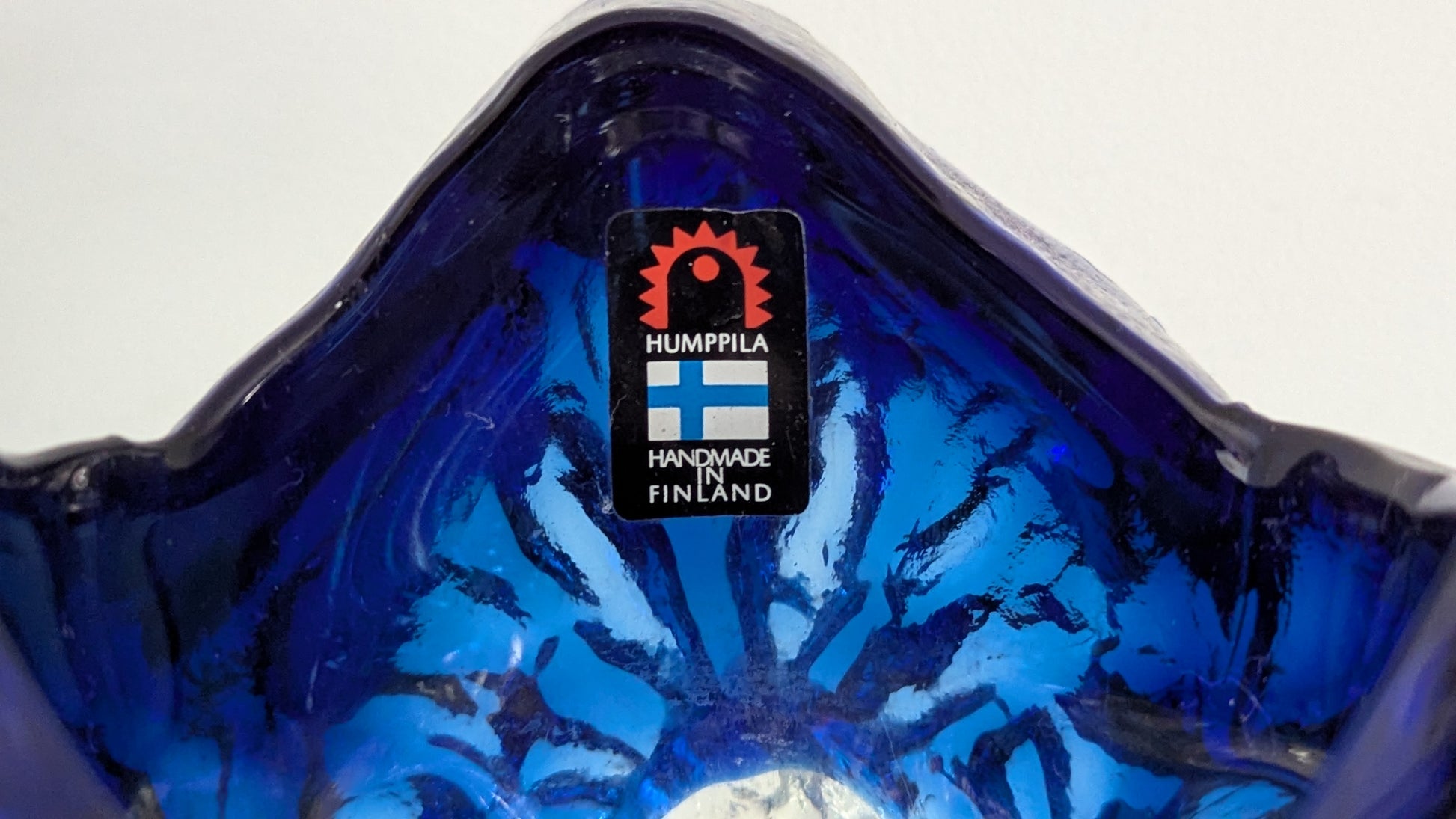 Humppilan tarra vielä paikalla. Ei halkeamia. Pohjassa naarmuja siirtelystä. Sekä ylhäällä että alhaalla iskemiä. Varsinkin alhaalta lohjennut isompia palasia pois. Yritin saada ne viimeiseen kuvaan mutta maljakon muotojen takia lohkeamia ei näy. Ne kyllä tuntee sormella ja huomaa kun maljakkoa tarkastelee läheltä.