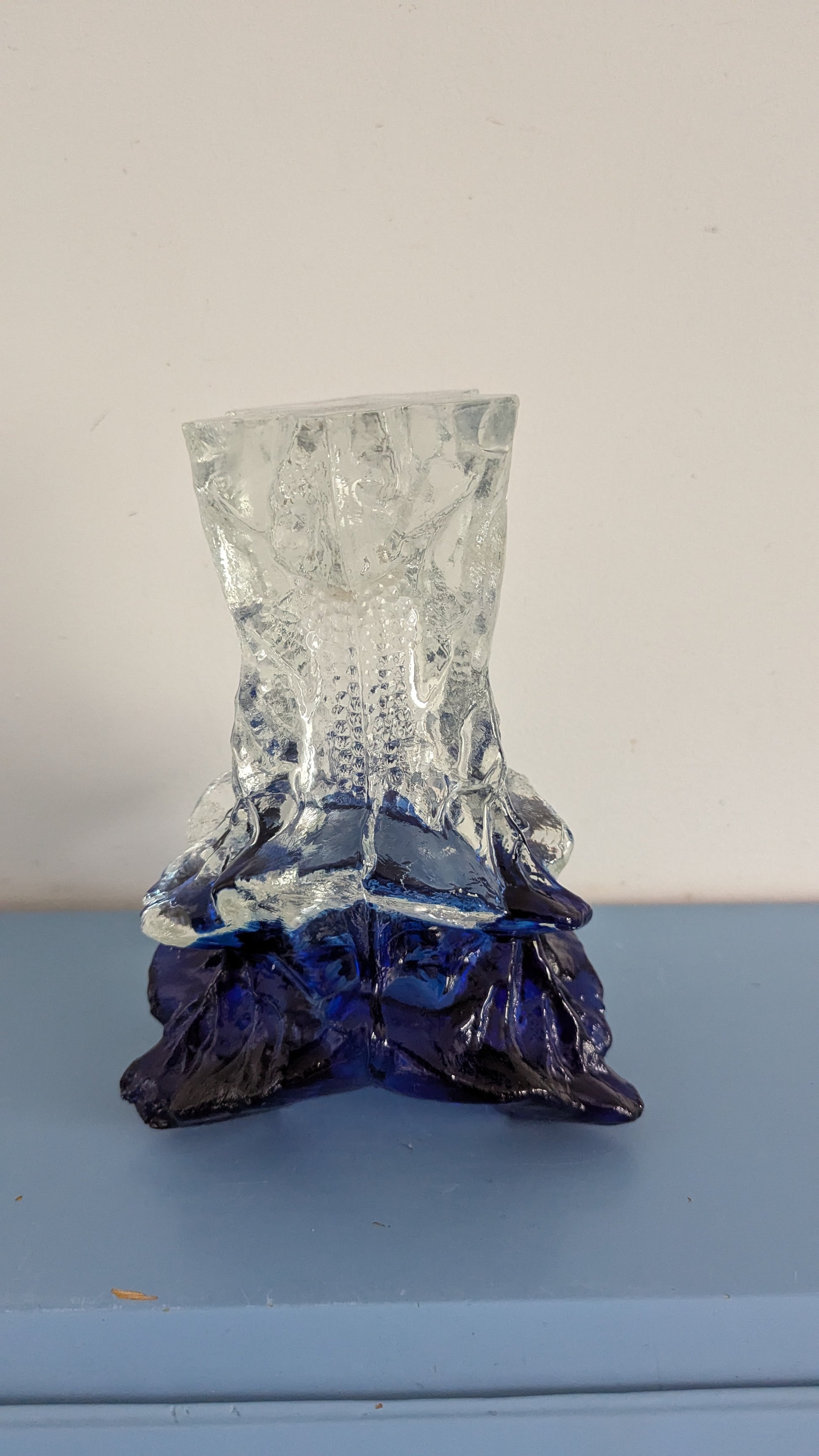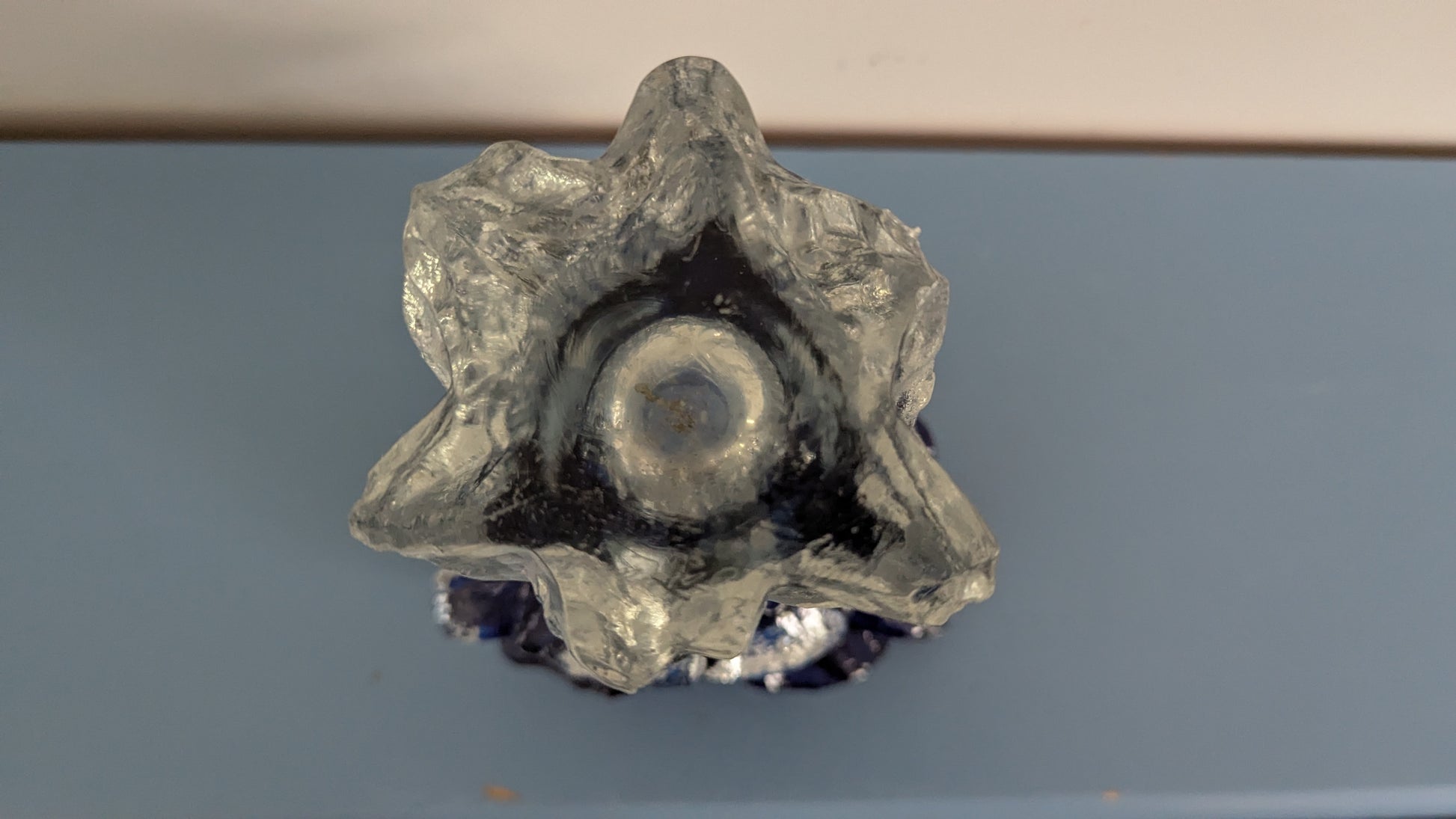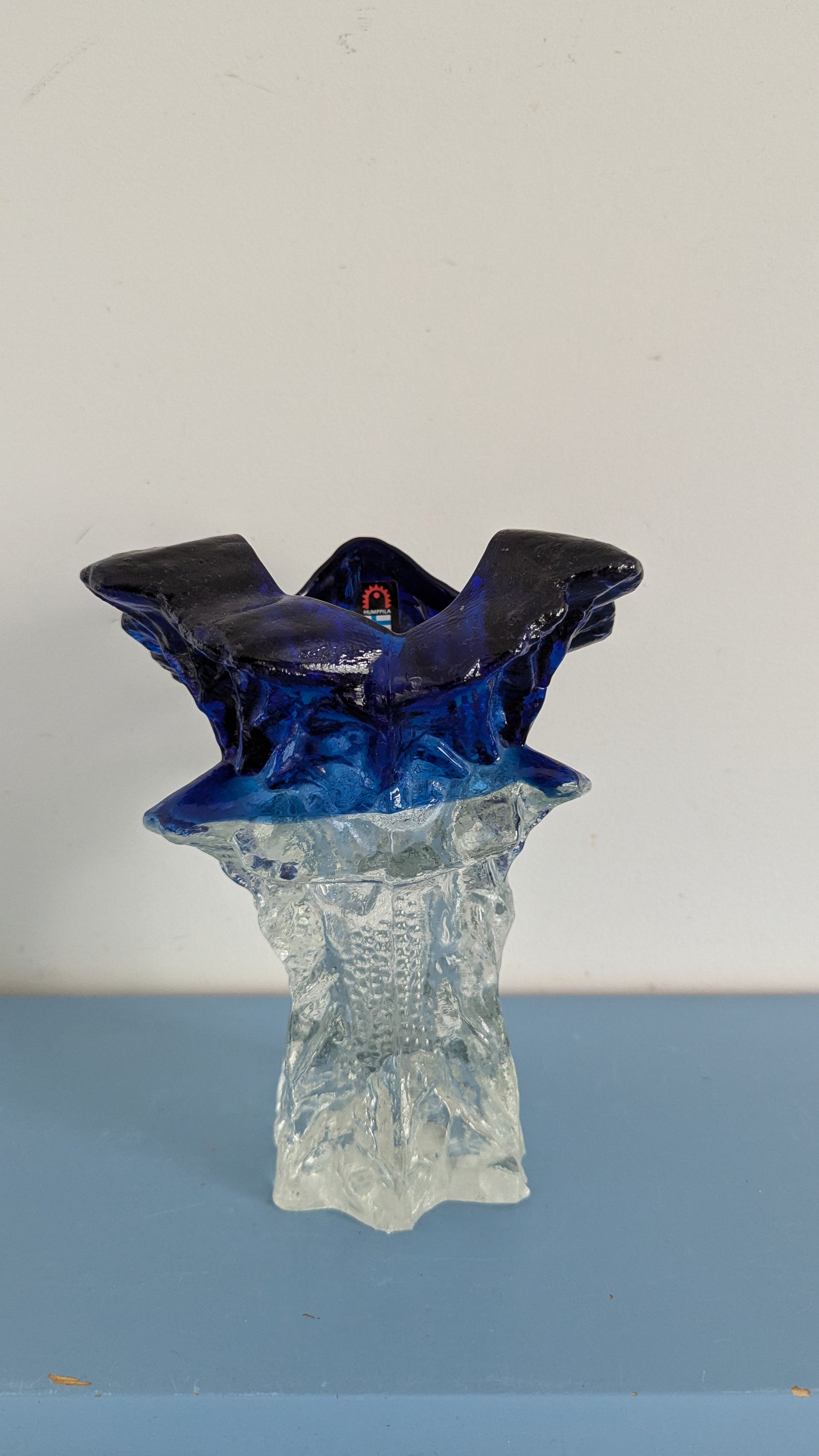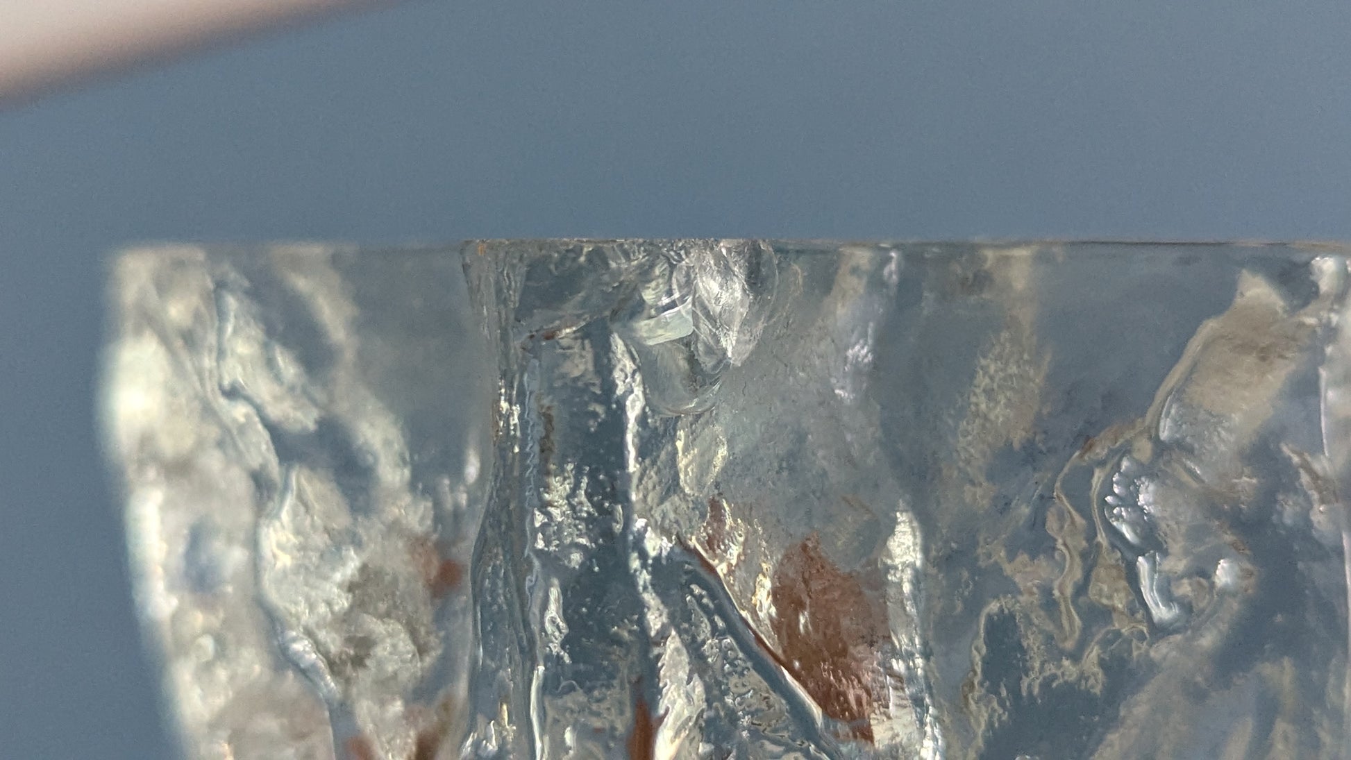 Humppilan tarra vielä paikalla. Ei halkeamia. Pohjassa naarmuja siirtelystä. Sekä ylhäällä että alhaalla iskemiä. Varsinkin alhaalta lohjennut isompia palasia pois. Yritin saada ne viimeiseen kuvaan mutta maljakon muotojen takia lohkeamia ei näy. Ne kyllä tuntee sormella ja huomaa kun maljakkoa tarkastelee läheltä.
