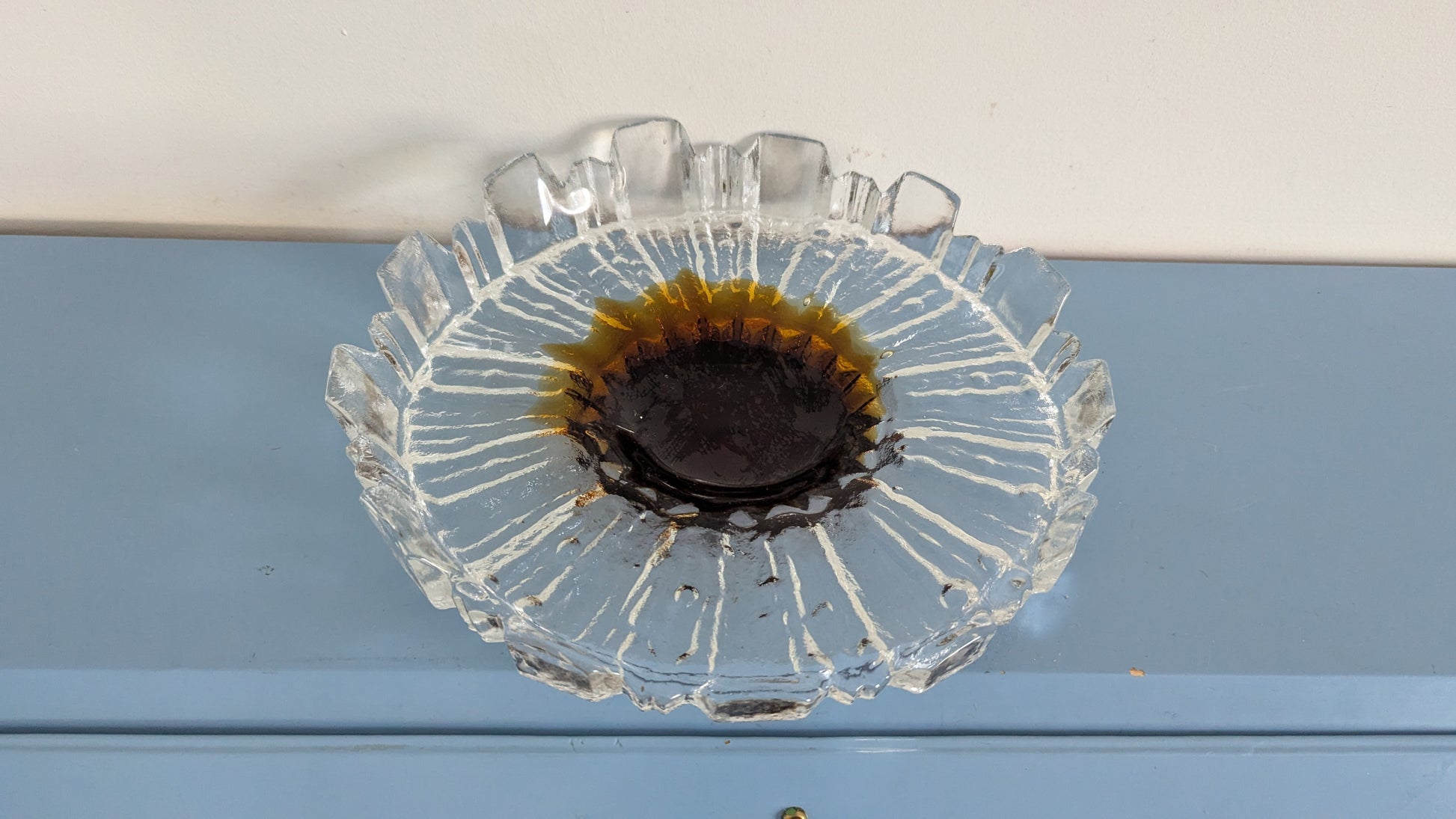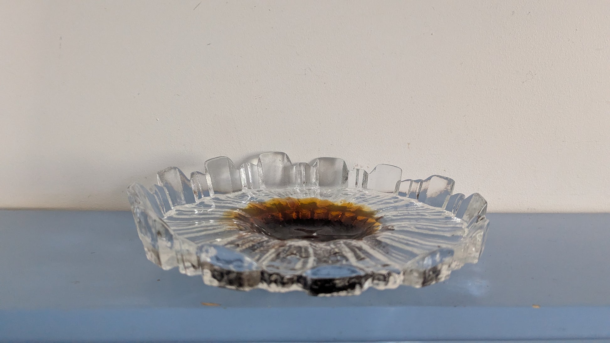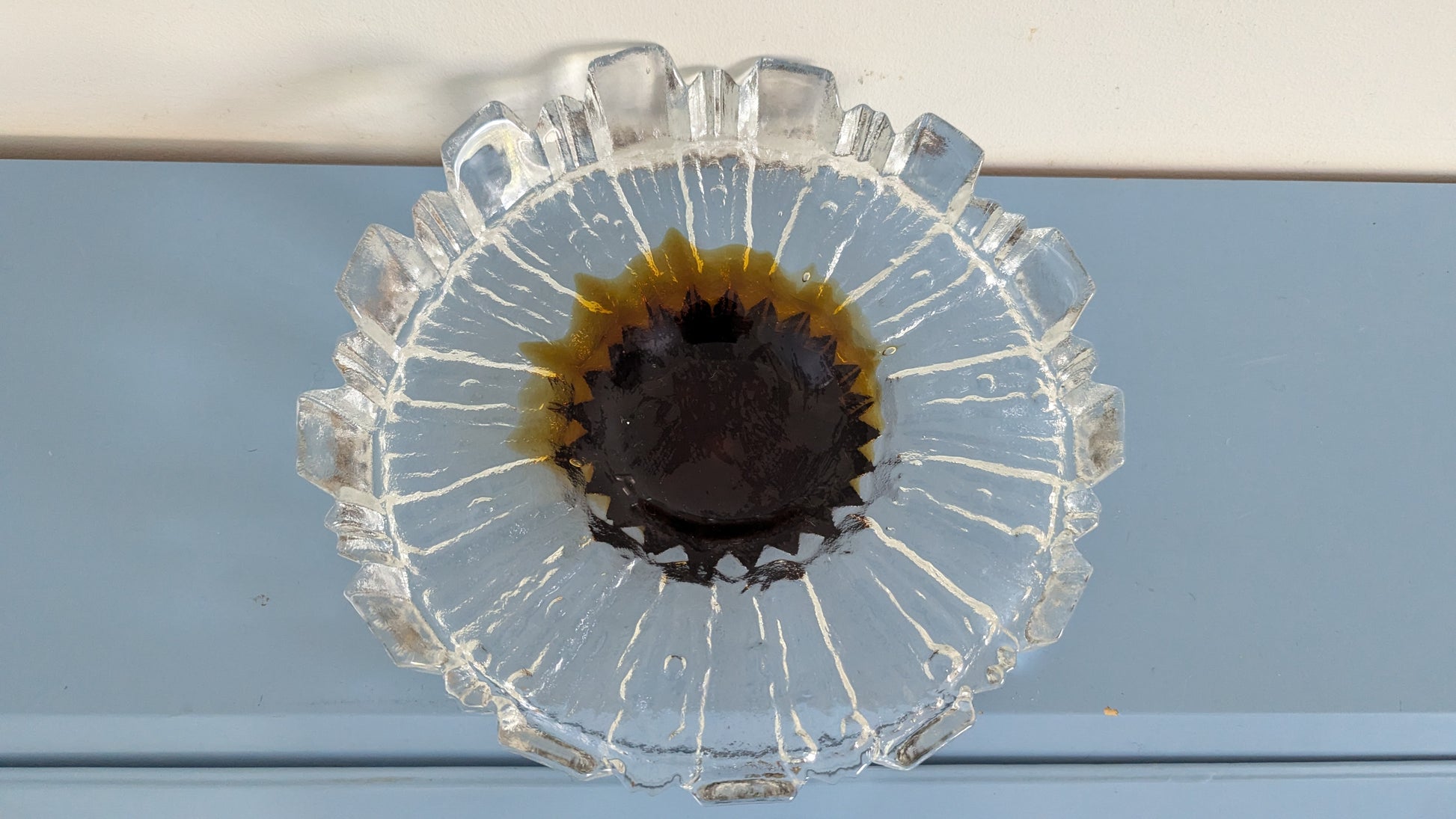 Ei halkeamia tai naarmuja. Lasin sisälle jäänyt useampia ilmakuplia. Muotopuoli. Toisen puolen yläosan "huiput" huomattavasti korkeammalla kuin toisen puolen.