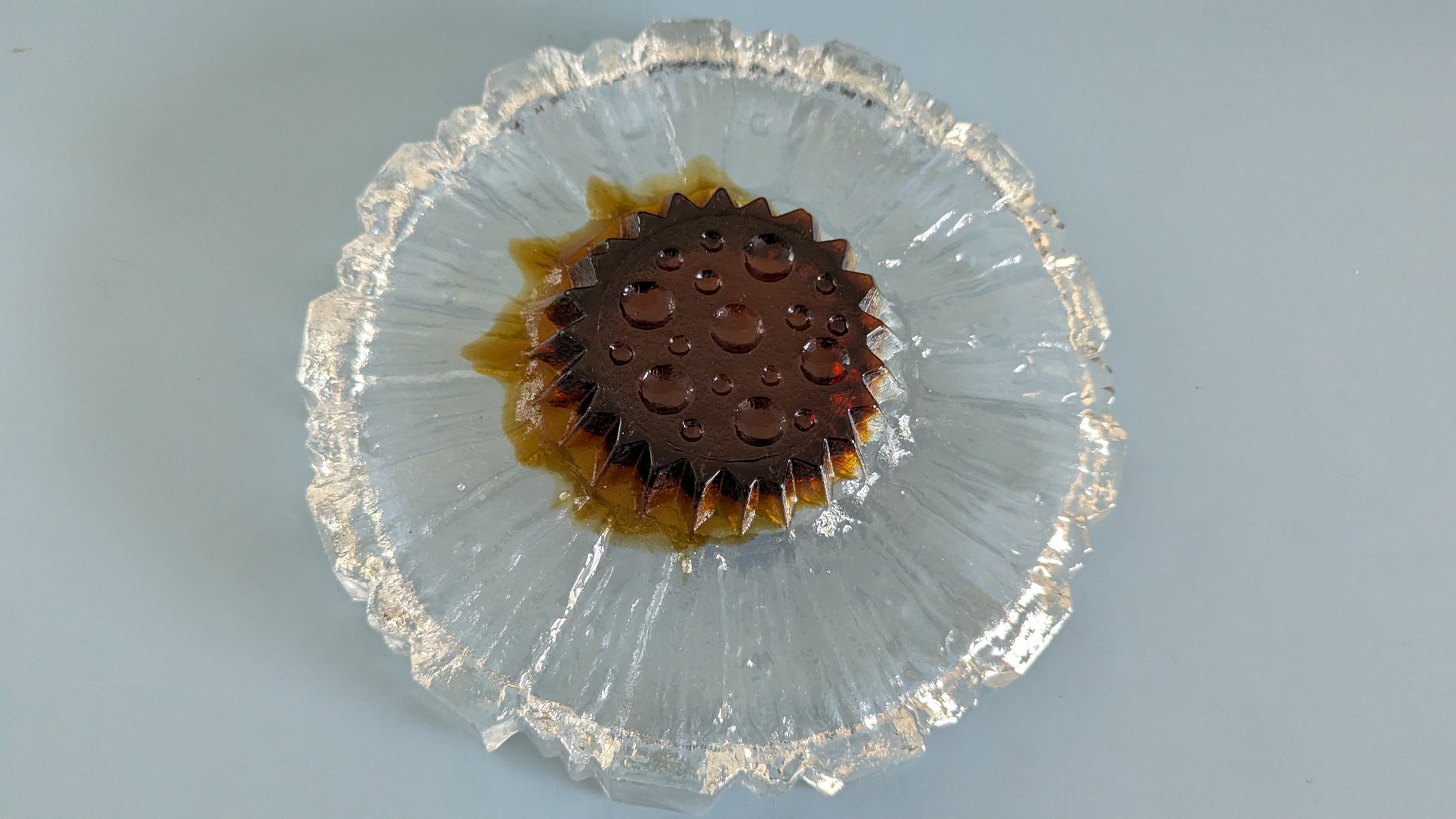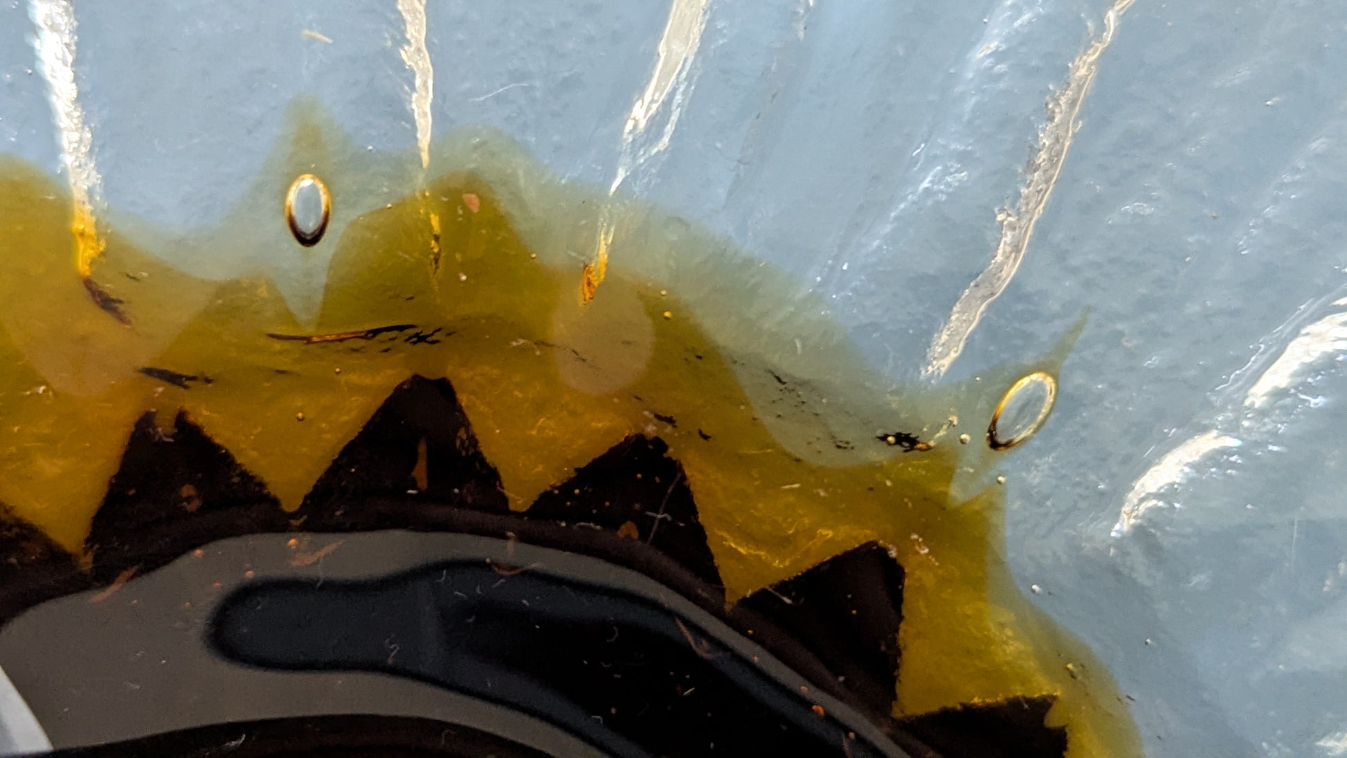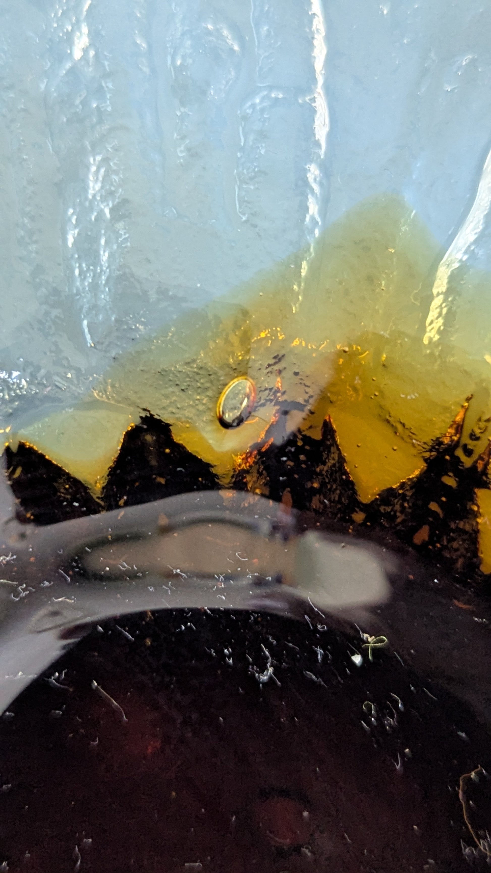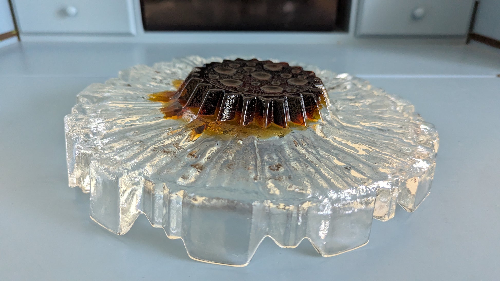 Ei halkeamia tai naarmuja. Lasin sisälle jäänyt useampia ilmakuplia. Muotopuoli. Toisen puolen yläosan "huiput" huomattavasti korkeammalla kuin toisen puolen.