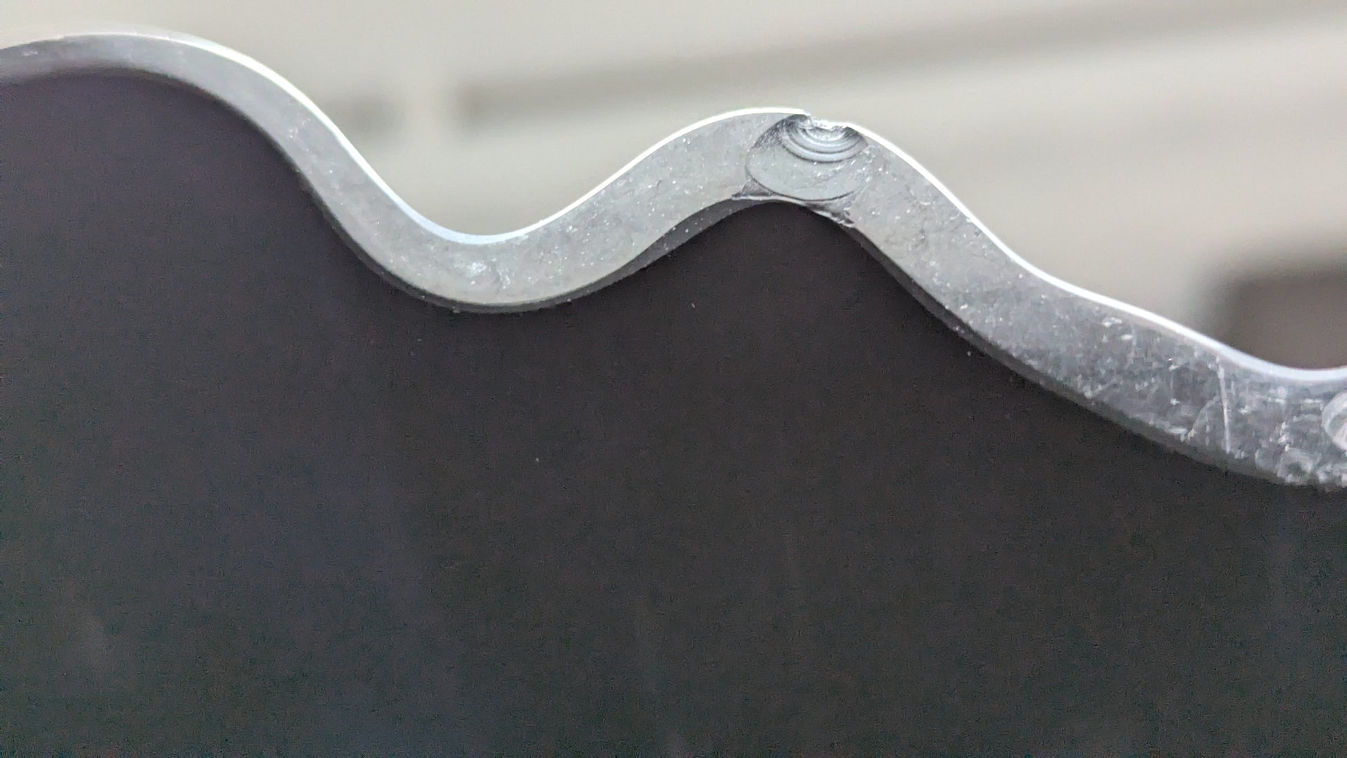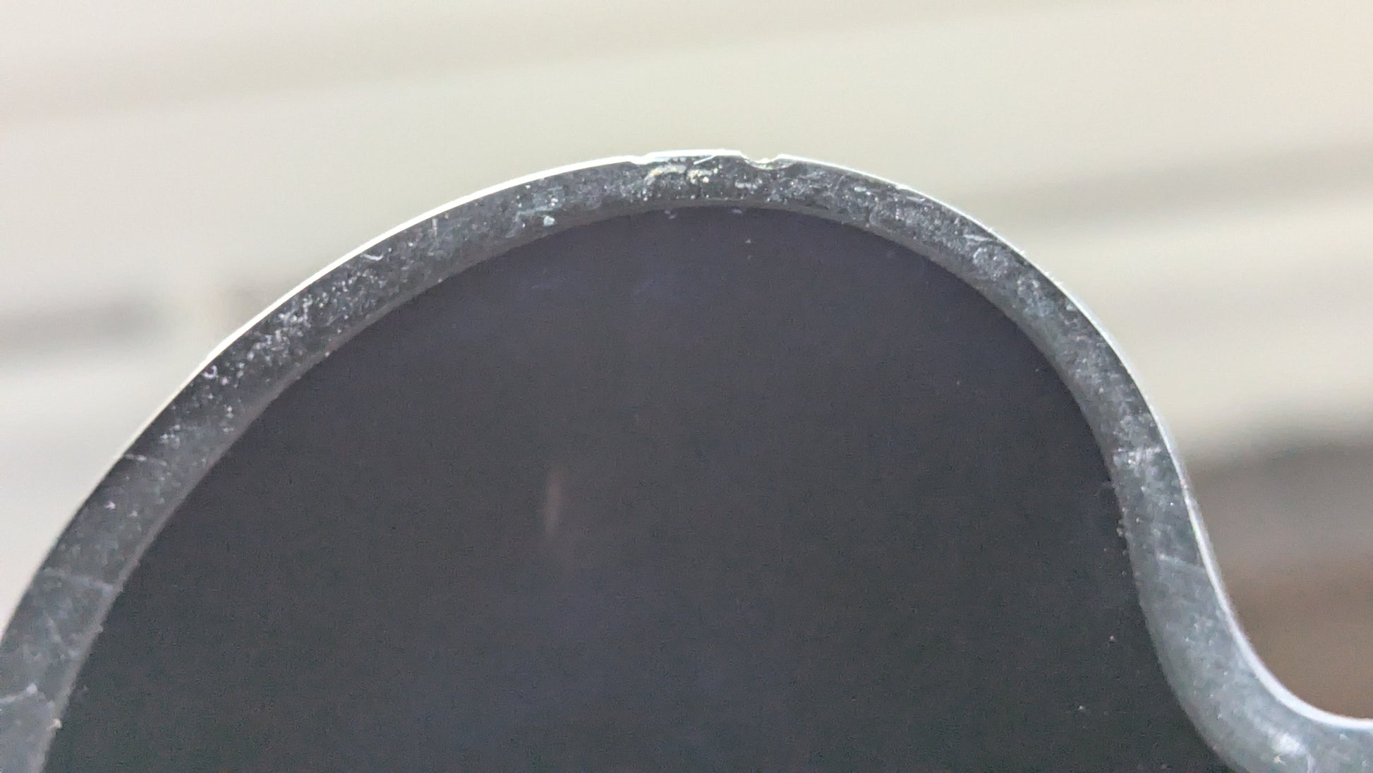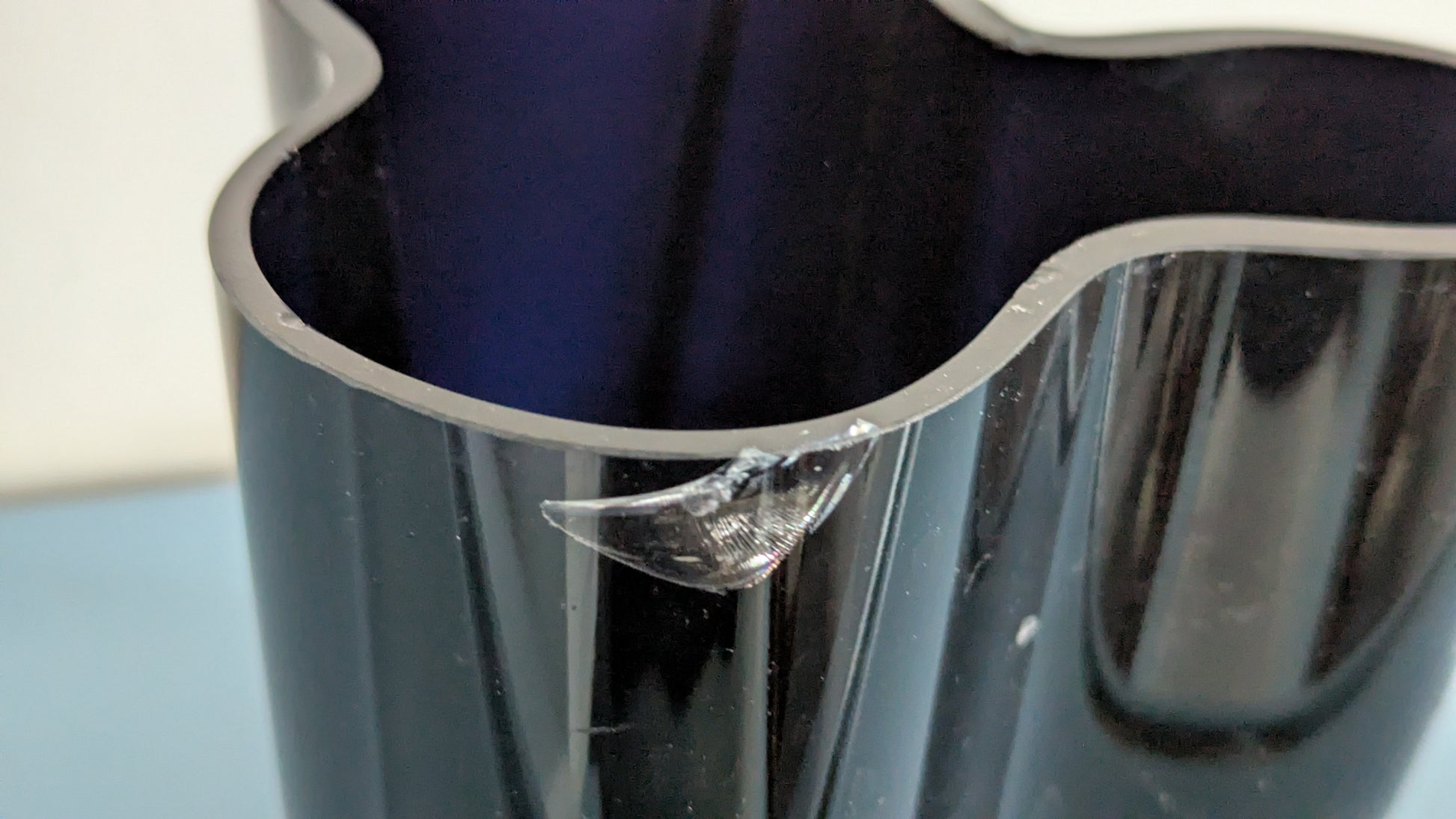 Pohjassa naarmuja siirtelystä. Yläreunan sisä- ja ulkopuolella useampia iskemiä, joista isoin iskemä erottuu kirkkaan värinsä vuoksi todella hyvin muusta maljakosta.