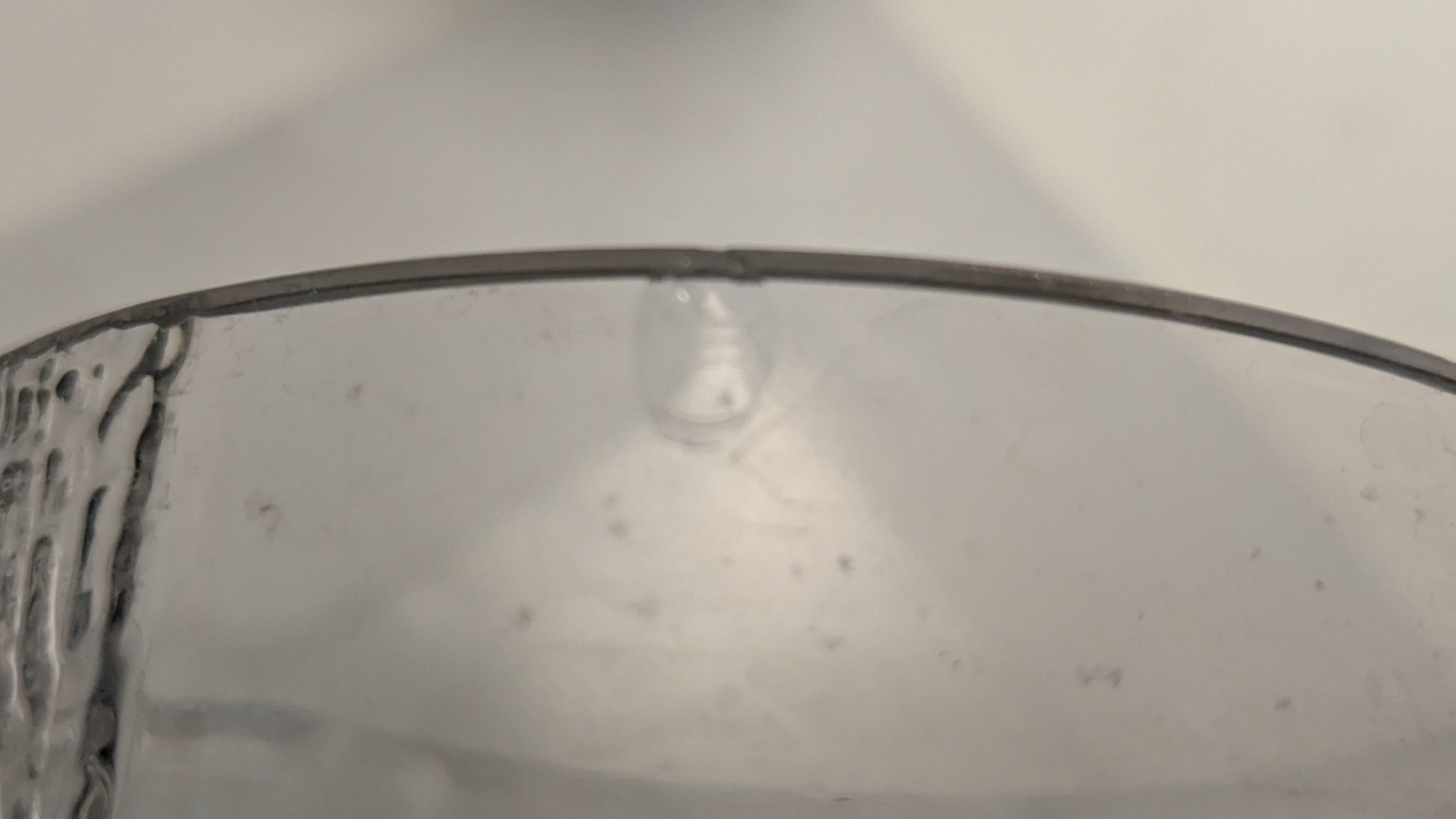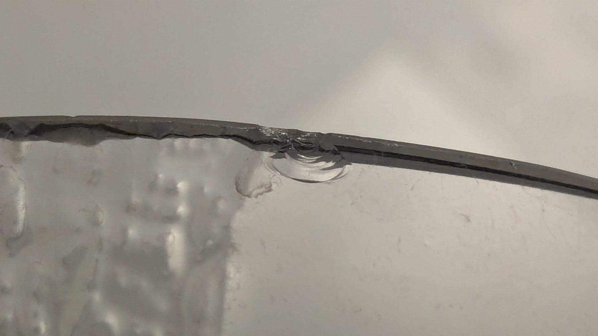 Ei halkeamia. Minimaalista käyttökulumaa. Yläreunassa kaksi iskemää, joista isompi 6mm kokoinen. Iskemät näkyvät kahdessa viimeisessä kuvassa.