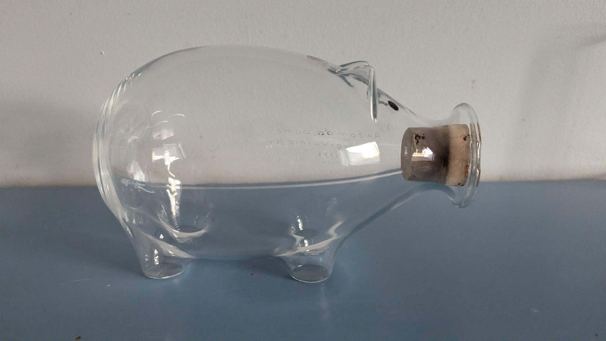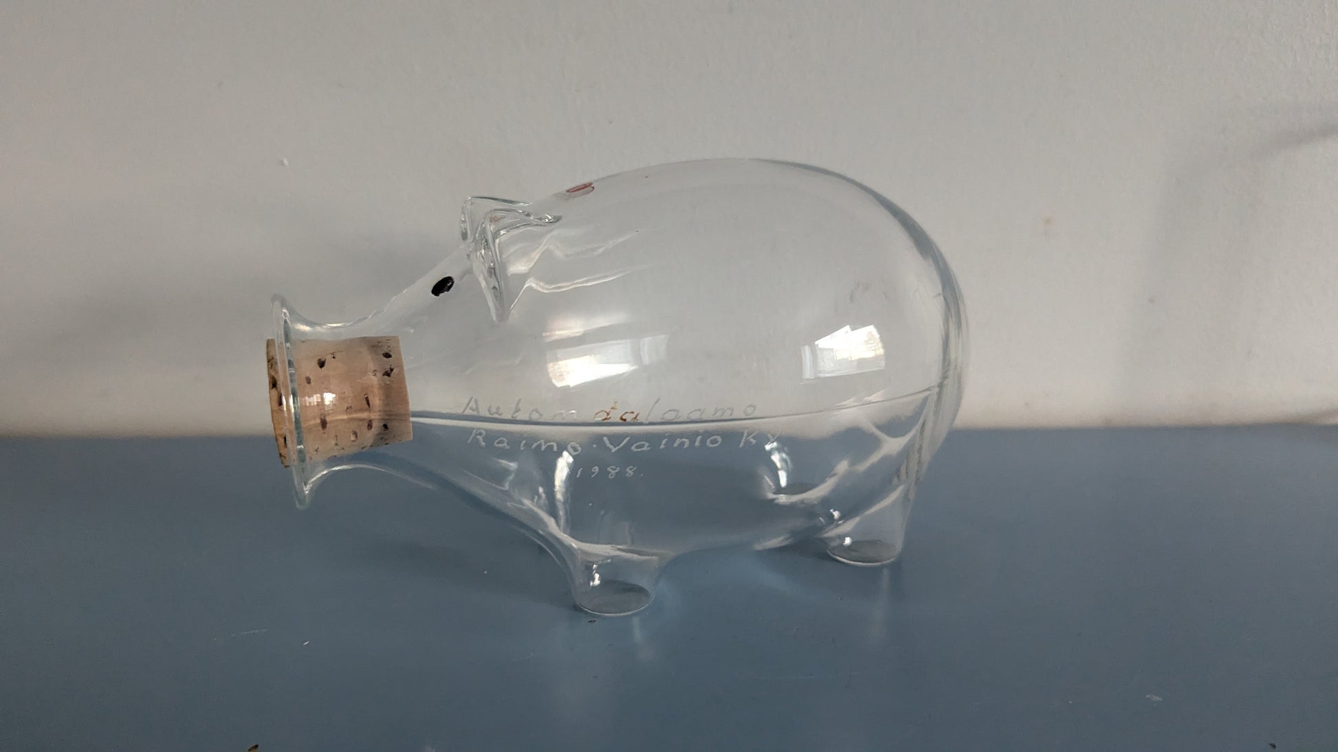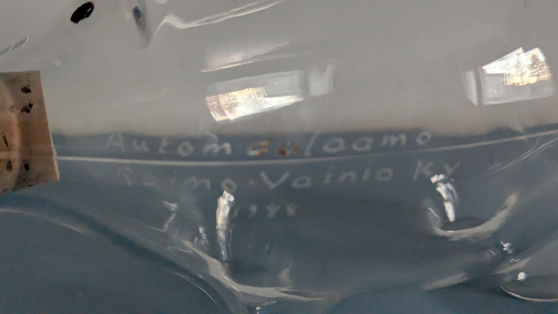 Iittalan tarra vielä tallella. Ei iskemiä tai halkeamia. Toisessa kyljessä kaiverrus "Automaalaamo Raimo Vainio Ky 1988"