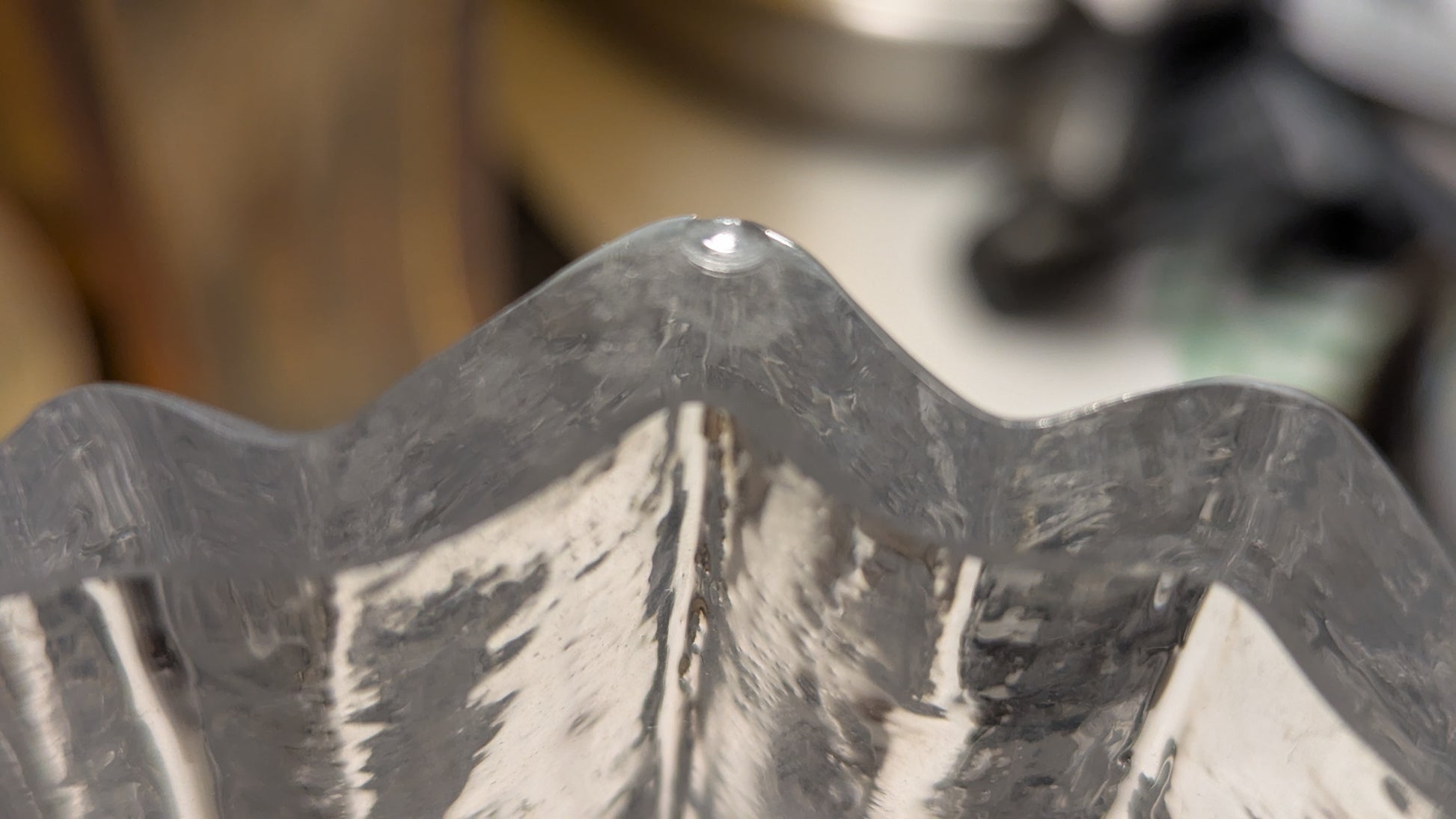Ei halkeamia. Pohjassa naarmuja siirtelystä. Yläreunan sisäpuolelle 5mm iskemä ja ulkopuolella 3mm iskemä. Iskemät näkyvät kahdessa viimeisessä kuvassa.