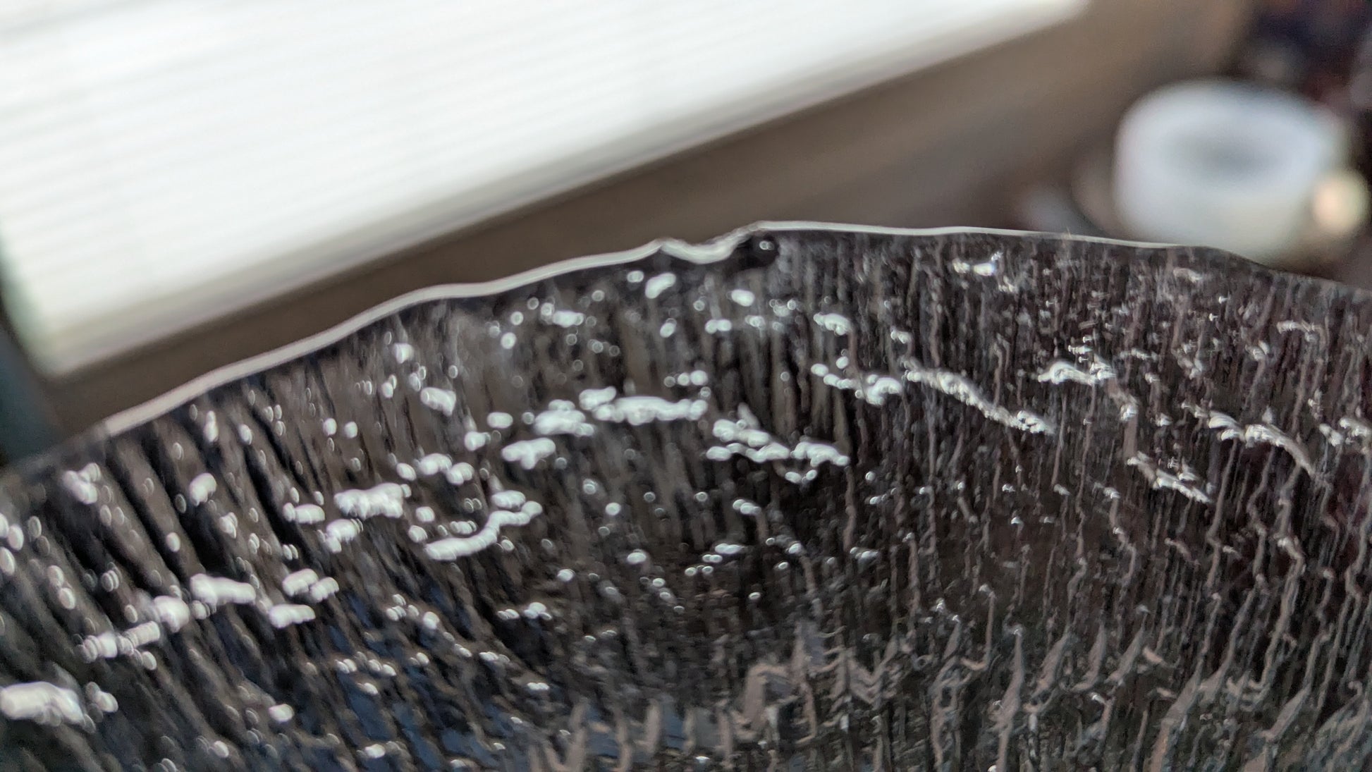 Ei iskemiä tai halkeamia. Yhden kulhon yläreunassa viimeisen kuvan mukainen 3mm iskemä.