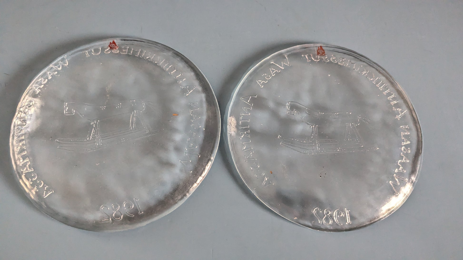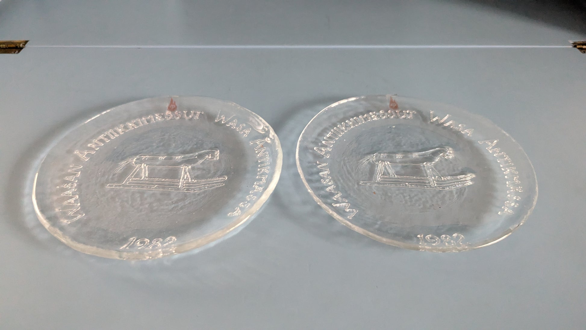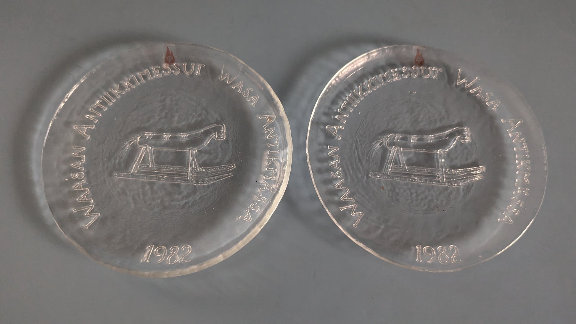 Vaasan vuoden 1982 antiikkimessuille valmistetut lautaset. Molemmissa lautasissa vielä tarrat paikalla. Tarroissa yrityksen logo ja teksti Lasipaja Koskenkorva Handmade in Finland
