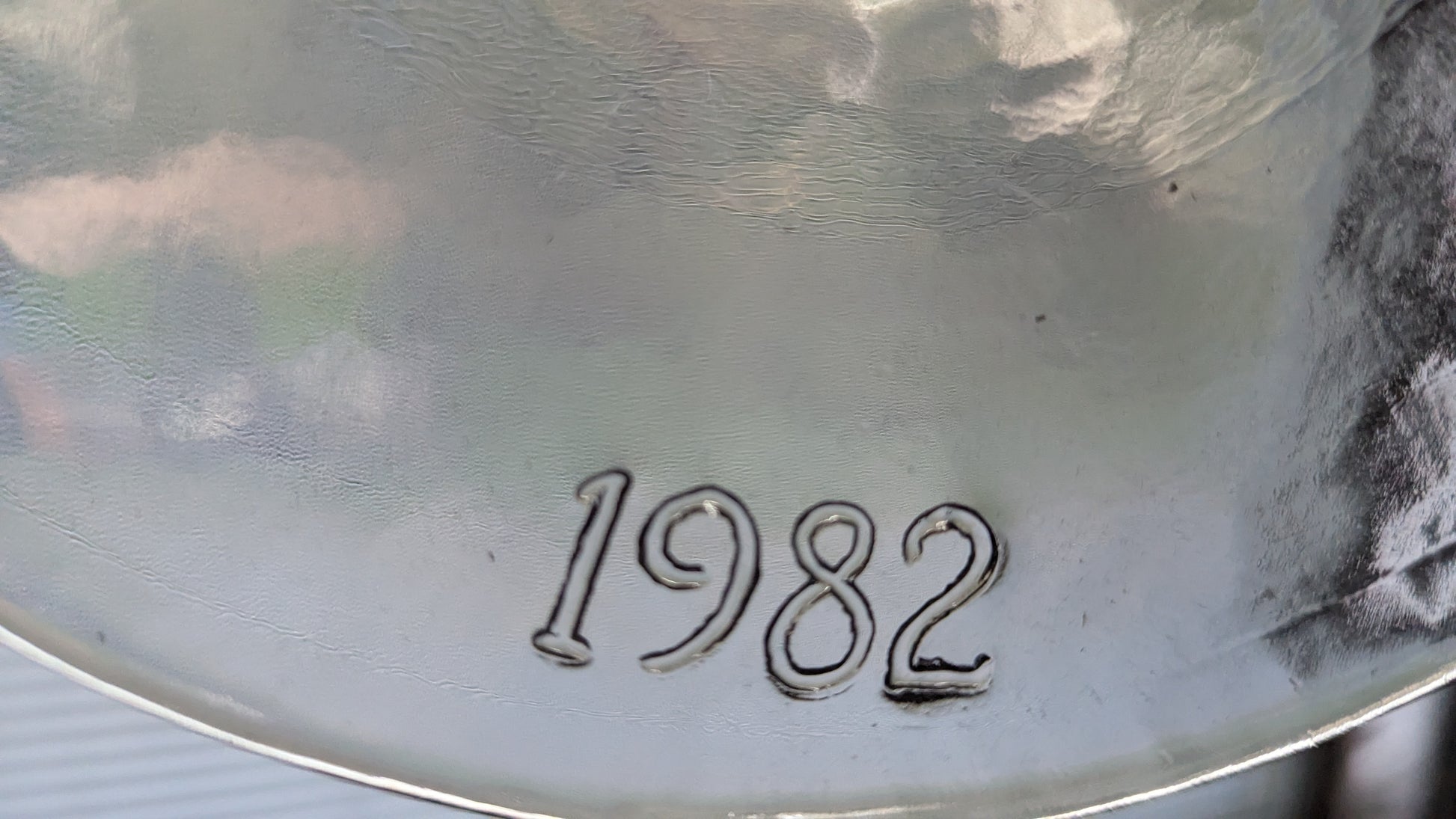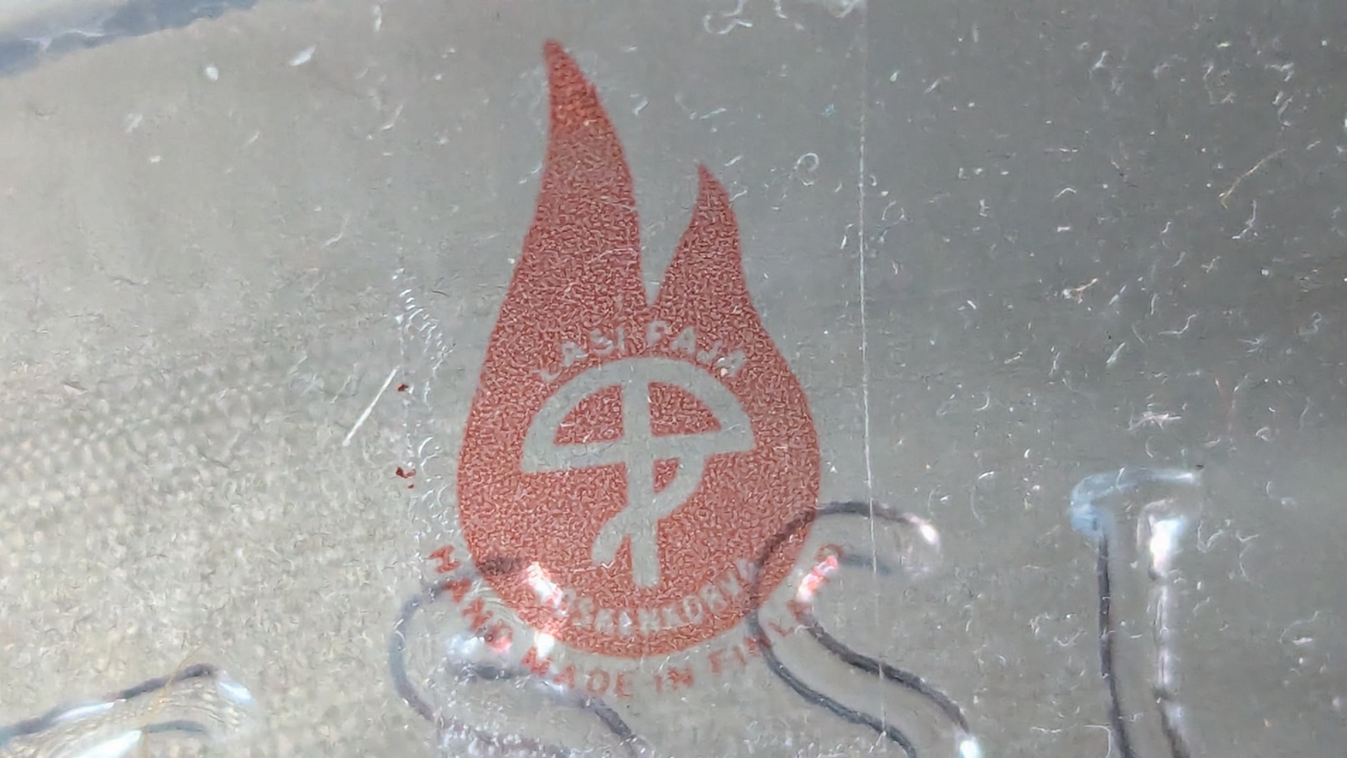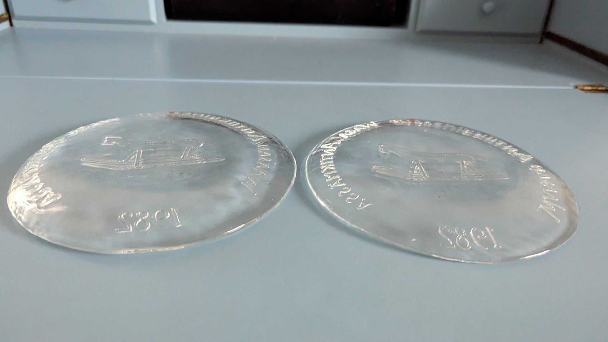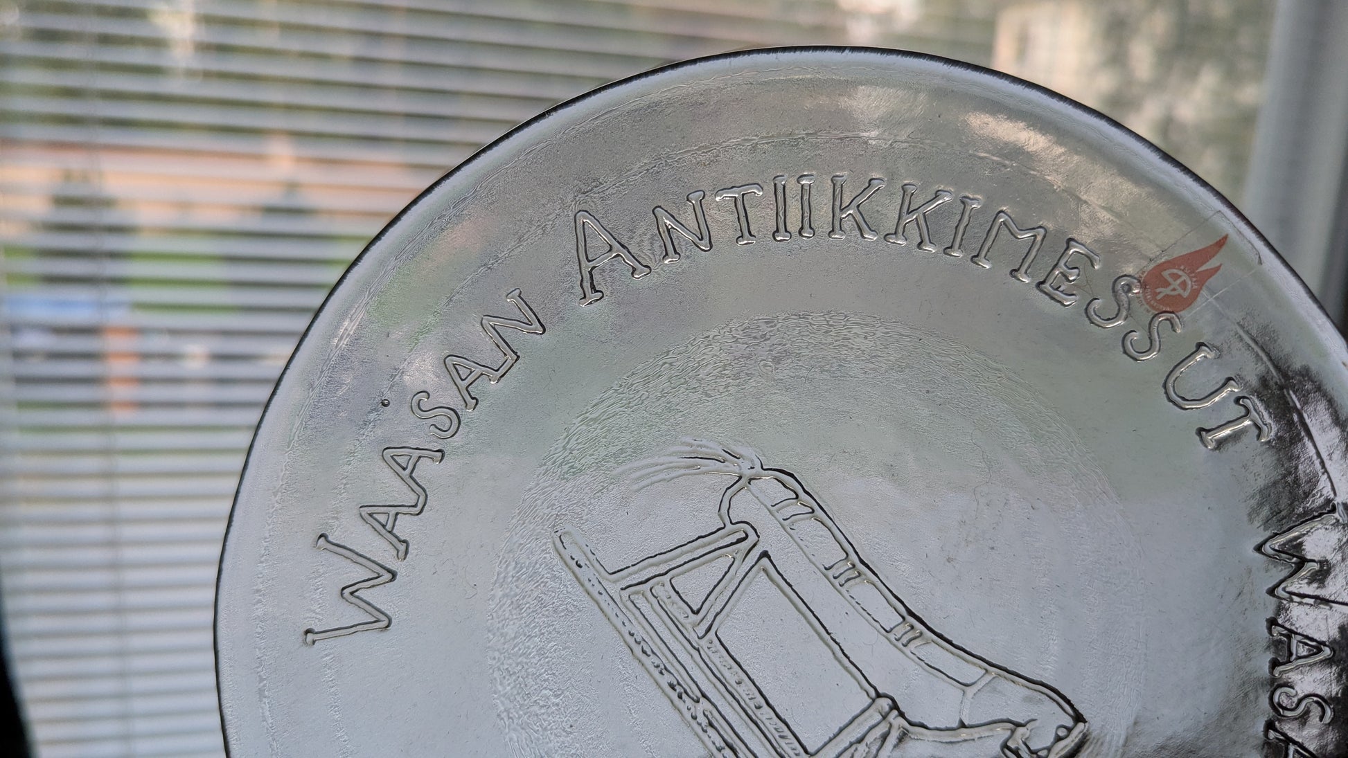 Vaasan vuoden 1982 antiikkimessuille valmistetut lautaset. Molemmissa lautasissa vielä tarrat paikalla. Tarroissa yrityksen logo ja teksti Lasipaja Koskenkorva Handmade in Finland