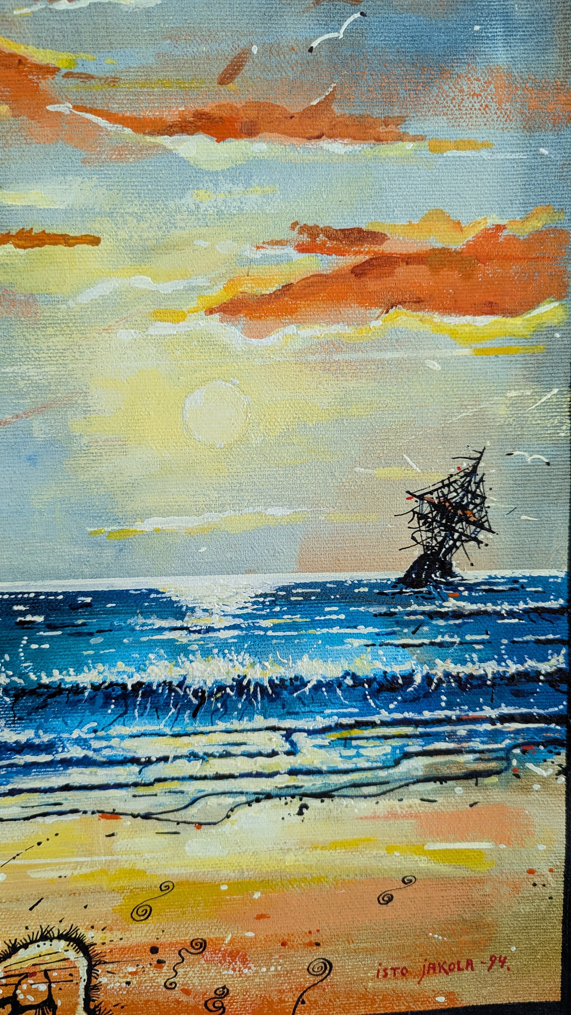 Isto Jakolan signeeraama sekatekniikkatyö (akryyli/öljyväri) vuodelta 1994.