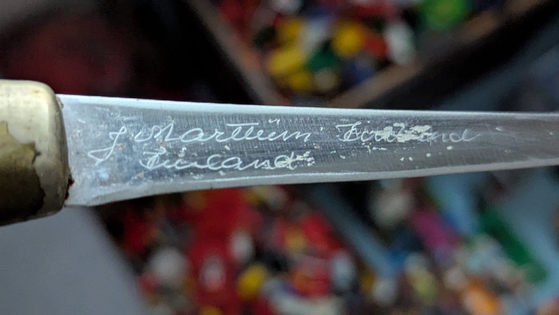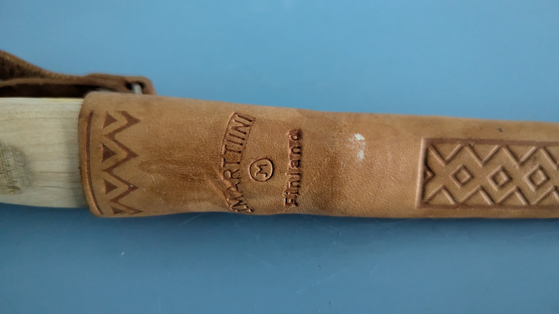 Tupessa Marttiinin logo ja teksti J.Marttiini Finland. Puukossa teksti J.Marttiini Finland.