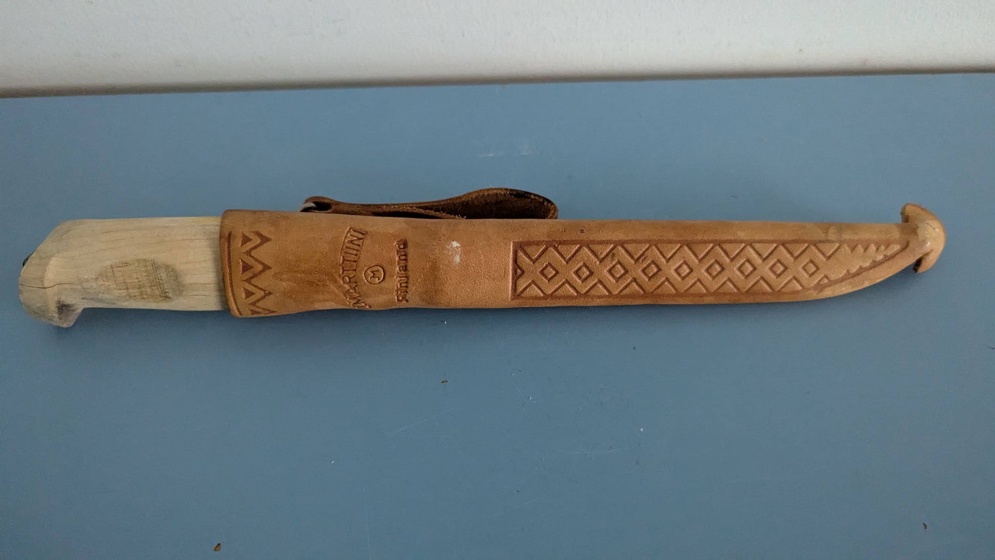 Tuppi ehjä. Jonkin verran kulumaa. Puukon kahvasta lakkaus kulunut lähes kokonaan pois. Kahvassa myös halkeama mutta terä ei heilu eikä vaikuta muutenkaan käyttöön. Lisäksi kahvaan tehty syvennyt ilmeisesti paremman otteen saamiseksi. Nuo näkyy viimeisessä kuvassa.