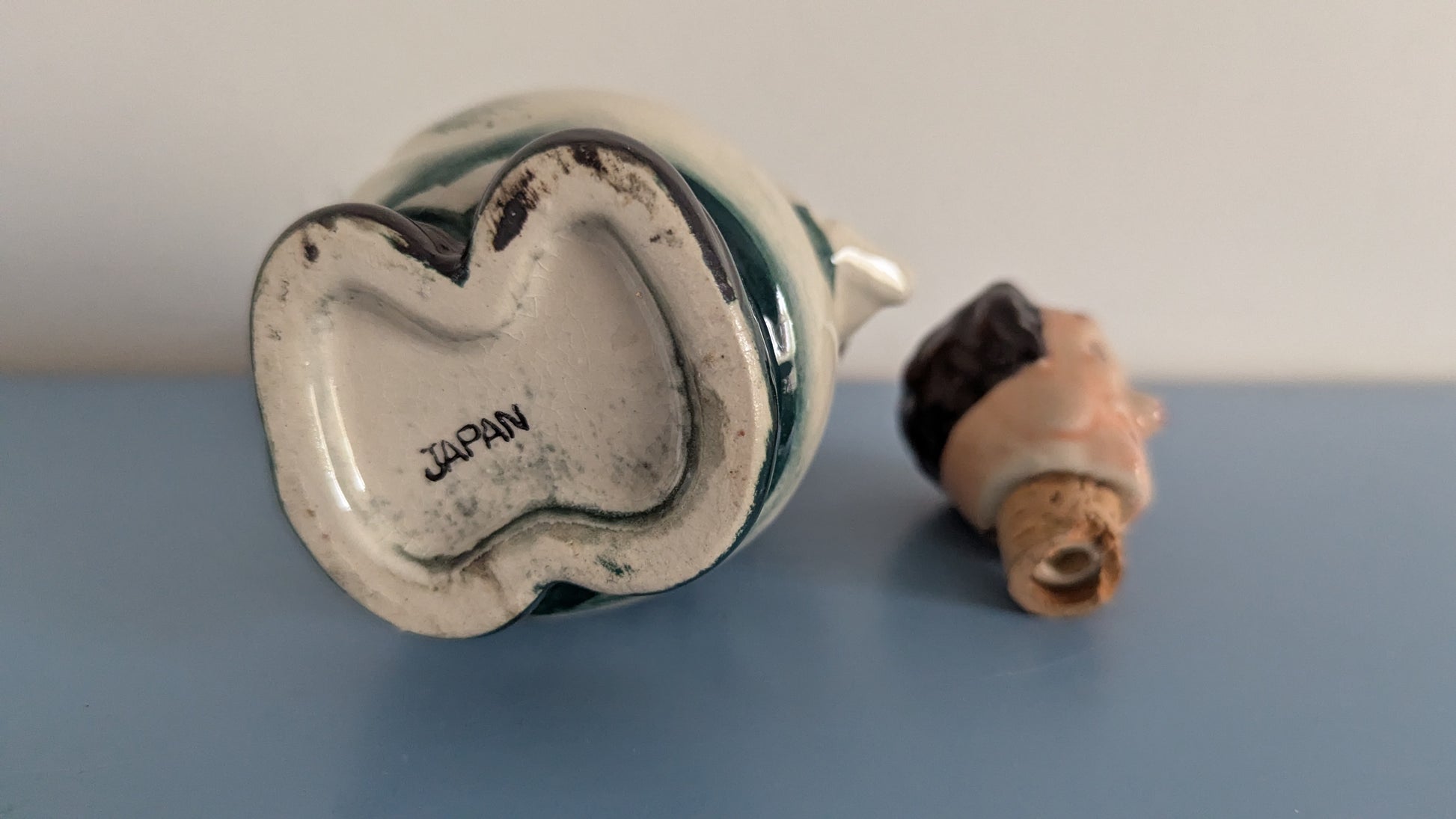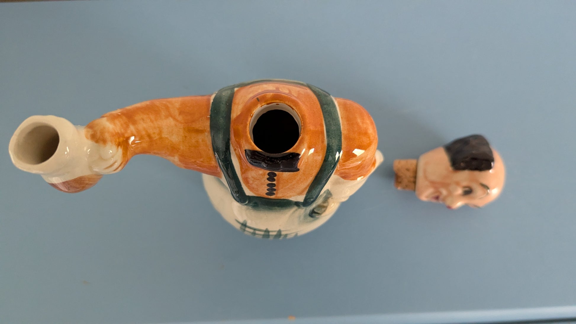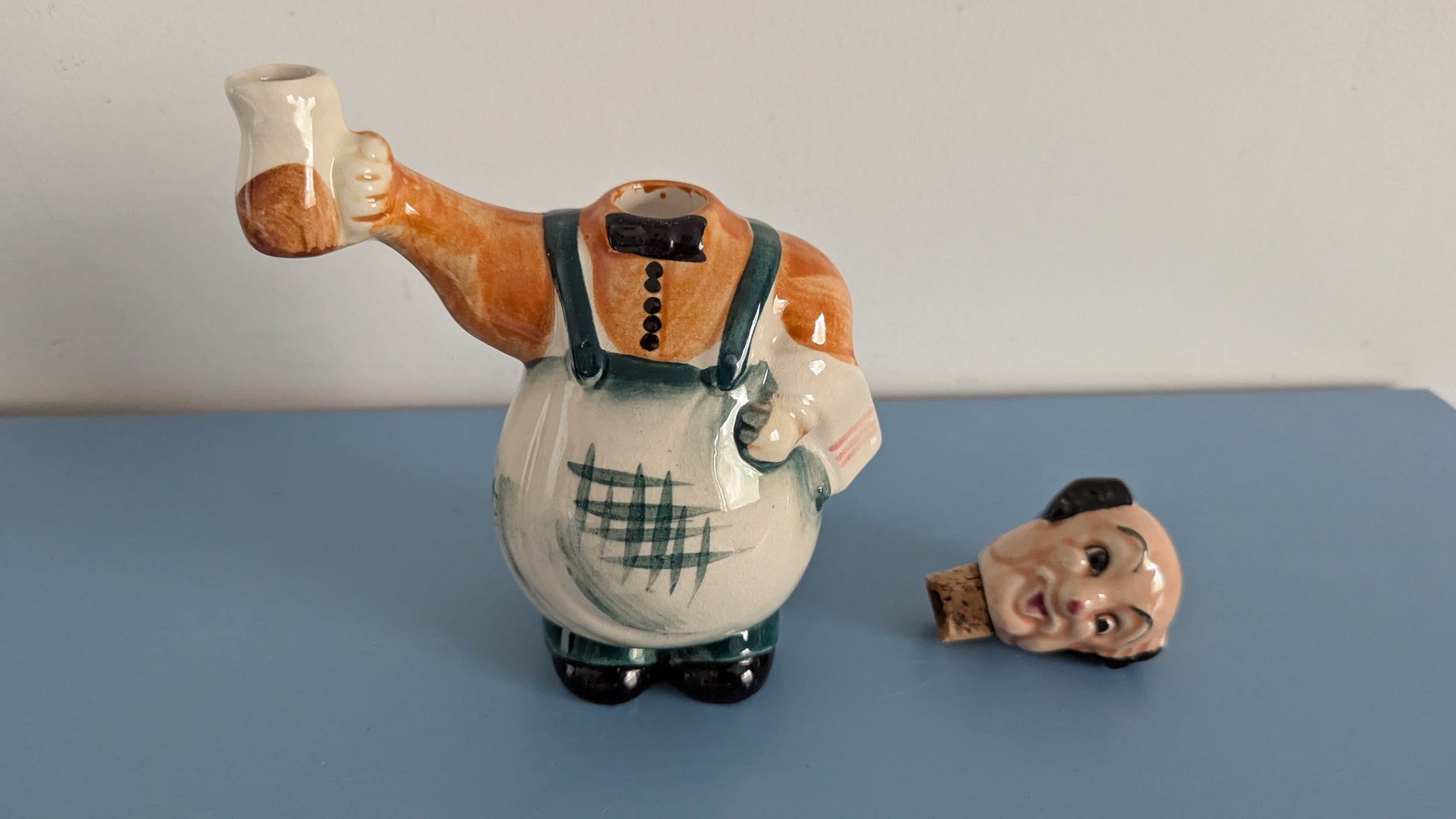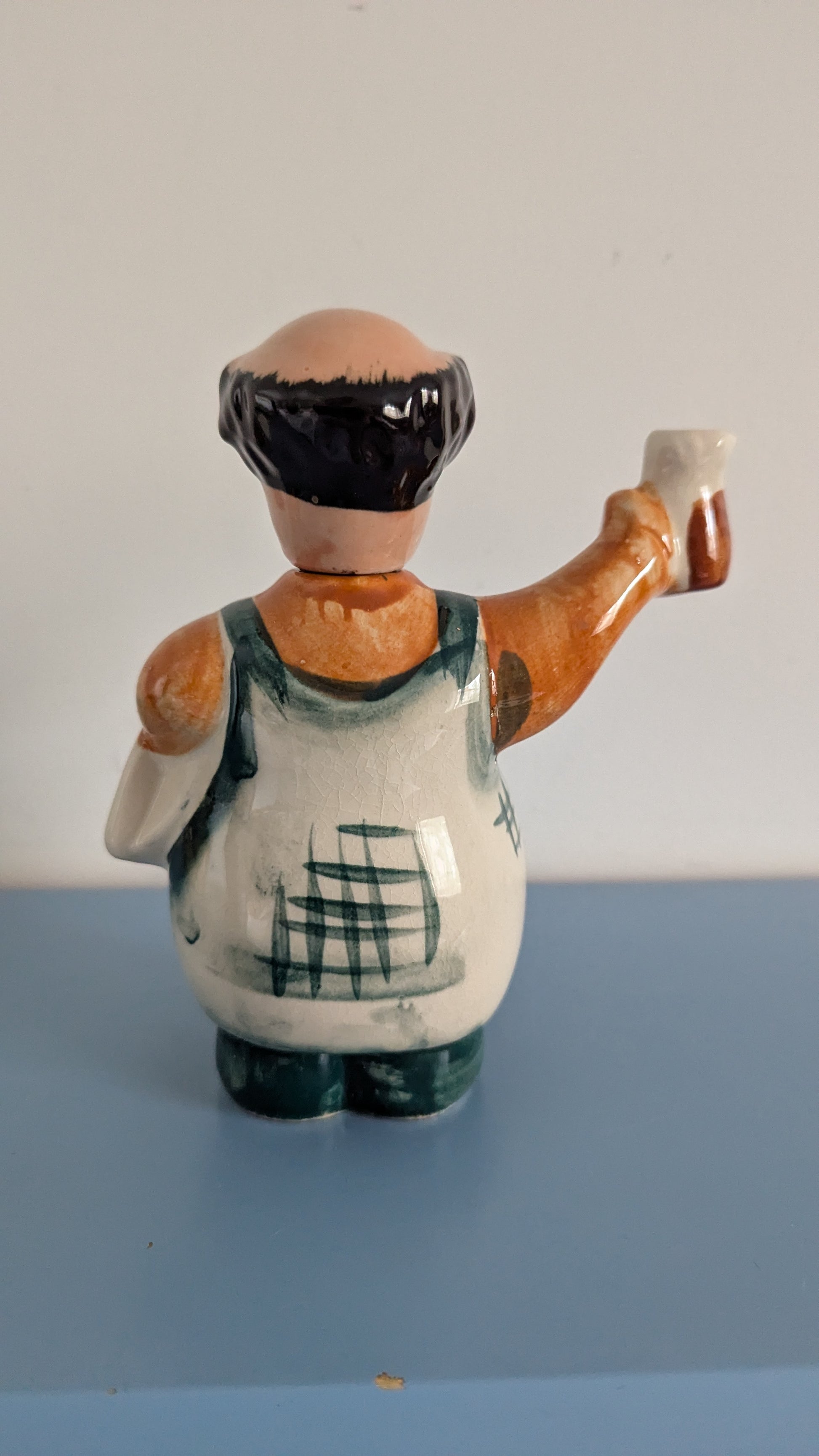 Tarjoilijan pää toimii korkkina. Juoma tulee ulos tarjoilijan kädessä olevasta kannusta. Tarjoilija käsin maalattu. Maalauksen päällä lasite. Valmistajasta ei tarkempaa tietoa. Valmistettu todennäköisesti 1950-1960-luvulla.