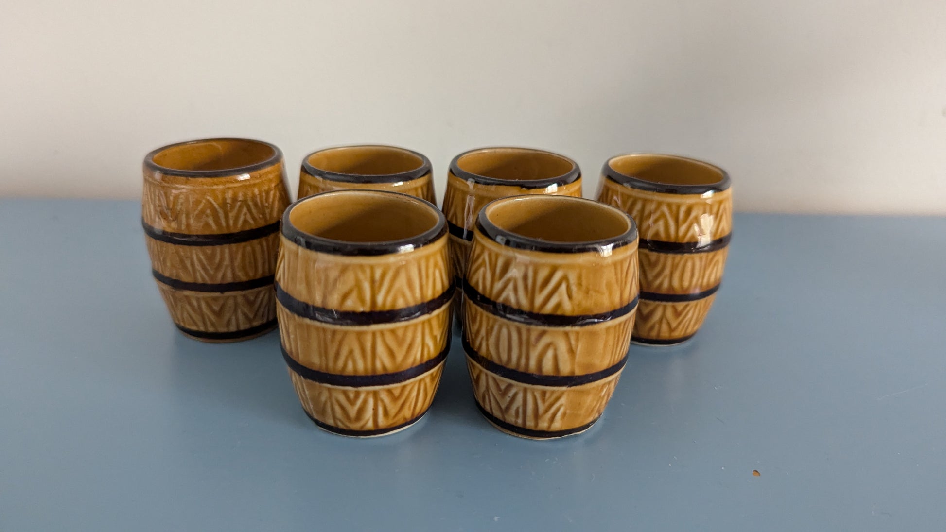 Ei iskemiä, halkeamia tai naarmuja. Tynnyreistä vain yhden pohjassa selkeästi teksti Japan. Muiden pohjasta se kulunut osittain tai kokonaan pois.