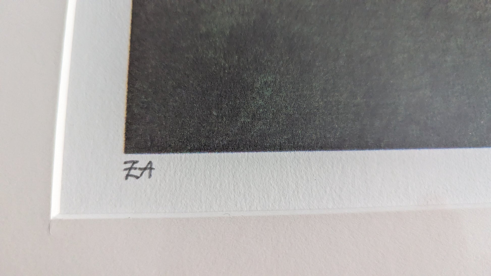 Teoksen alla merkintä EA eli kyseessä ns. taiteilijasarjan vedos. Taiteilija voi ottaa omaan käyttöönsä pienen sarjan vedoksia. Taiteilijasarja saa olla enintään 10% varsinaisesta vedossarjasta. Lisäksi alla taiteilijan signeeraus ja vuosiluku -03.