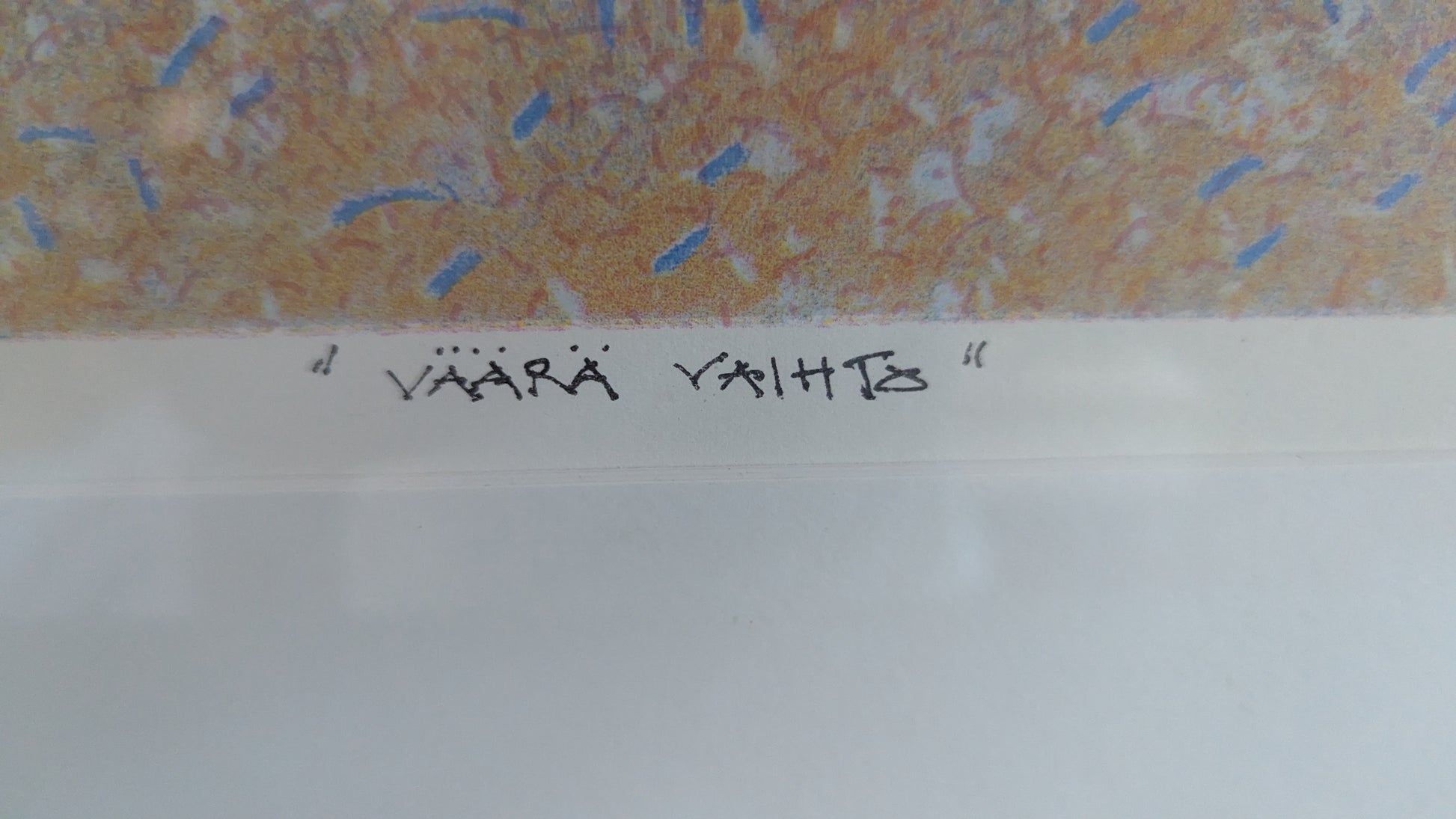 Juha Soisalon signeeraama Väärä vaihto niminen grafiikka vuodelta 1997.