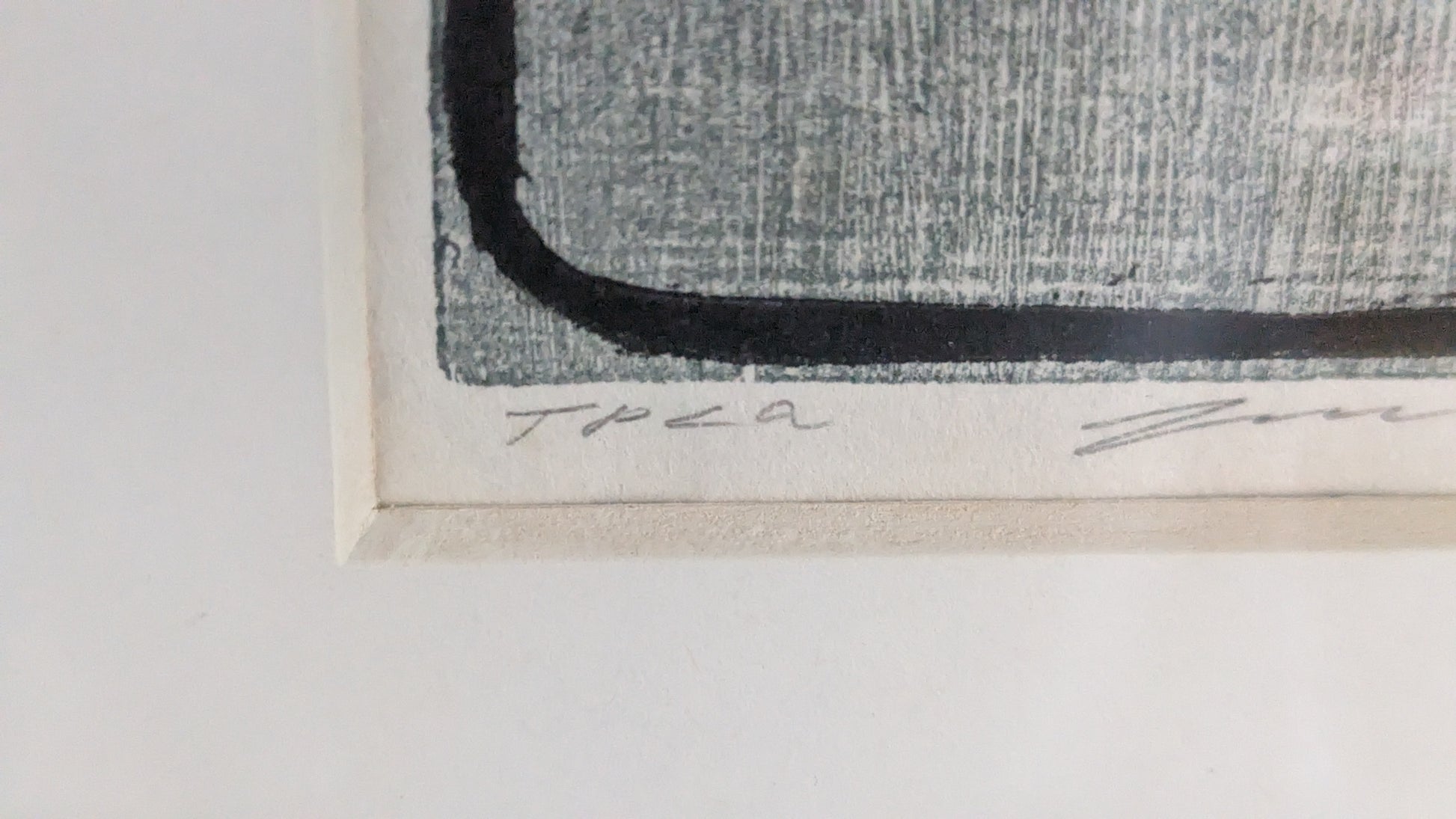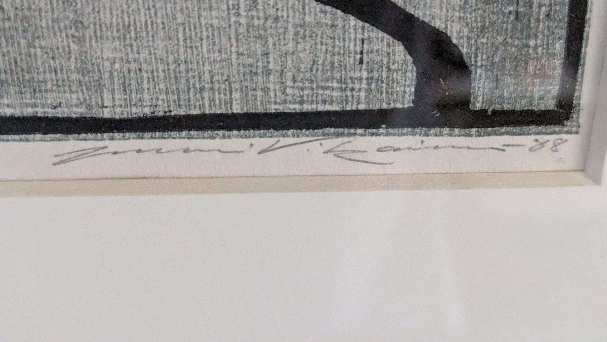 Teoksen alla vedosmerkintä Tpl'a eli kyseessä taiteilijan itsensä tekemä vedos, taiteilijan signeeraus, ja vuosiluku 1988.