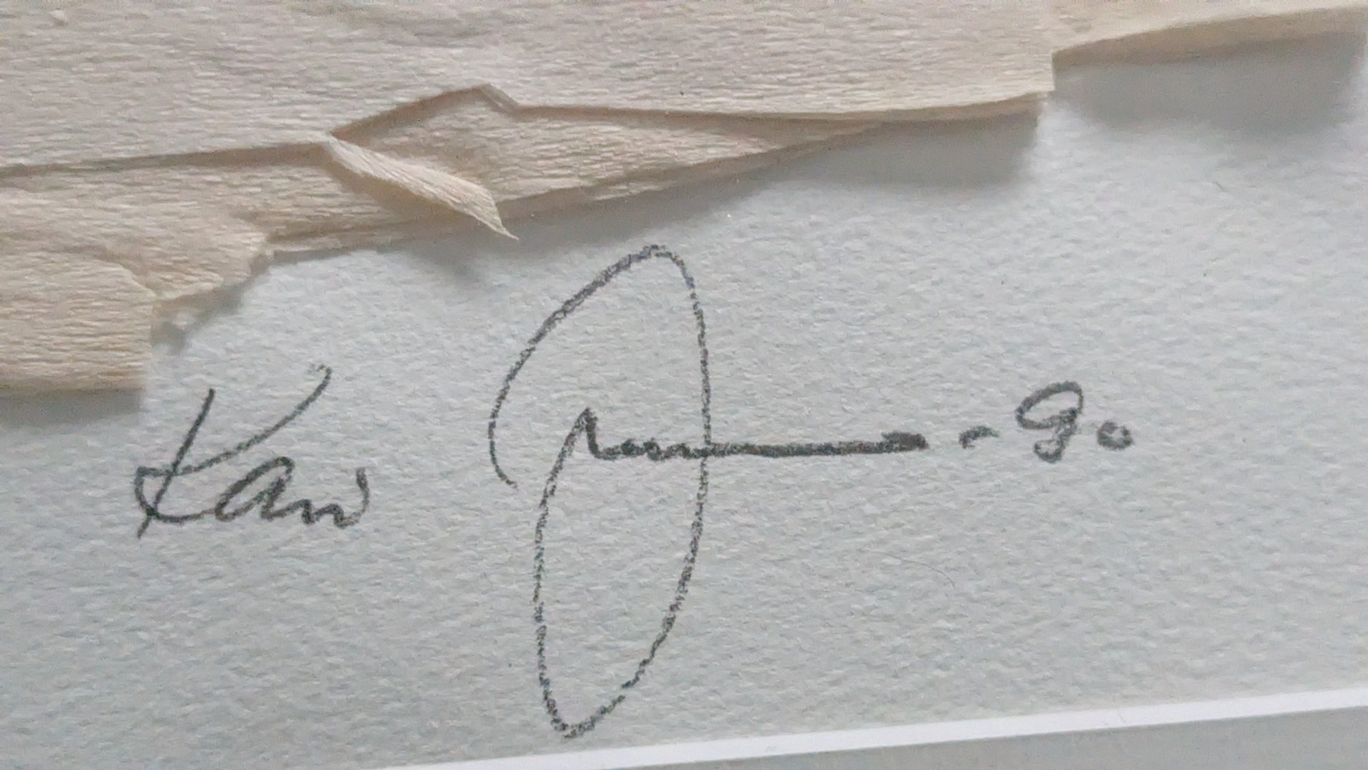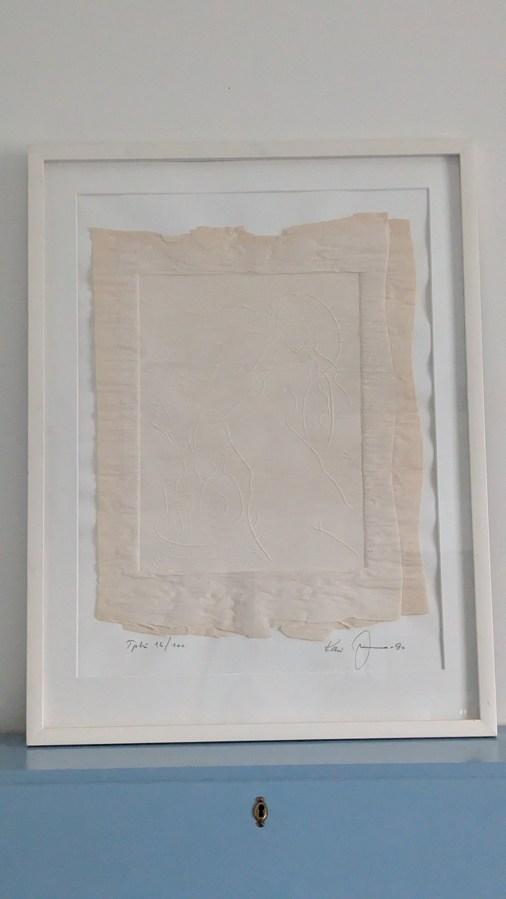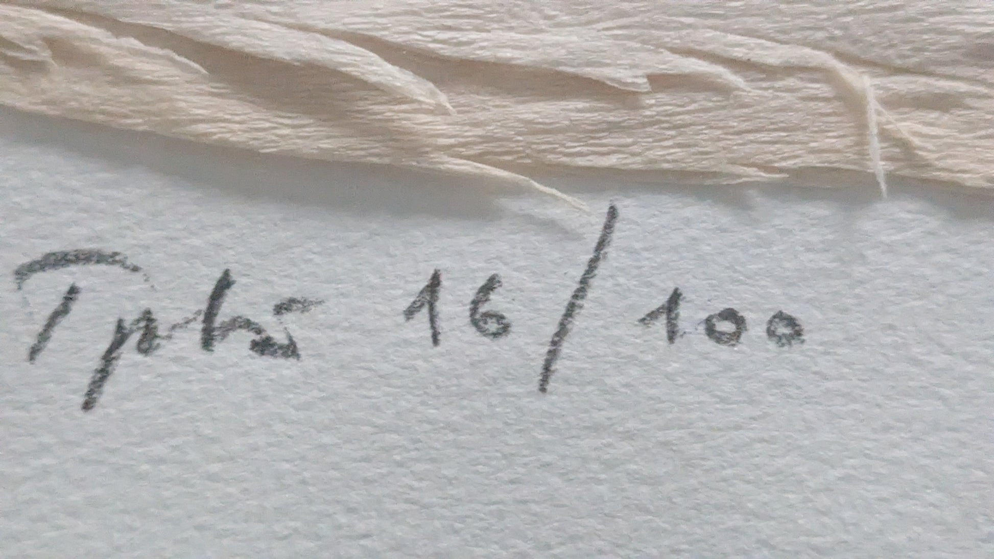 Teoksen alla vedosmerkintä Tpl'a eli kyseessä taiteilijan itsensä tekemä vedos. Lisäksi numerointi 16/100, taiteilijan signeeraus ja vuosiluku -90.