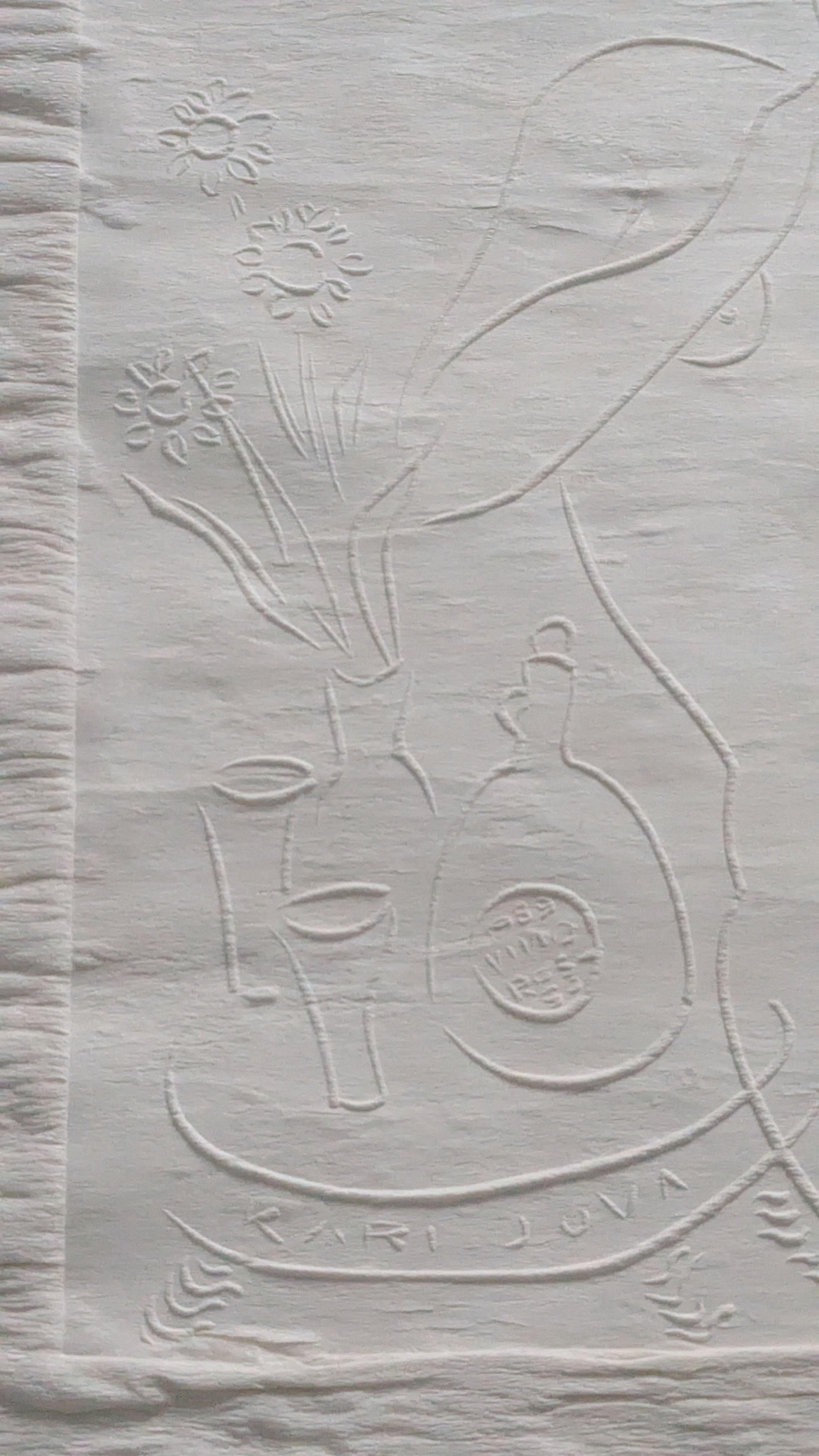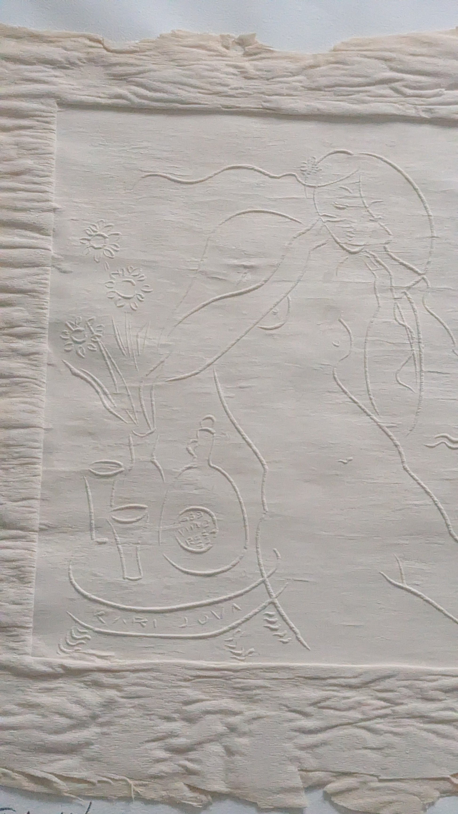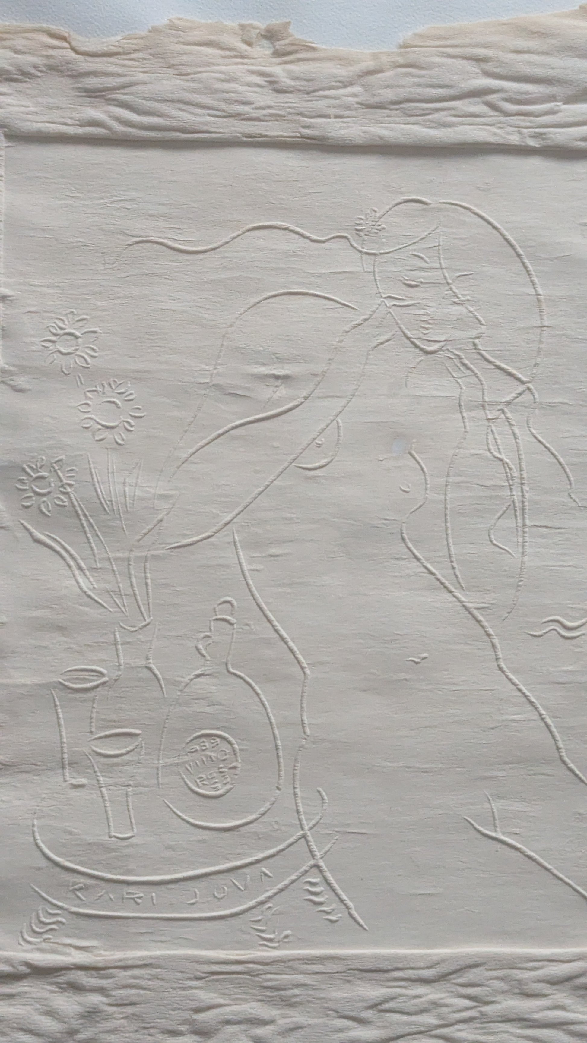 Kuvassa on alaston nainen. Hänen vieressä pöytä jonka päällä kaksi lasia, kukkaruukku jossa kukkia ja viinipullo. Viinipullossa teksti -89 vino rosso. Pöydässä teksti Kari Juva.