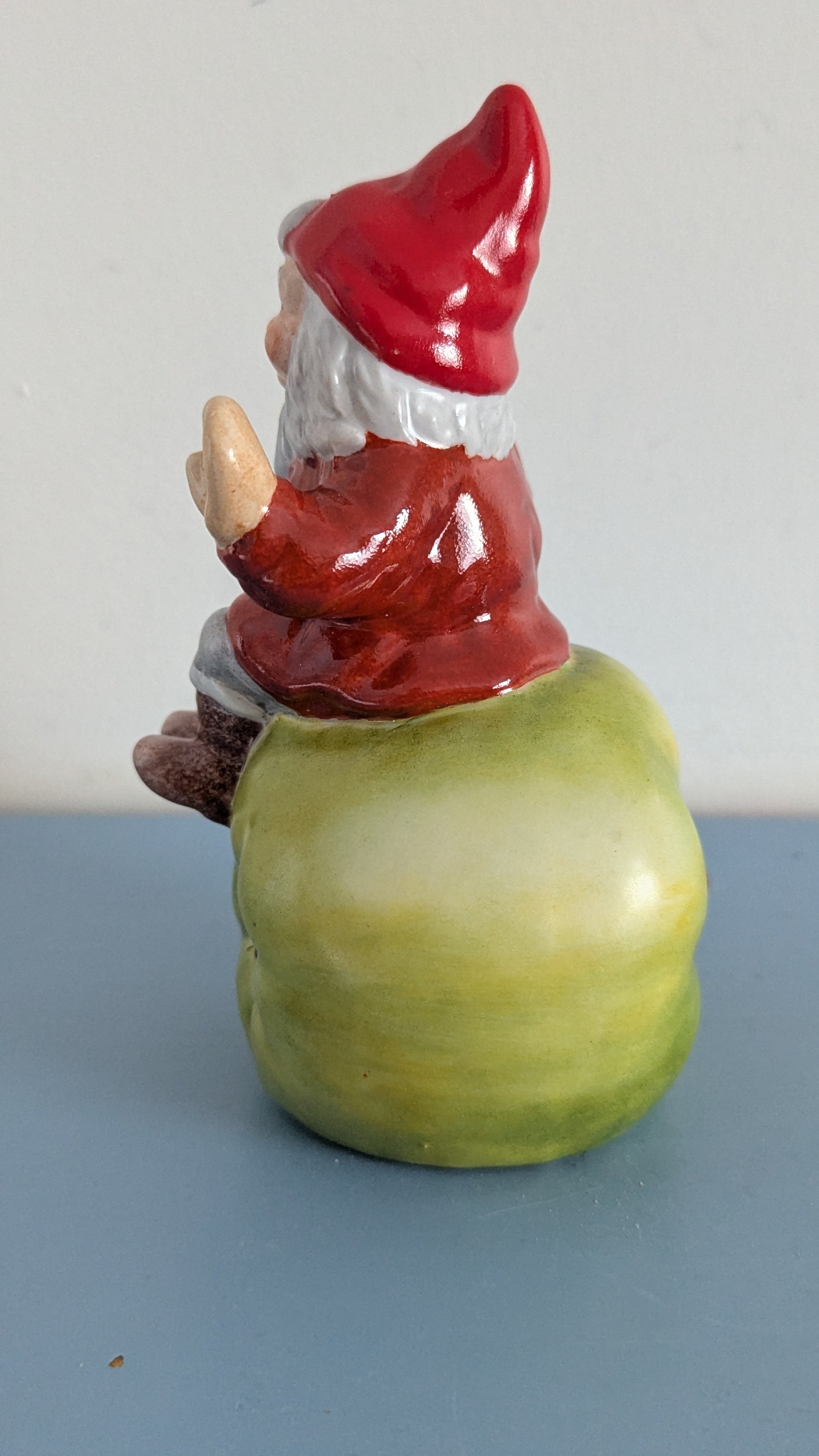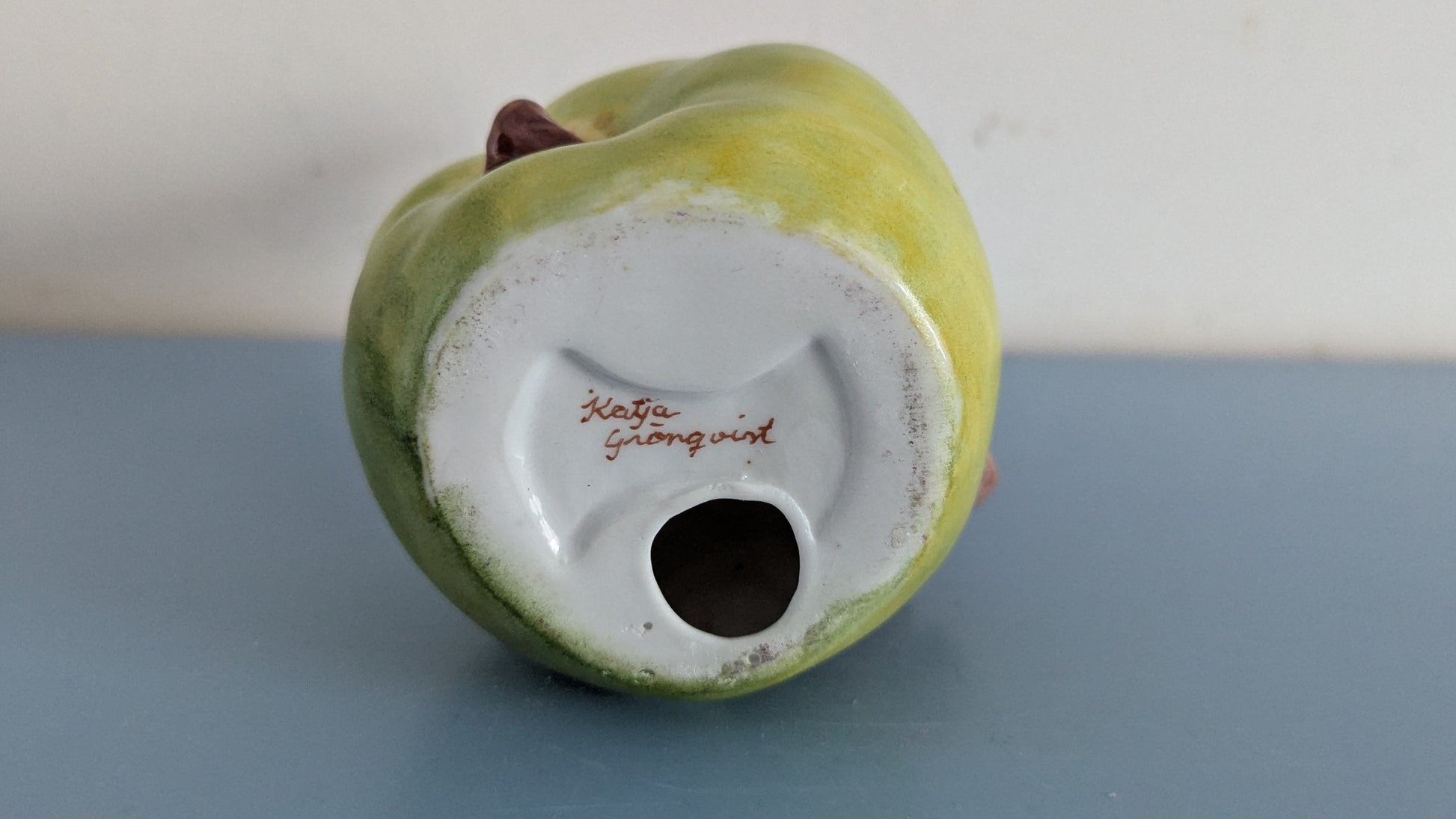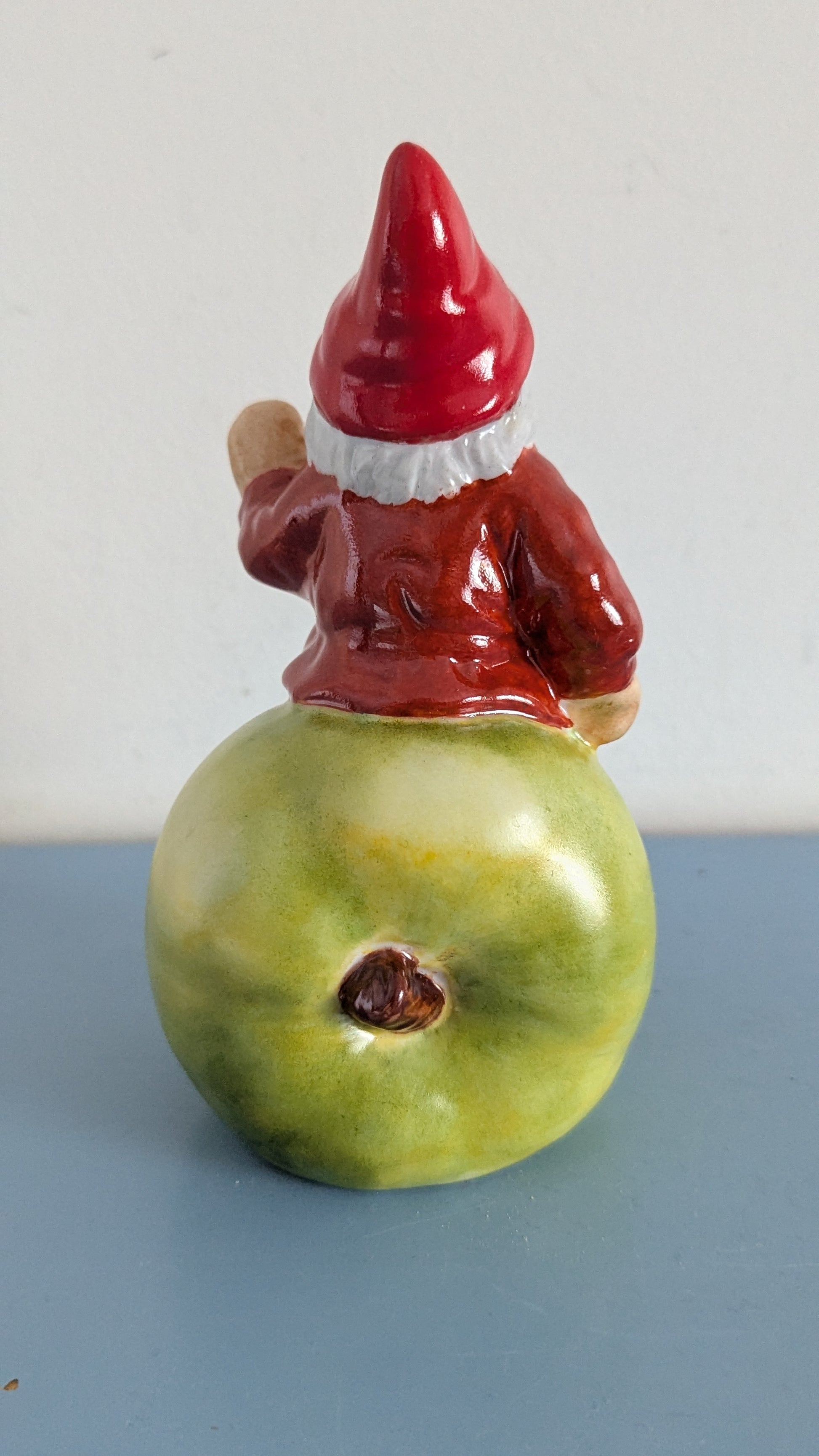Vihreän omenan päällä istuva punanuttuinen tonttu. Tontun tekijä joku muu kuin Katja Grönqvist. Hän on toiminut maalaajana.