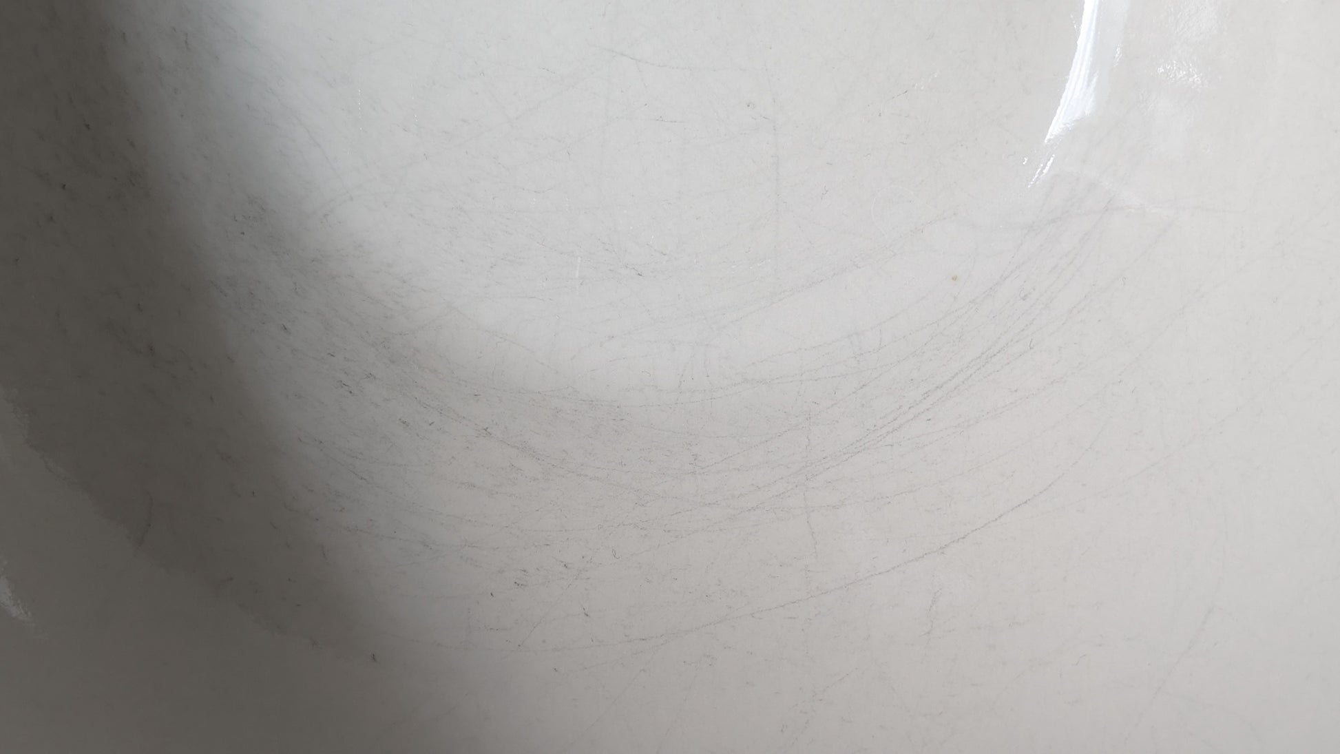 Ei iskemiä tai halkeamia. Pohjalla jälkiä metallisista ottimista.