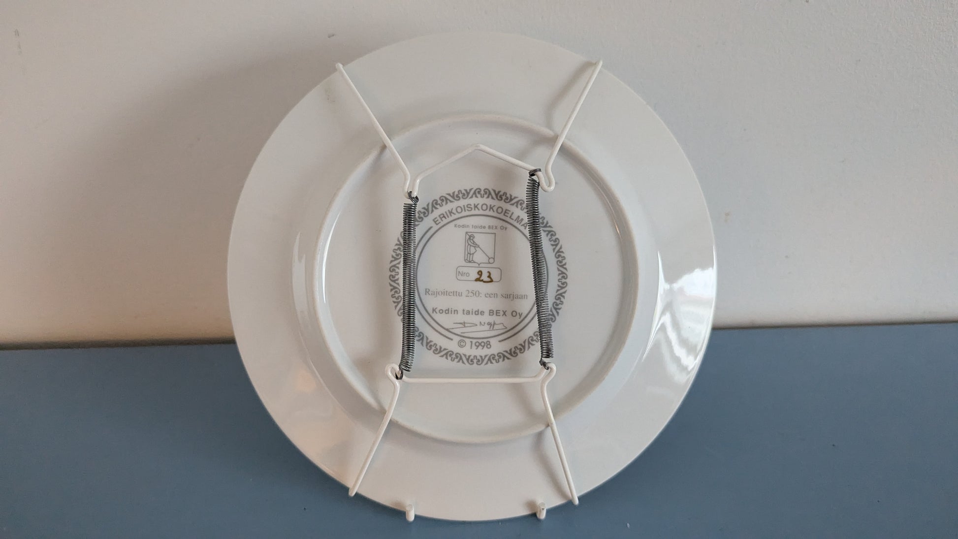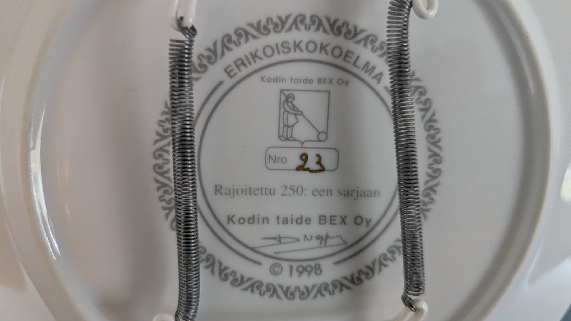 Lautasen reunassa aito kultaus. Pohjassa tekstit Erikoiskokoelma, Kodin Taide Bex Oy, Rajoitettu 250:een sarjaan, Vuosiluku 1998 sekä taiteilijan signeeraus, josta ei saa selvää. Lisäksi pohjassa numero 23 eli tämä lautanen on 250 lautasen sarjasta numero 23.