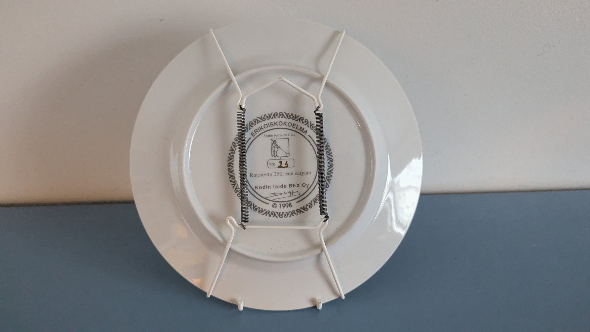 Lautasen reunassa aito kultaus. Pohjassa tekstit Erikoiskokoelma, Kodin Taide Bex Oy, Rajoitettu 250:een sarjaan, Vuosiluku 1998 sekä taiteilijan signeeraus, josta ei saa selvää. Lisäksi pohjassa numero 23 eli tämä lautanen on 250 lautasen sarjasta numero 23.