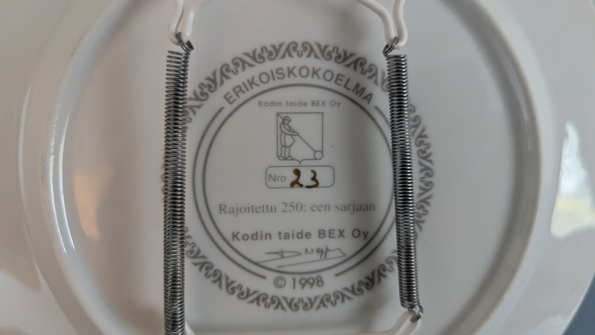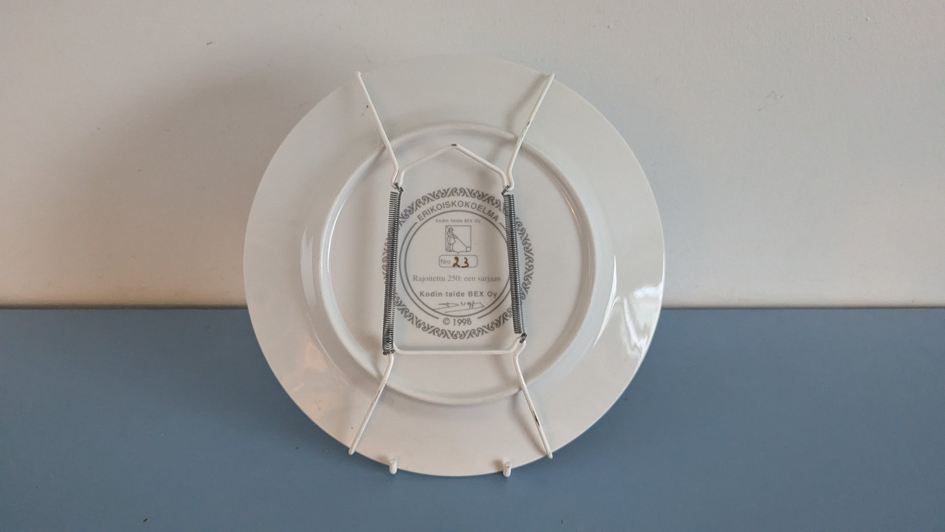 Lautasen reunassa aito kultaus. Pohjassa tekstit Erikoiskokoelma, Kodin Taide Bex Oy, Rajoitettu 250:een sarjaan, Vuosiluku 1998 sekä taiteilijan signeeraus, josta ei saa selvää. Lisäksi pohjassa numero 23 eli tämä lautanen on 250 lautasen sarjasta numero 23.
