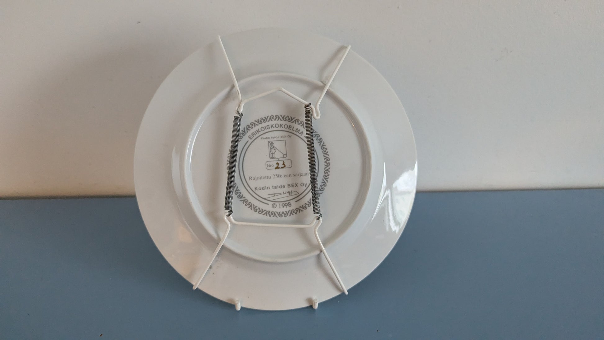 Lautasen reunassa aito kultaus. Pohjassa tekstit Erikoiskokoelma, Kodin Taide Bex Oy, Rajoitettu 250:een sarjaan, Vuosiluku 1998 sekä taiteilijan signeeraus, josta ei saa selvää. Lisäksi pohjassa numero 23 eli tämä lautanen on 250 lautasen sarjasta numero 23.