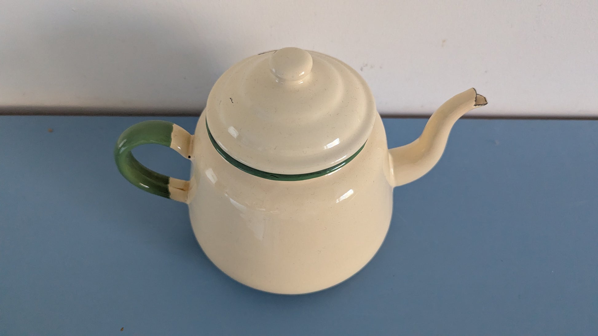 Ei lommoja. Sisältä ihan hyvässä kunnossa mutta kannun suussa emalivaurio. Muuten kannussa ei vikoja. Kannessa sitten enemmän sanomista eli kannen sisäosan reunoissa ruostetta. Lisäksi kannen ulkopuolella alareunassa emalivaurio.