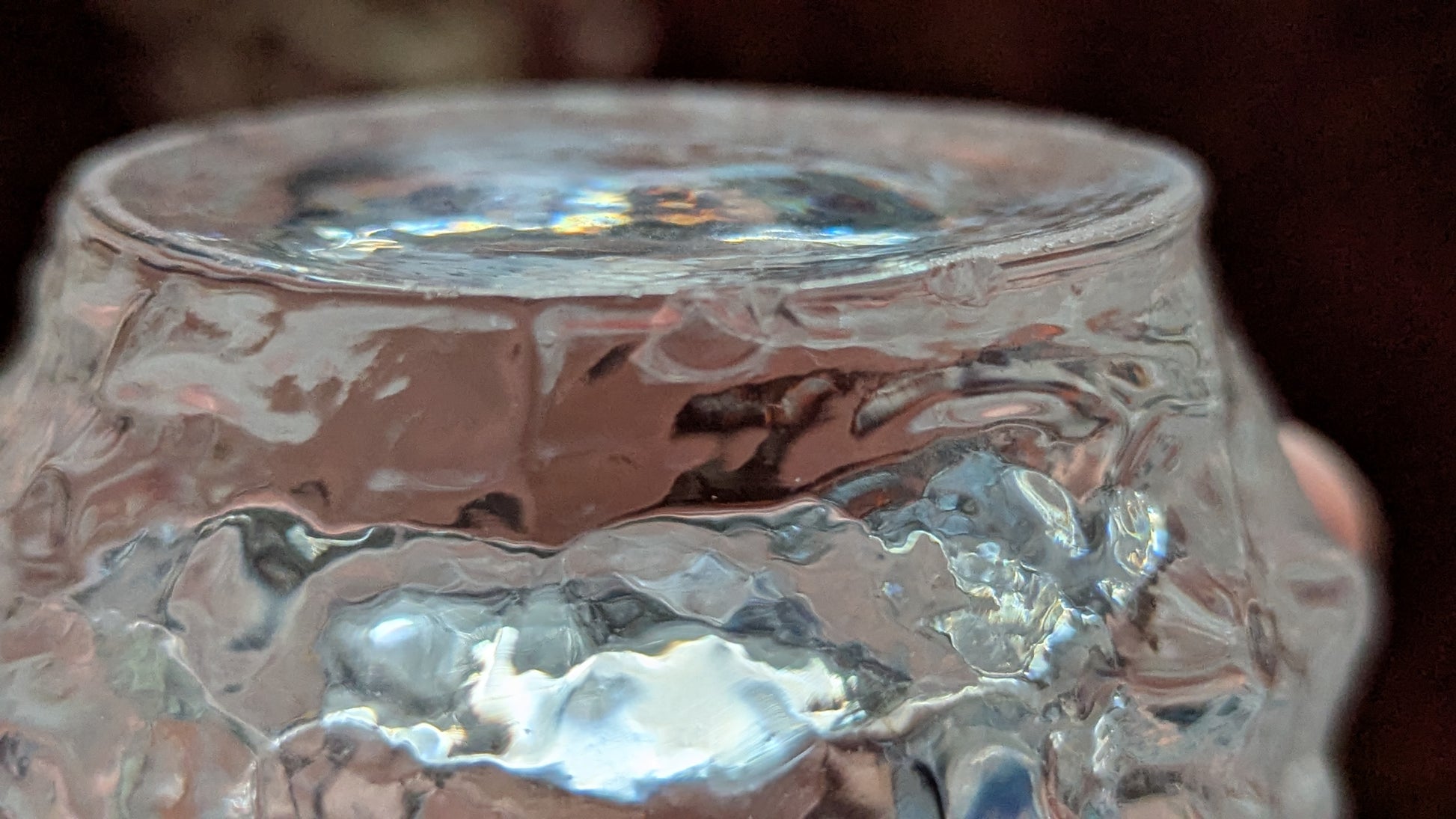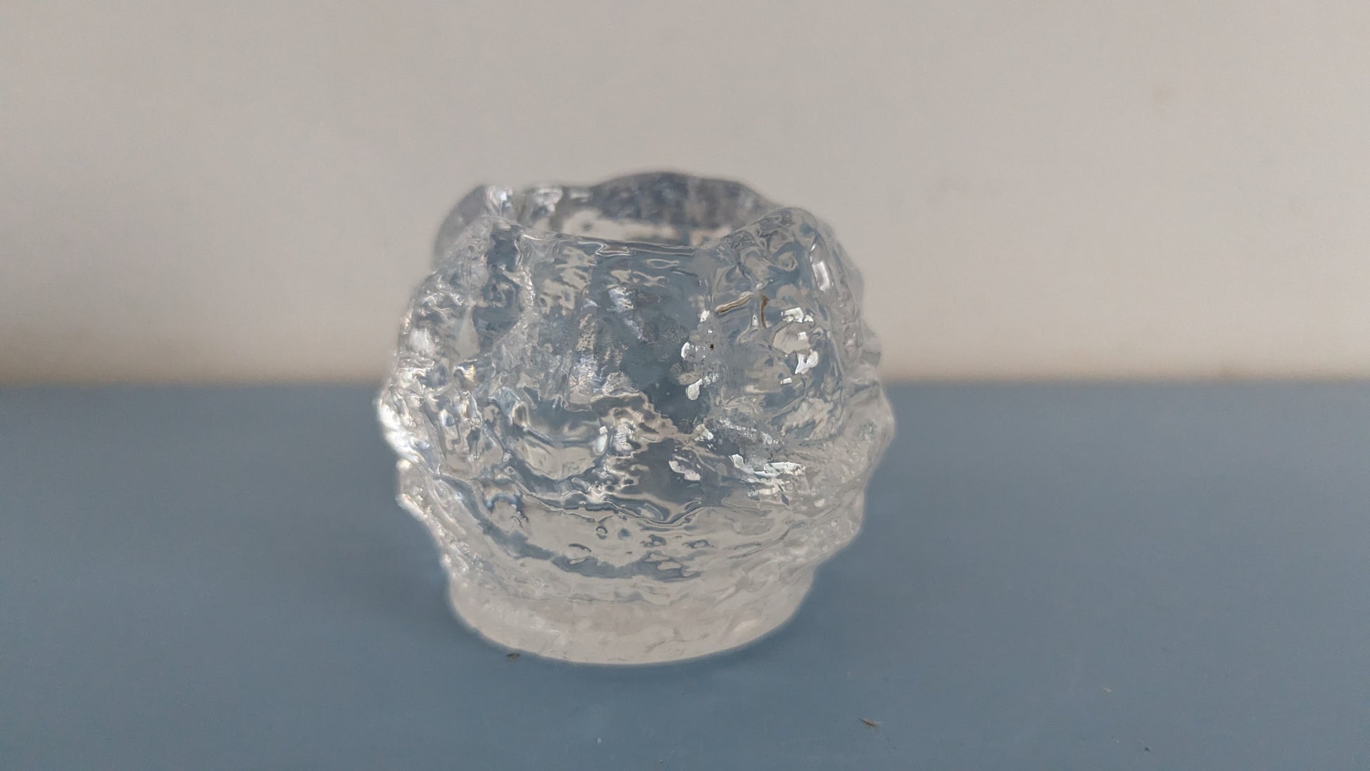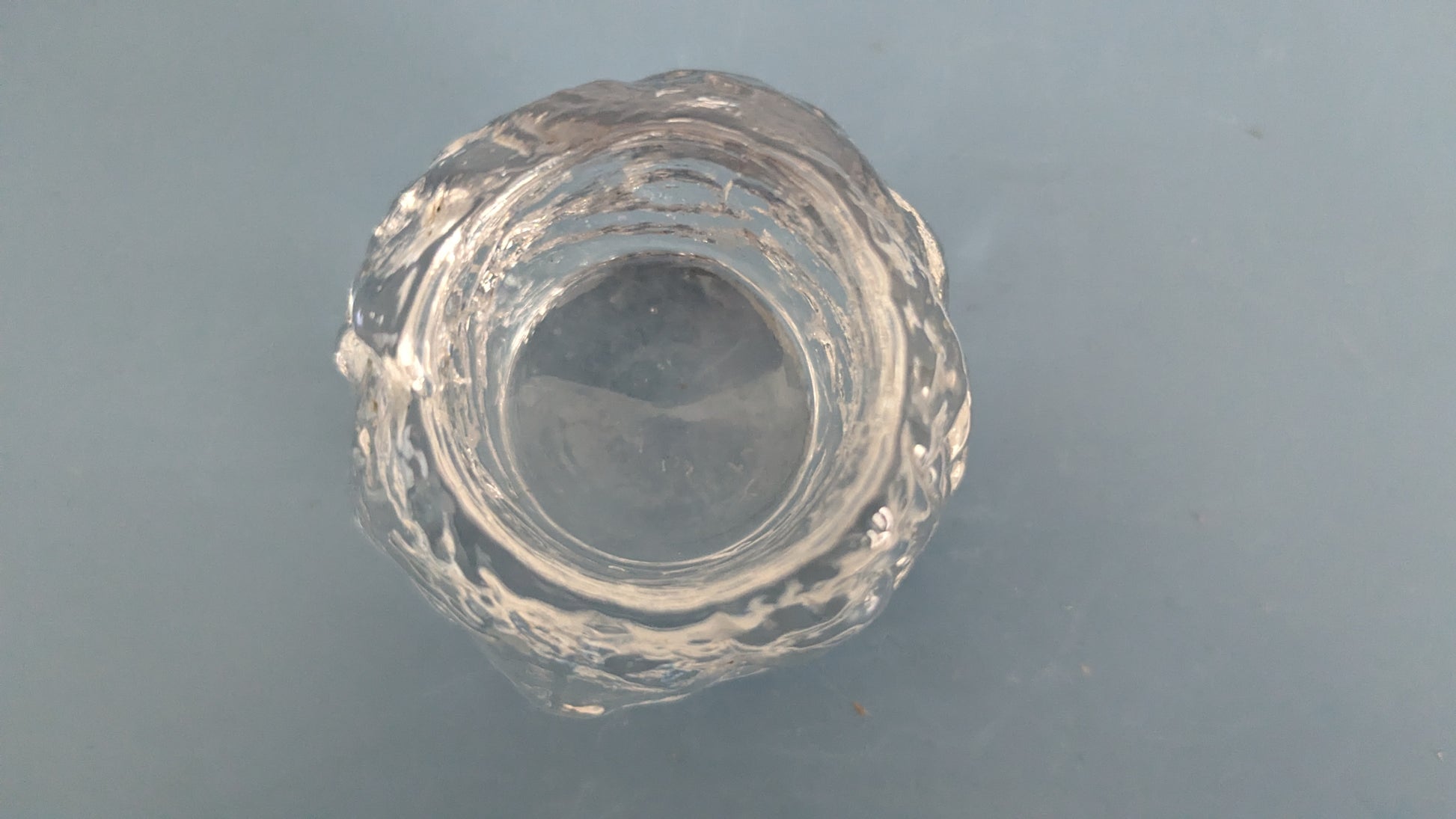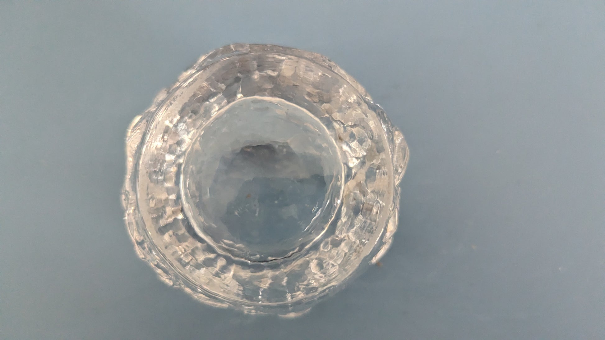 Ei halkeamia. Pohjassa naarmuja siirtelystä. Pohjareunassa kaksi iskemää, joista isompi 5mm kokoinen. Iskemä ja muoto tekevät onneksi sen että iskemiä ei huomaa kuin lähemmällä tarkastelulla.