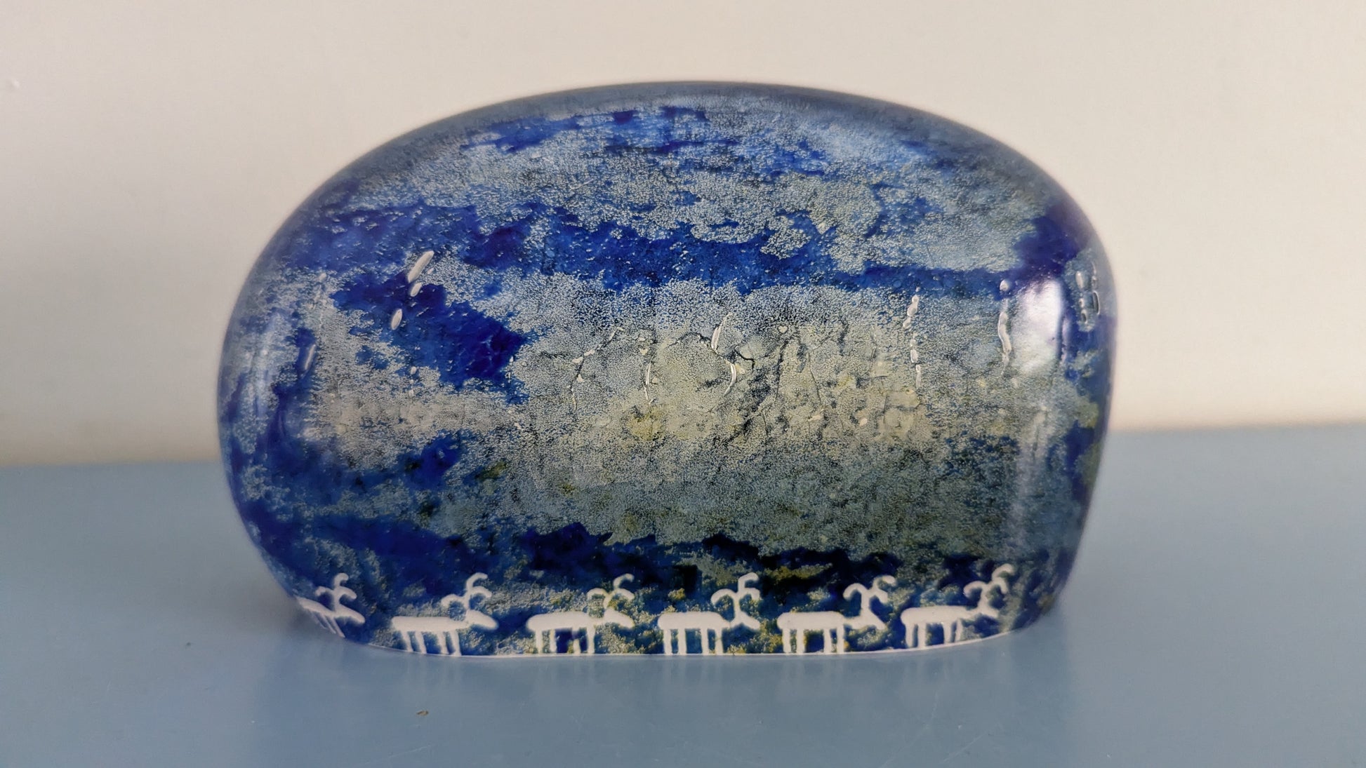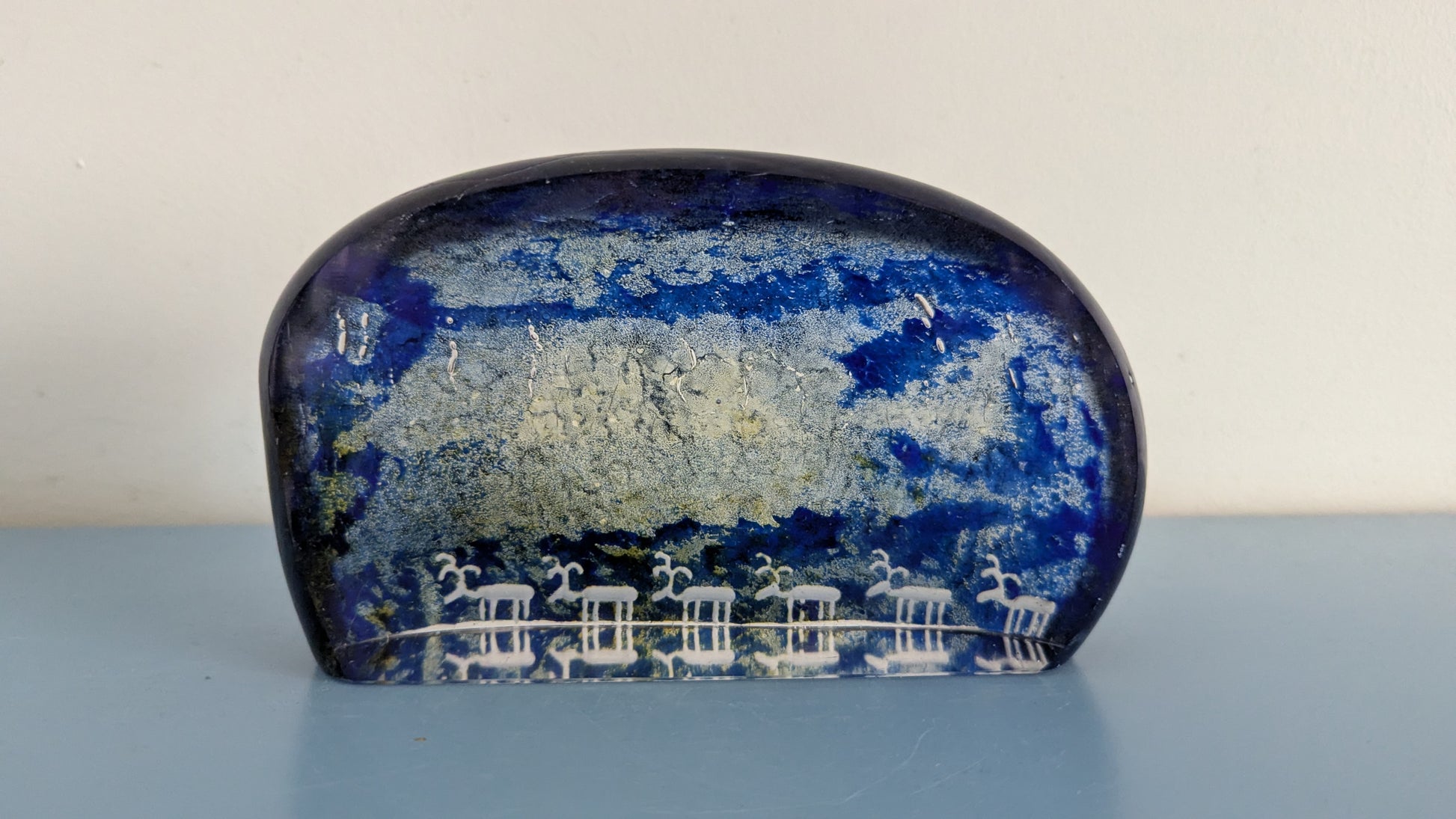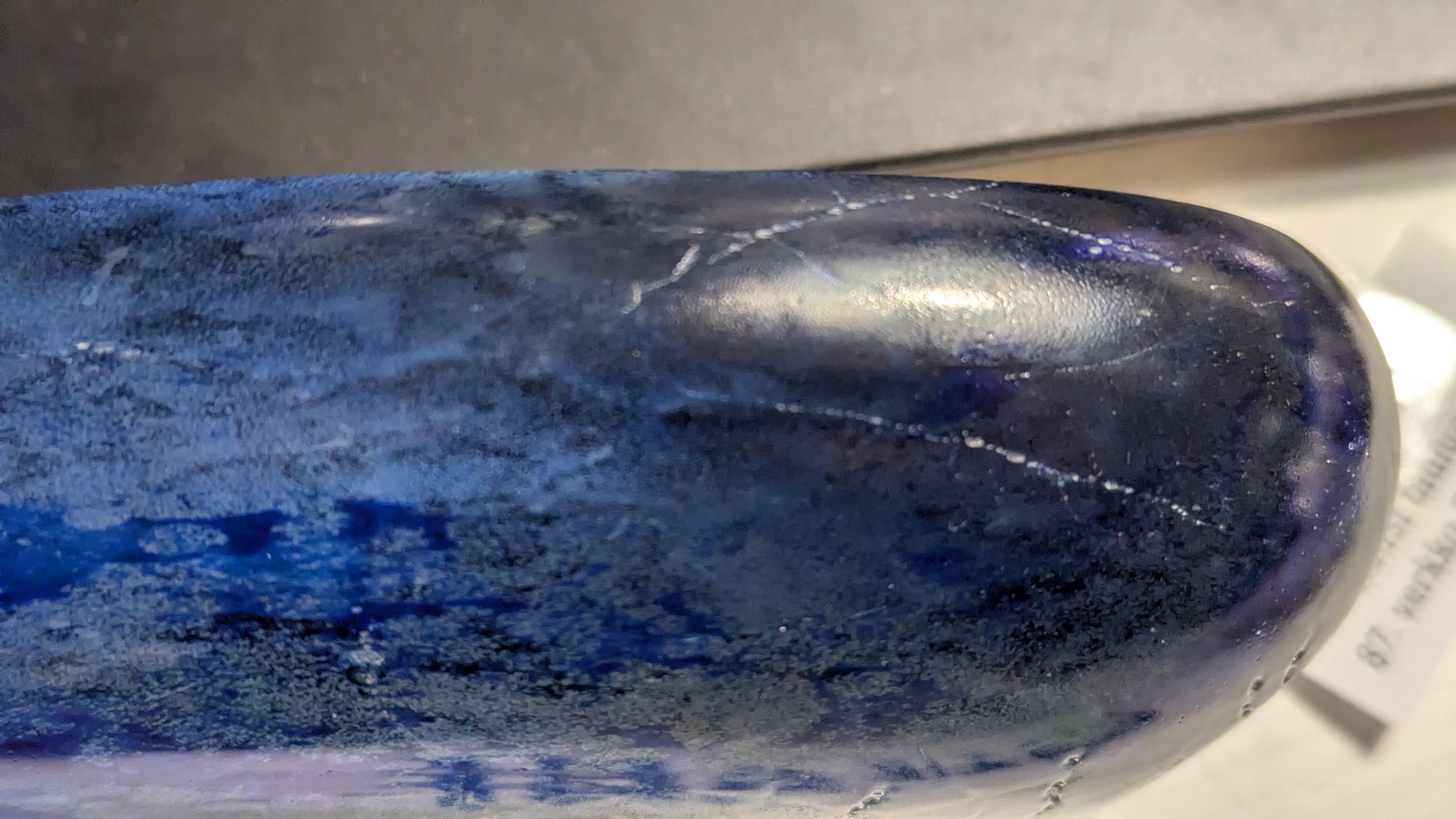 Ei iskemiä tai halkeamia. Pohjassa siirtelystä tullutta naarmua. Usein signeerattu mutta tätä ei. Olisiko syynä ollut se että yläosaan jäänyt viimeisen kuvan mukaiset urat.