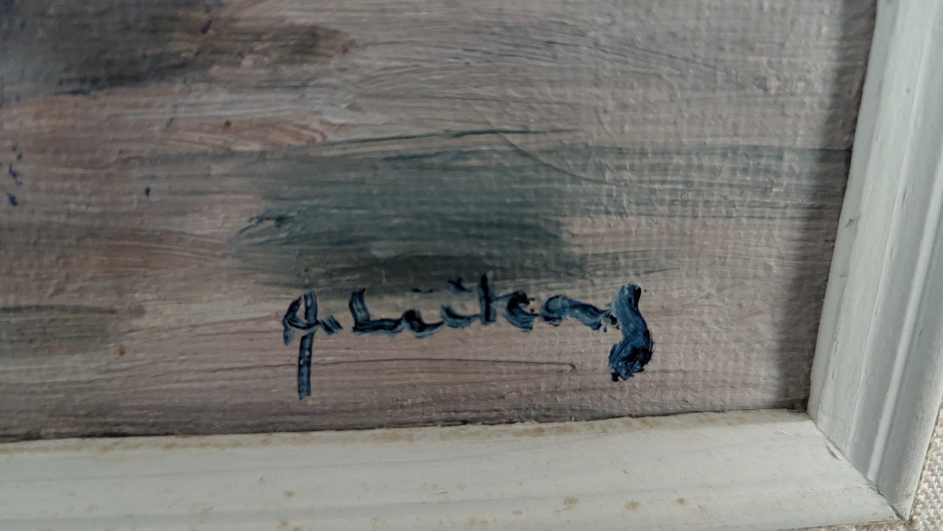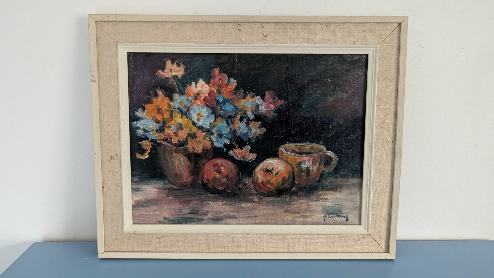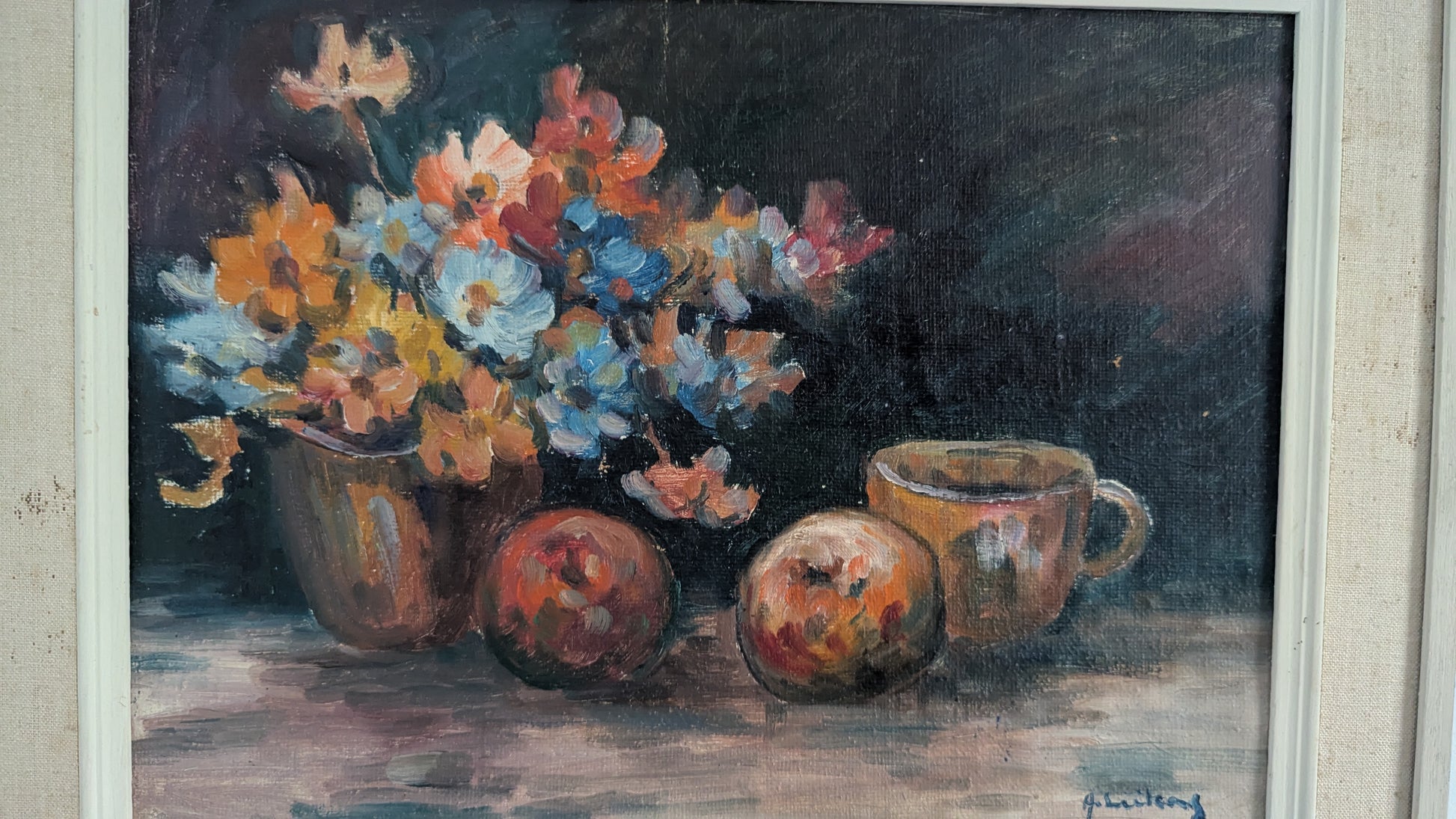 Signeerattu kukka-asetelma aiheinen öljyvärityö.