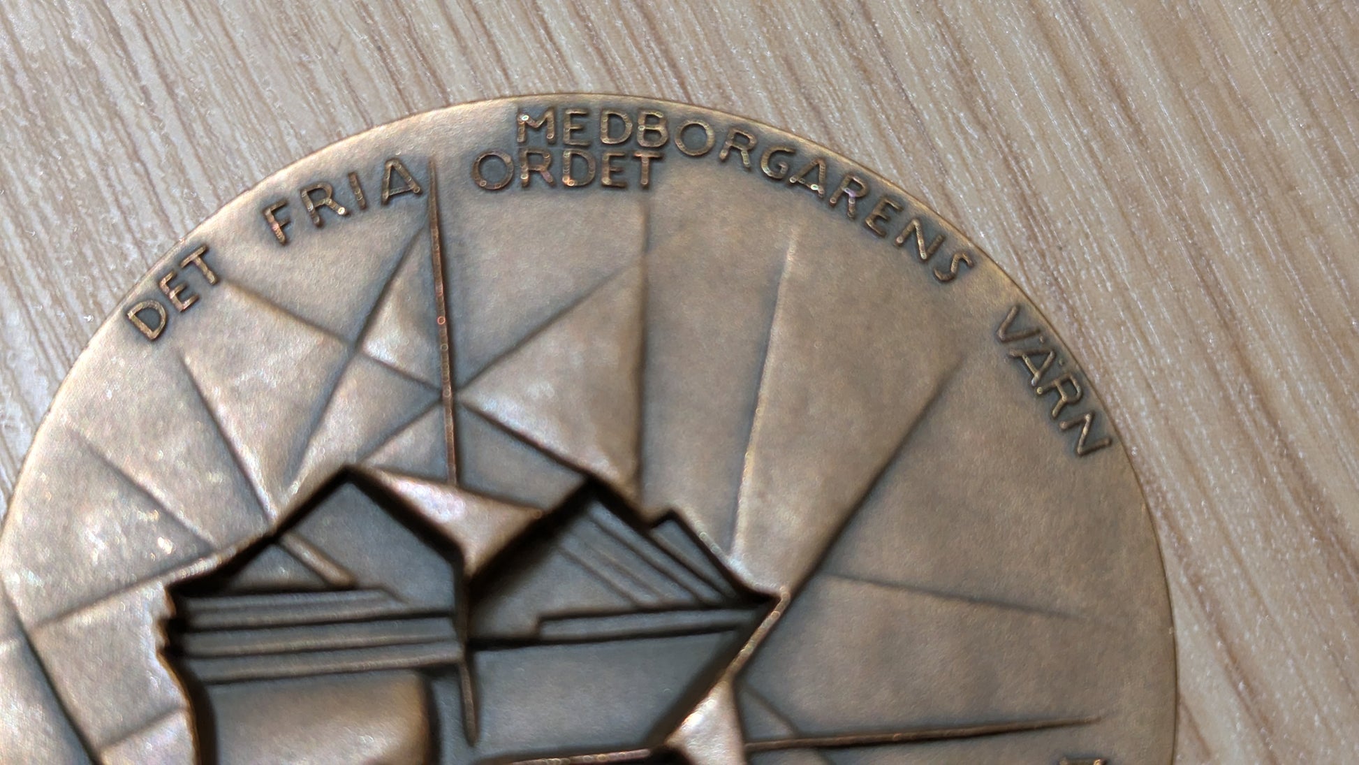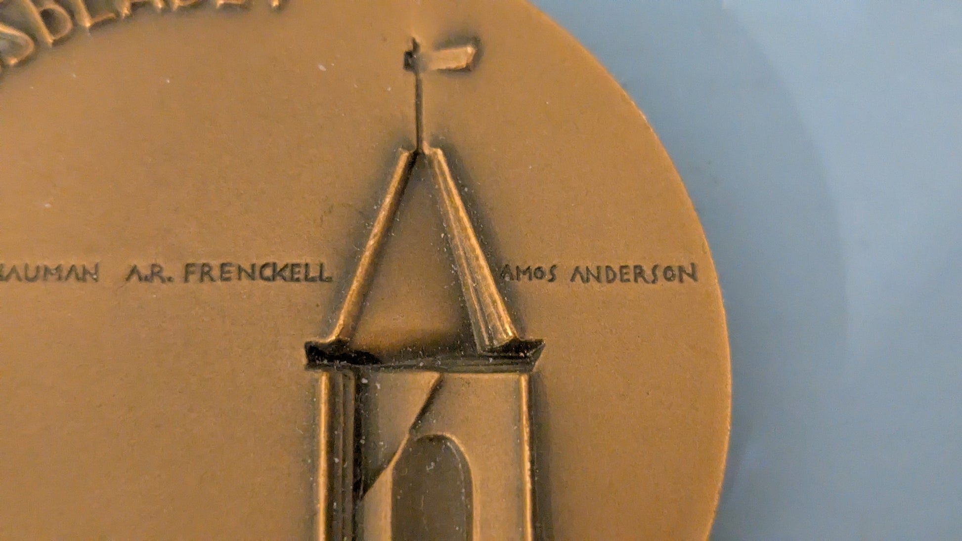 Edessä teksti Hufvudstadsbladet 1864 5-12 1965 ja pienemmällä Aug. Schauman, A.R. Frenckell, Amos Anderson sekä Johan Finnen signeeraus. Taustapuolella teksti Medborgarens Värn Det Fria Ordet. Lappeella teksti Kultateollisuus.