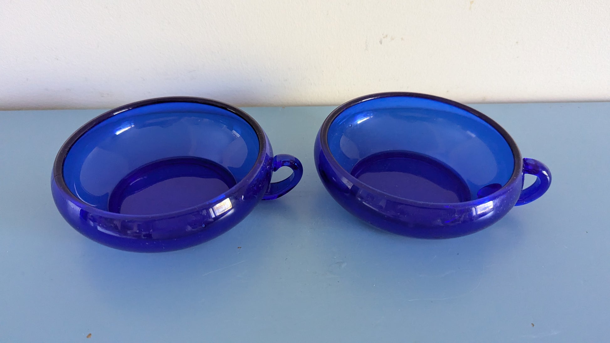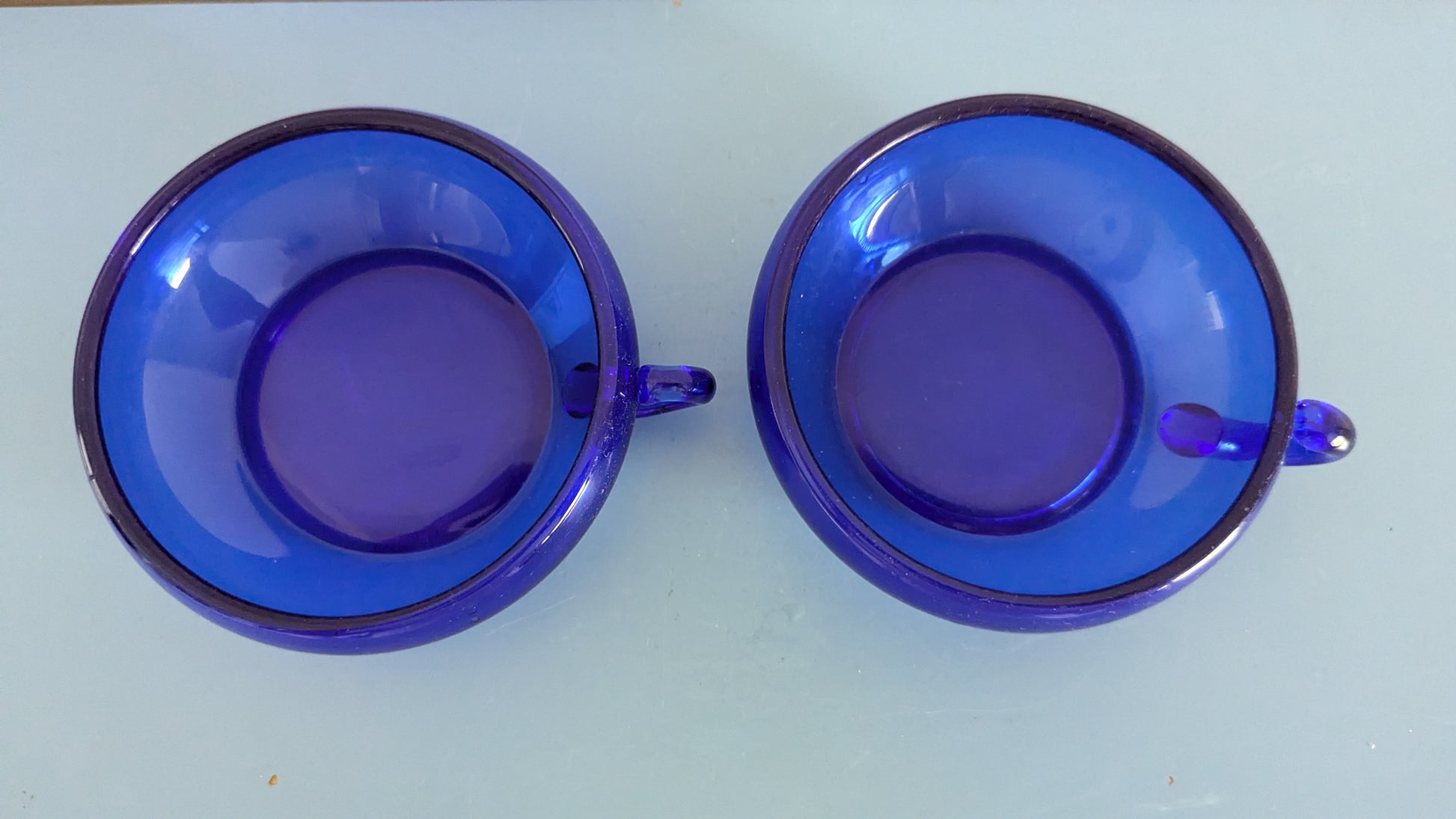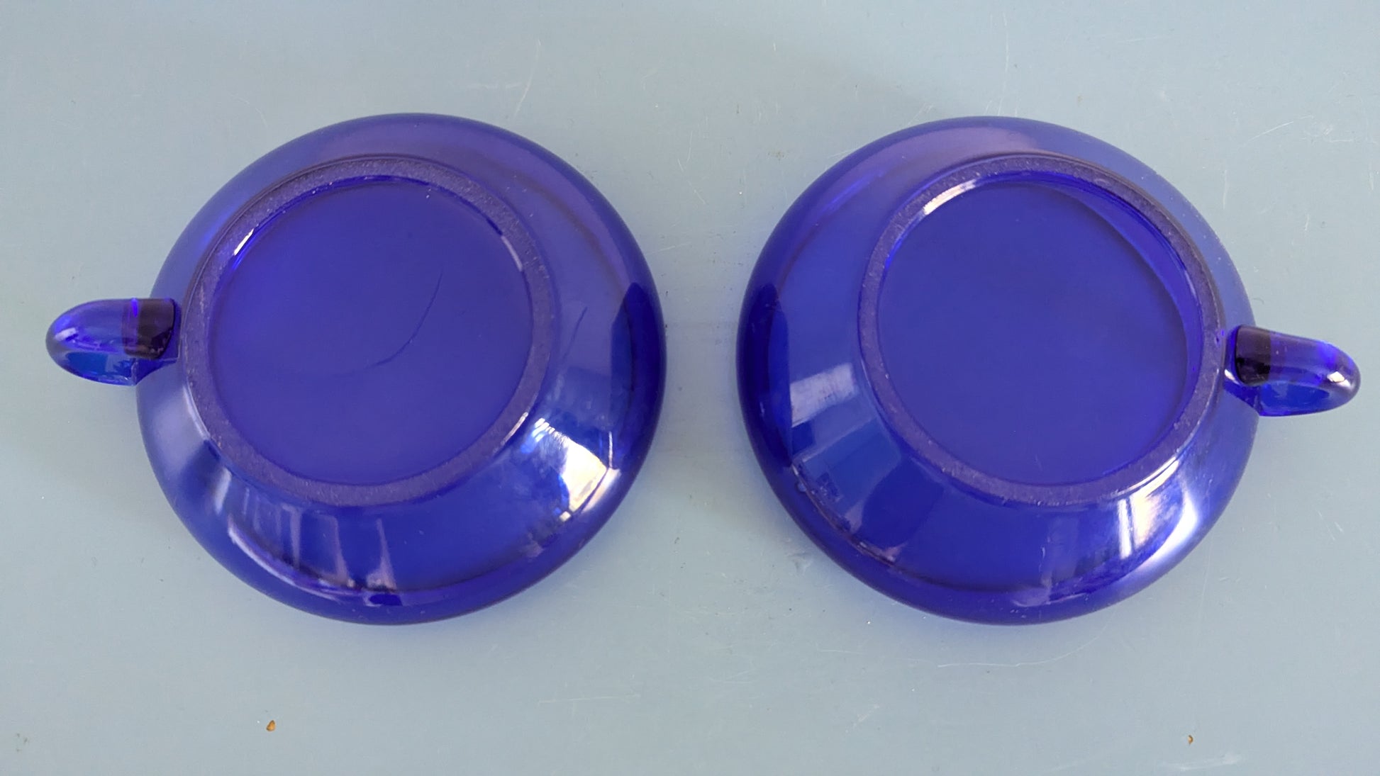 Ei iskemiä tai halkeamia. Käyttökulumaa ei ole tai se on minimaalista. Toisen kulhon lasimassan sisälle jäänyt pieni ilmakupla. Toisessa pieni tekovika eli pohjapuolelle jäänyt ura joka tuntuu sormella. Ei ole halkeama. Viat näkyvät kahdessa viimeisessä kuvassa.