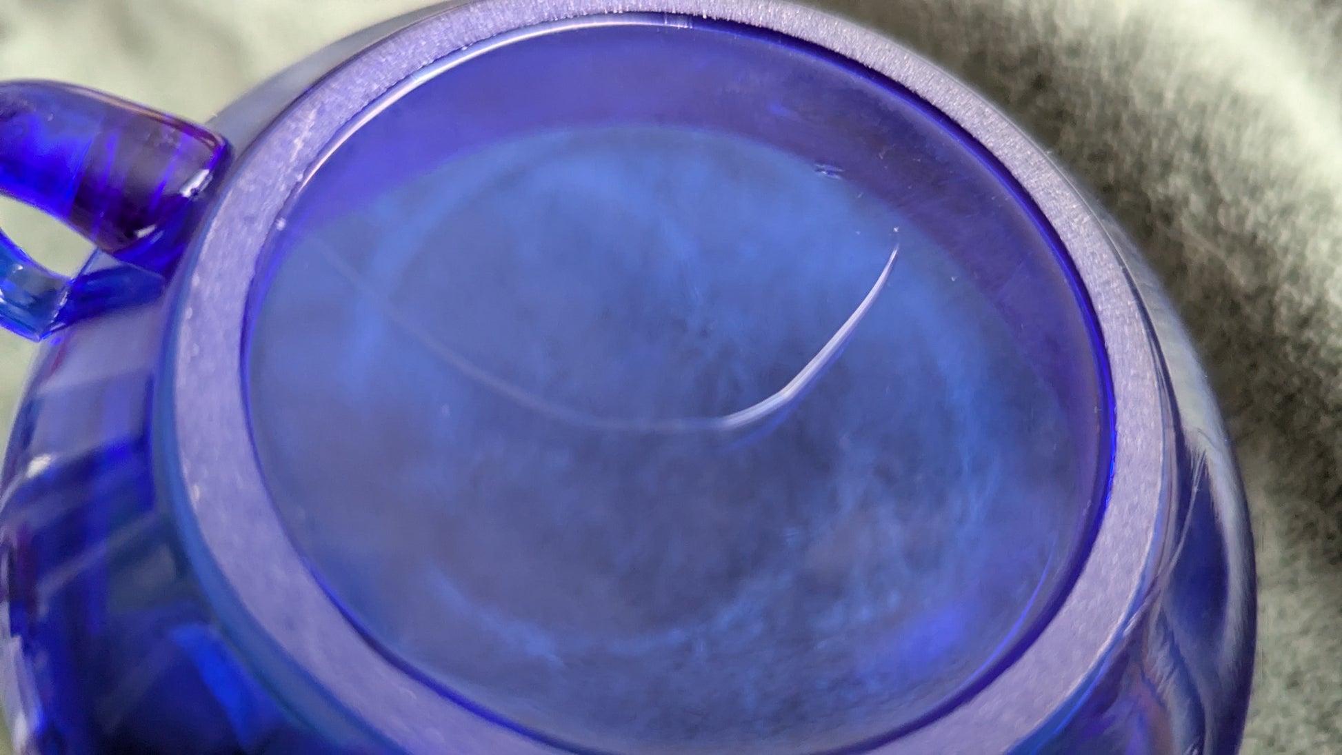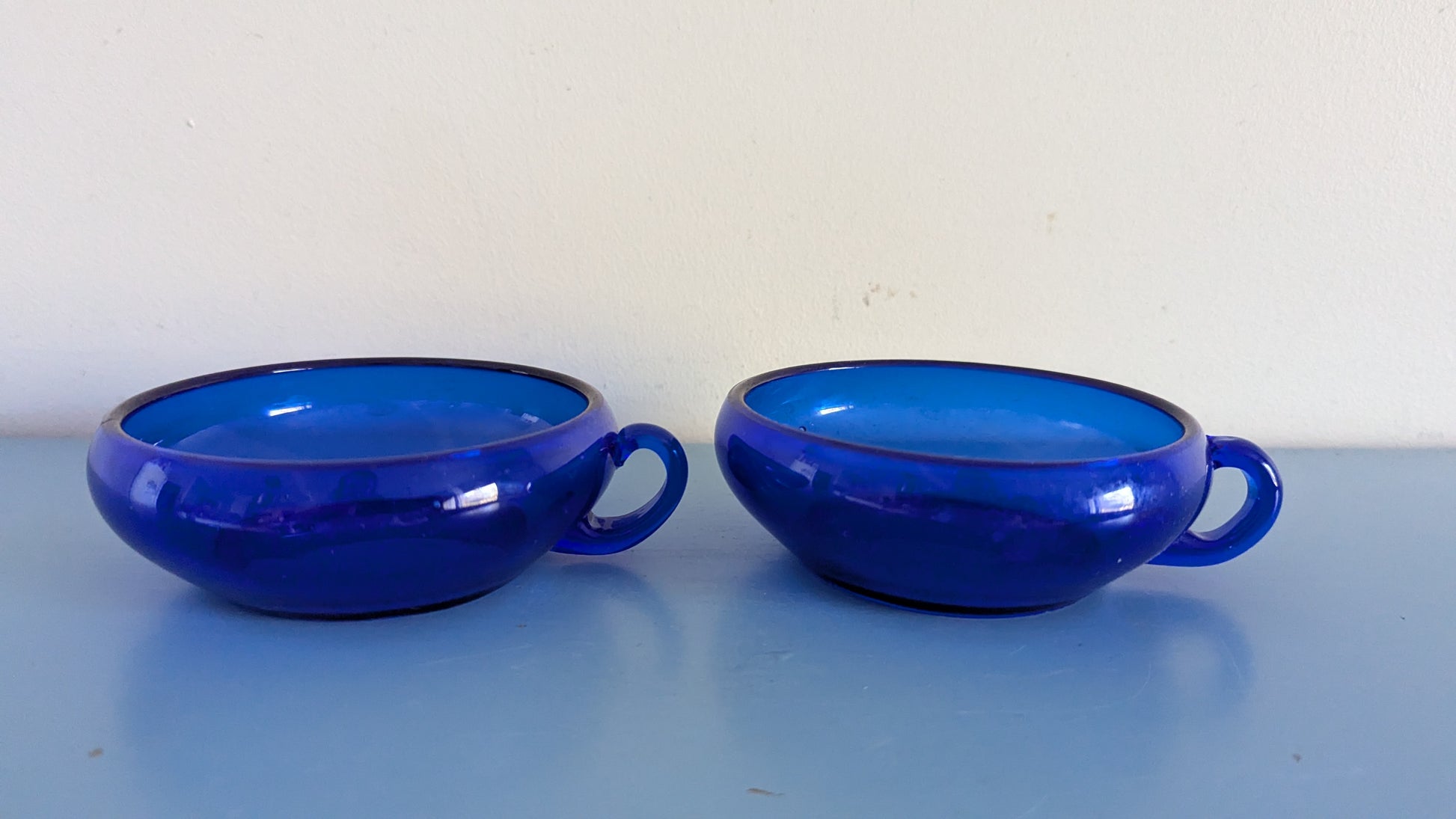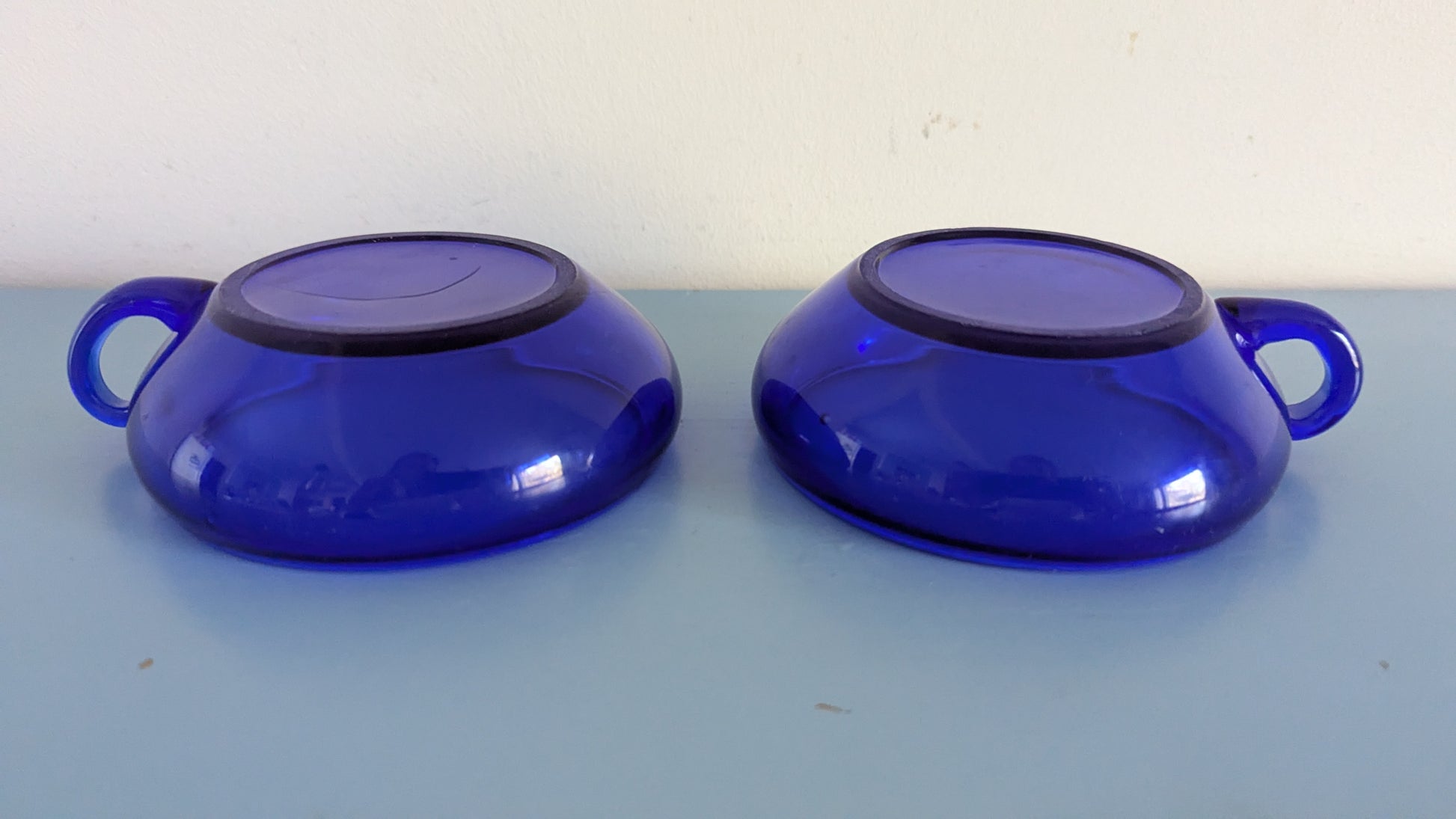 Ei iskemiä tai halkeamia. Käyttökulumaa ei ole tai se on minimaalista. Toisen kulhon lasimassan sisälle jäänyt pieni ilmakupla. Toisessa pieni tekovika eli pohjapuolelle jäänyt ura joka tuntuu sormella. Ei ole halkeama. Viat näkyvät kahdessa viimeisessä kuvassa.